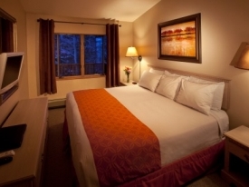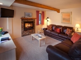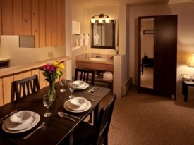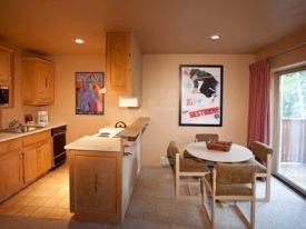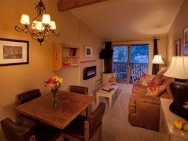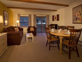One Bedroom Condo- Roughly 500 square feet. Features one master bedroom with either a king or two twin beds. All one bedrooms offer a full bathroom with dual vanities, a dining area and a fully equipped kitchen. Living rooms boast cozy seating, a sleeper sofa and a fireplace with balcony access and views of the slopes. Also offers a telephone, satellite television and wireless internet. Sleeps 4