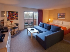 Deluxe One Bedroom Condo- At 575 square feet, these offer a master bedroom with two queen beds and a vanity sink, along with a full bathroom. Living rooms boast plush sleeper sofas and a fireplace with sliding glass doors leading to the patio. Enjoy a full kitchen and cozy dining area, along with a telephone, satellite television, DVD player and wireless internet. Sleeps 6