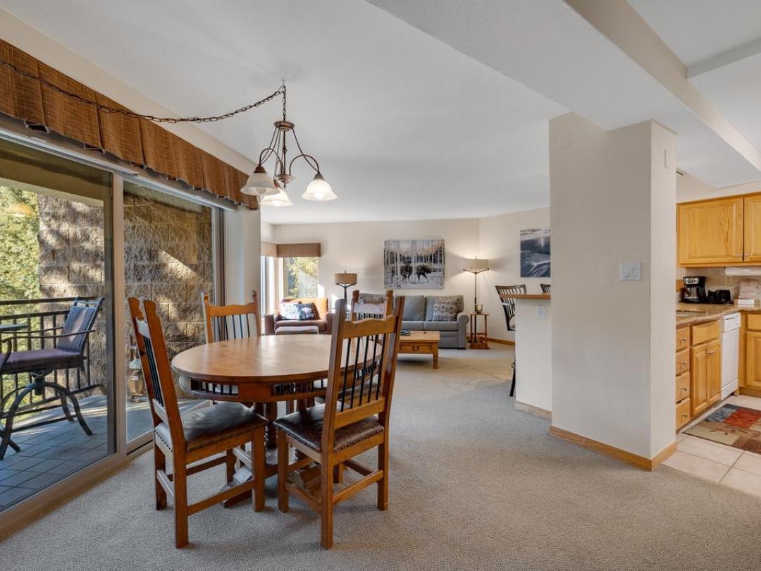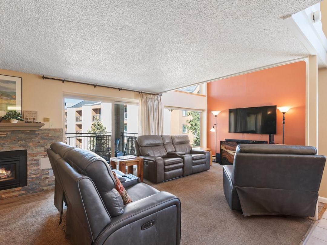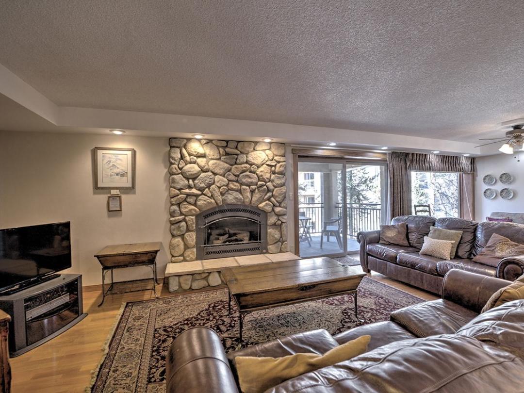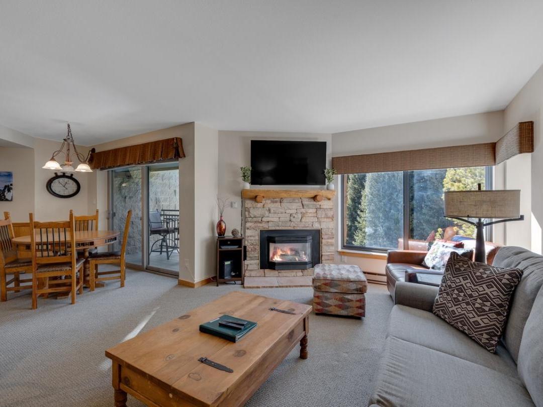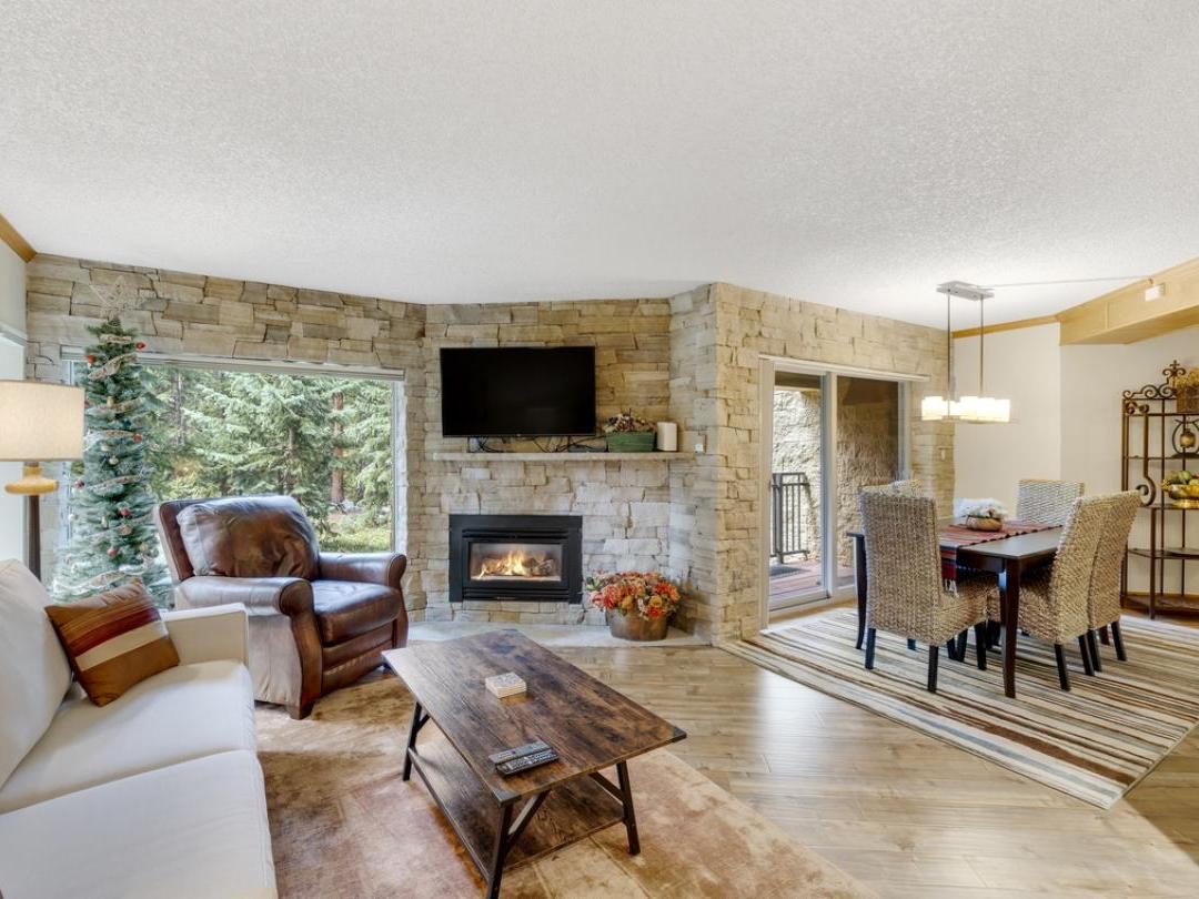 Each uniquely furnished condo features an open-concept layout with a cozy living room, fireplace, and access to a private balcony—perfect for unwinding after a day of adventure. Fully equipped kitchens and adjacent dining areas provide everything you need to prepare and enjoy home-cooked meals throughout your stay.