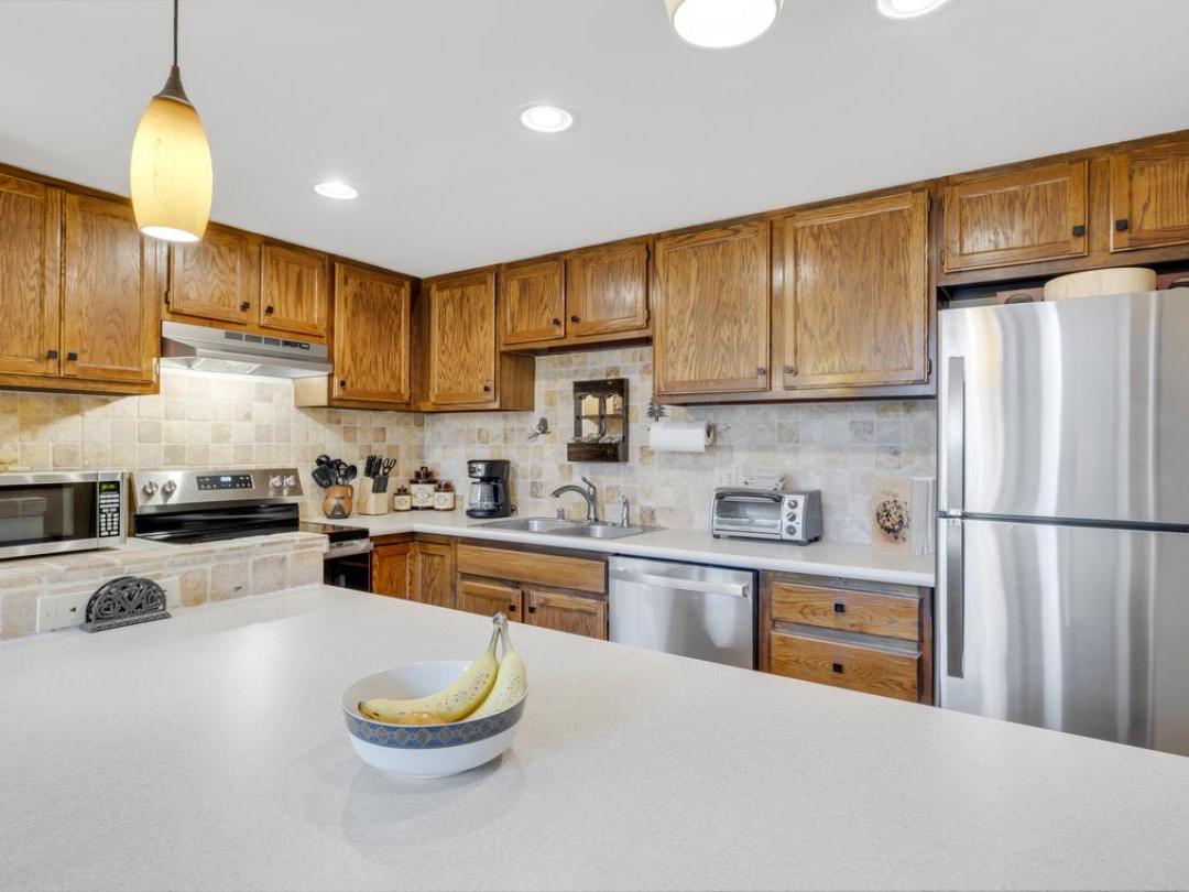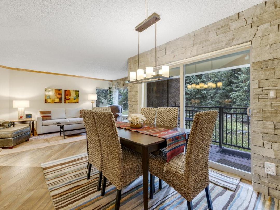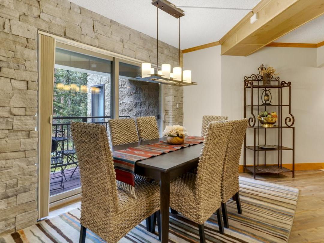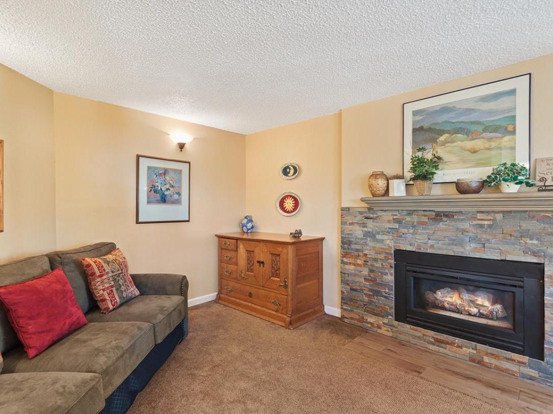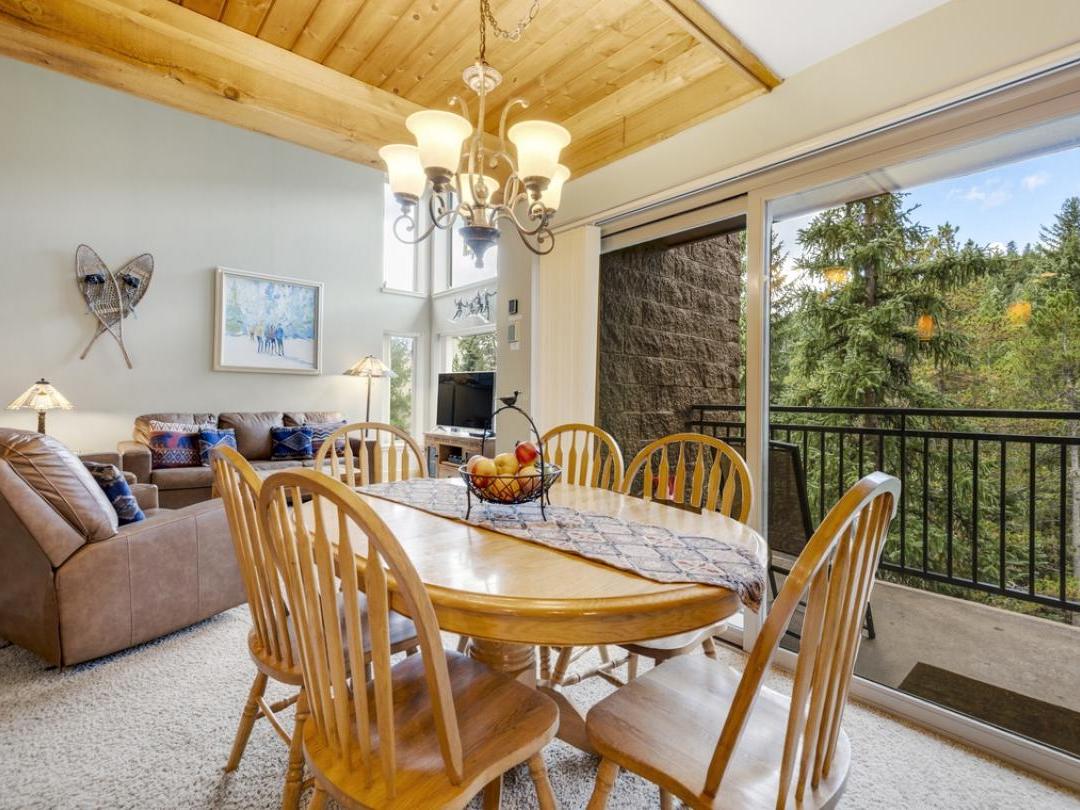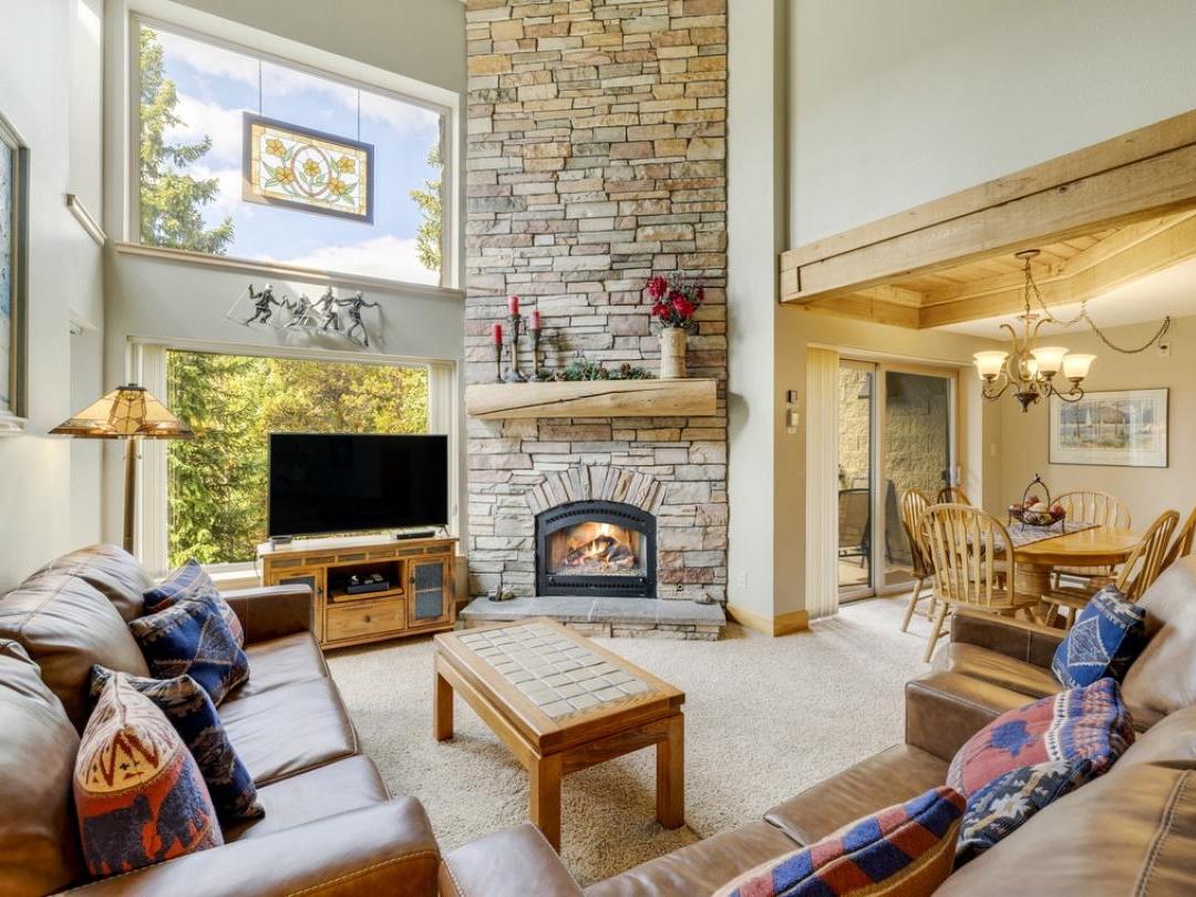 Each uniquely furnished condo features an open-concept layout with a cozy living room, fireplace, and access to a private balcony—perfect for unwinding after a day of adventure. Fully equipped kitchens and adjacent dining areas provide everything you need to prepare and enjoy home-cooked meals throughout your stay.
