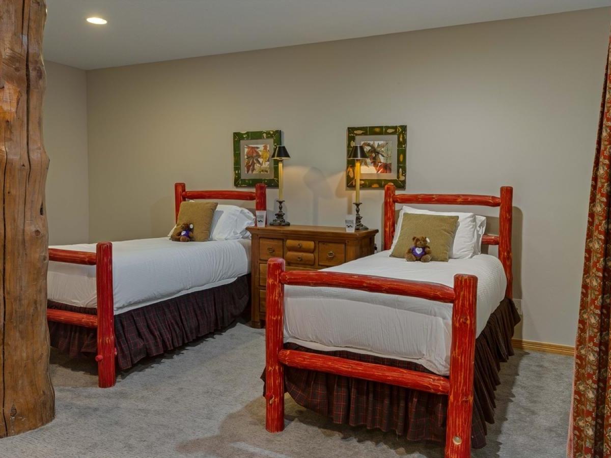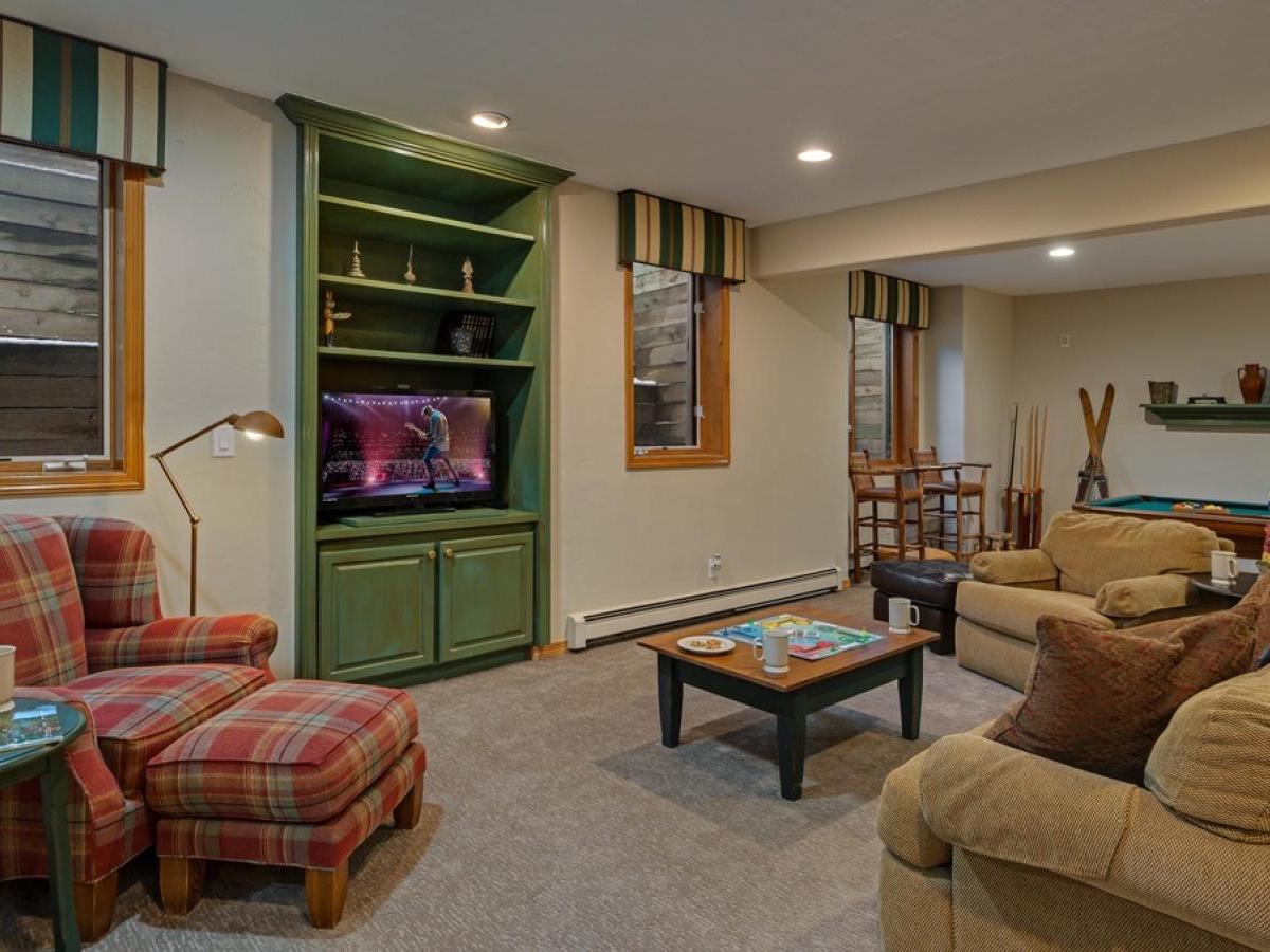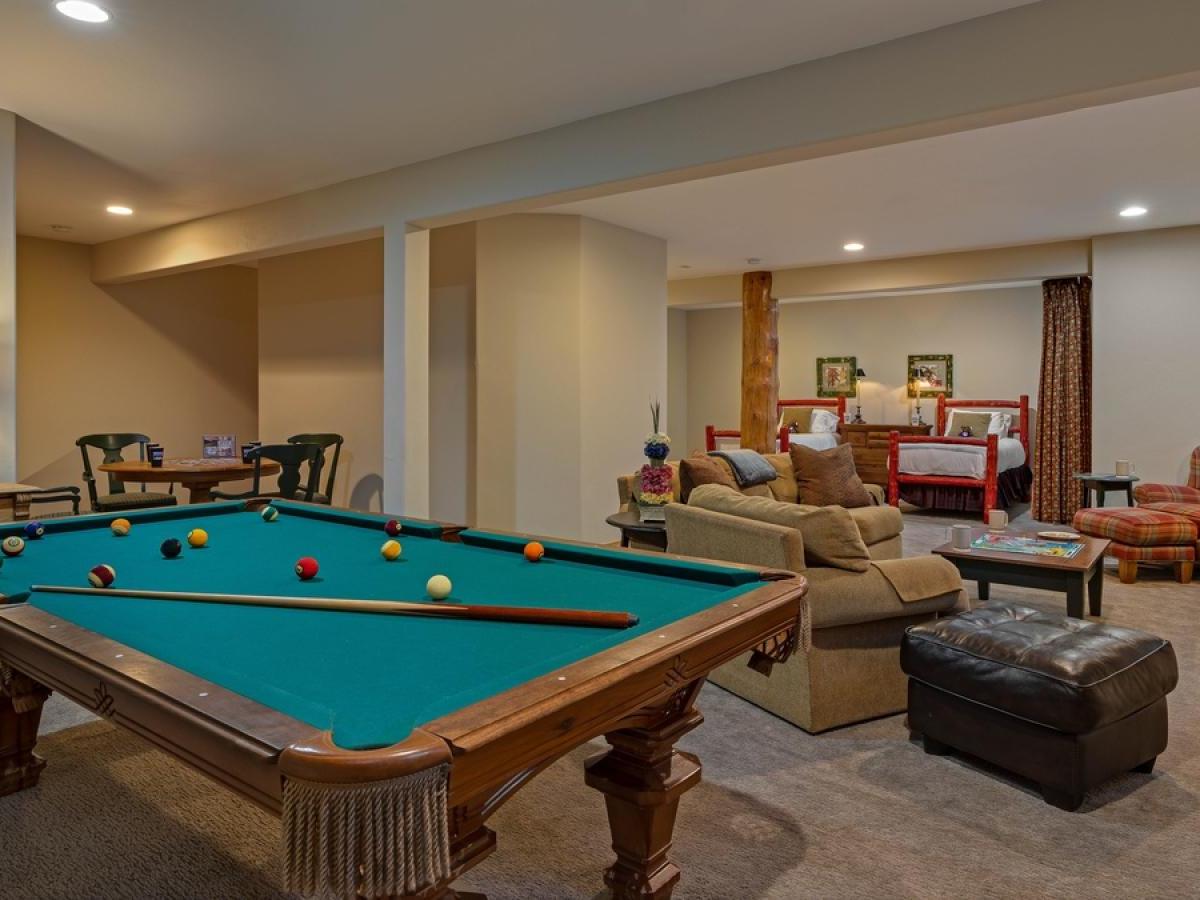 The lower level offers a spacious family room with a flat-screen TV, ample sectional seating, and a pool table. Doubling as the fourth bedroom, this space features two Twin beds that can be curtained for privacy, and there's a full bathroom with a walk-in shower.