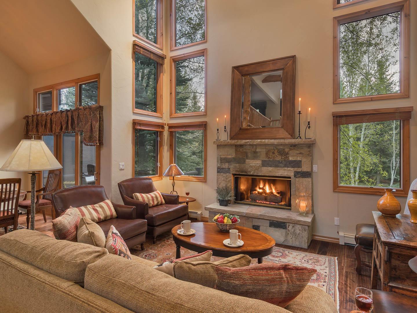 Guests enter into the great room, where a stone gas fireplace, vaulted ceilings, and comfortable furnishings create a welcoming space to unwind. The open floor plan flows into a dining area with seating for six and patio access with a gas grill, perfect for outdoor dining.