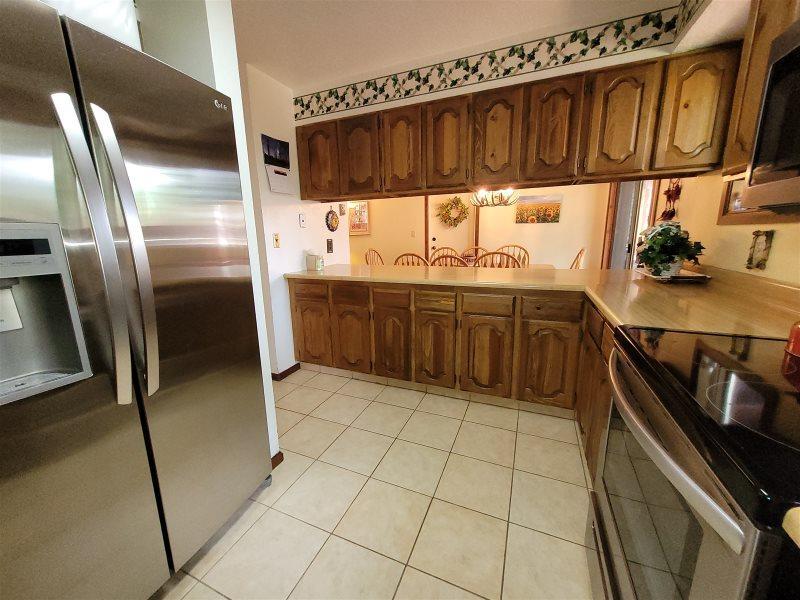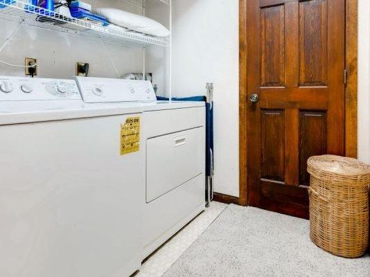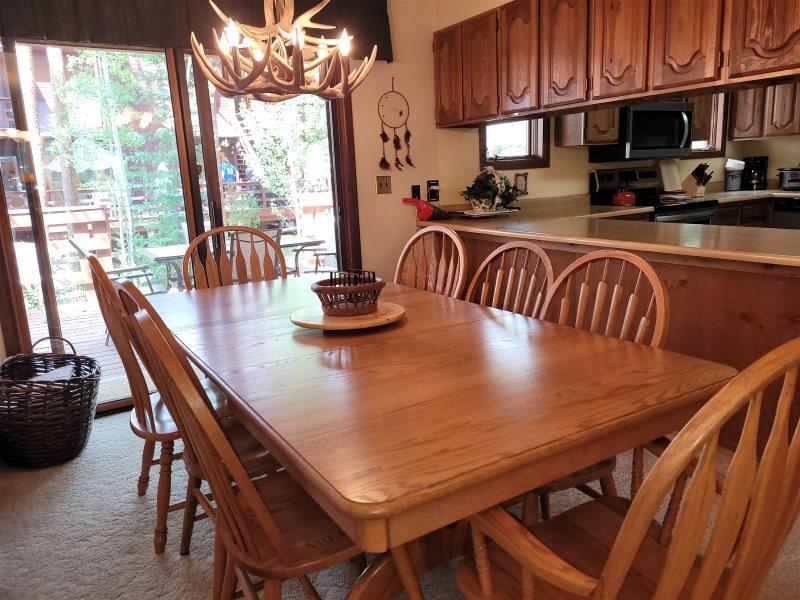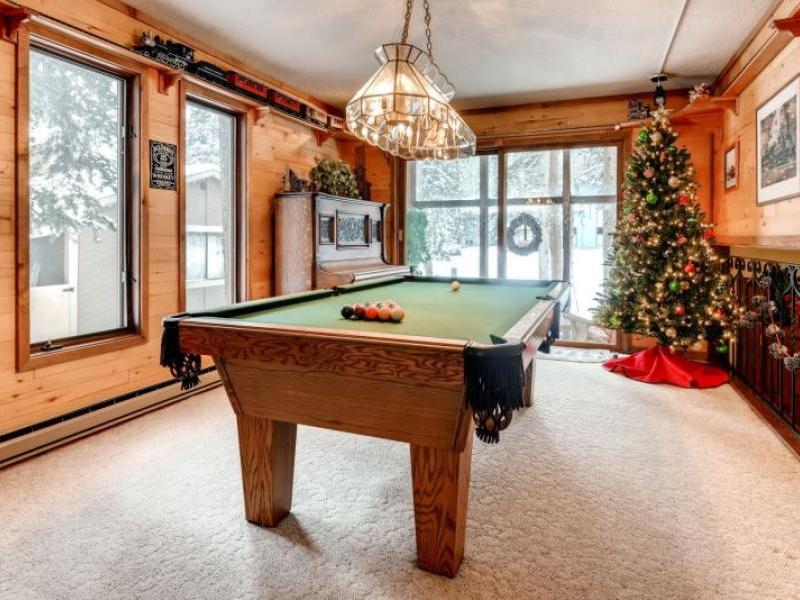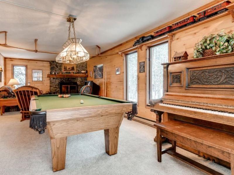 Kick back in the spacious and sunny living room, which boasts several sofas, a few recliners and a massive flat screen television. In the neighboring kitchen, you’ll find anything you need to create home-cooked meals, with an adjacent dining area featuring a large table that seats up to 10 guests. Up one level, the inviting living room is the perfect place to gather and enjoy some quality vacation time together. There’s a plush sofa, a wood-burning fireplace, and a television on one side, with a pool table and a piano on the other. A charming sunroom sits on the south side of the home, with two chairs and a woodsy view. Head out to the large deck for a soak in the private, soothing hot tub or perhaps the relaxing, heat of the sauna is more what your body needs at the end of a wonderful vacation day.