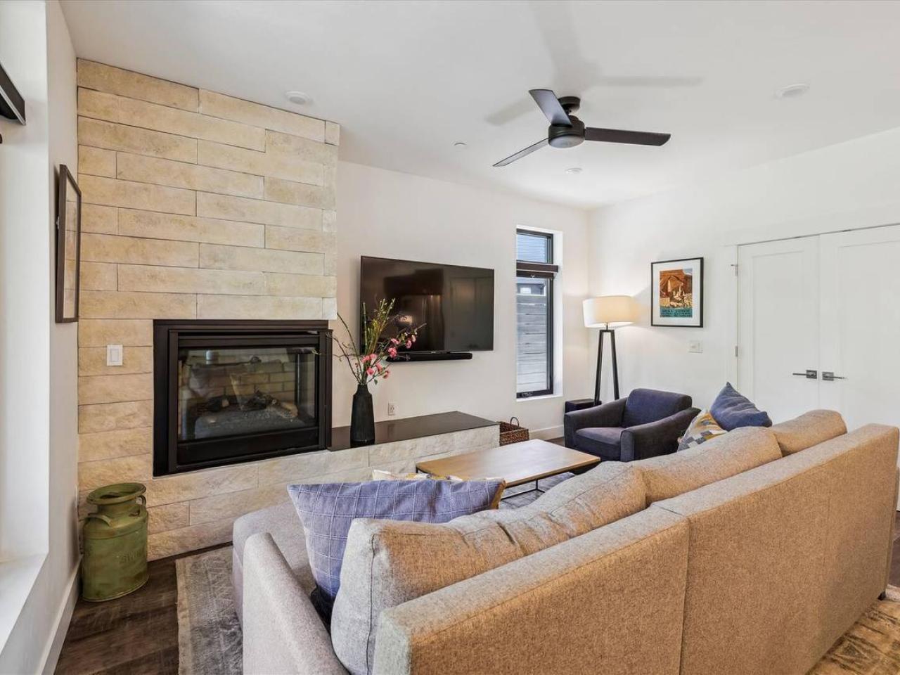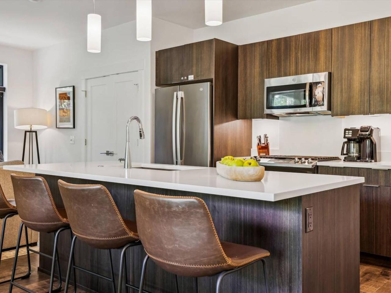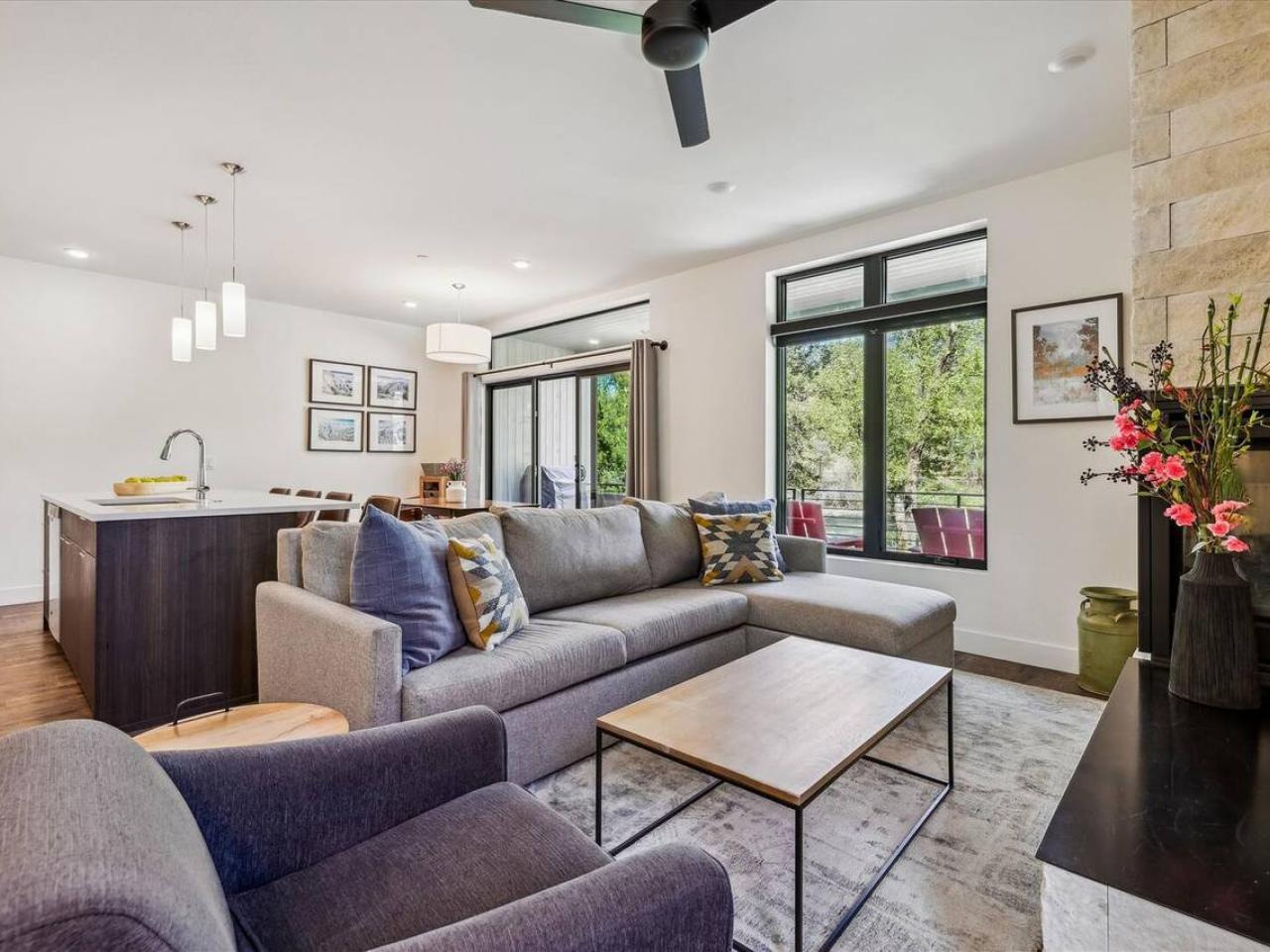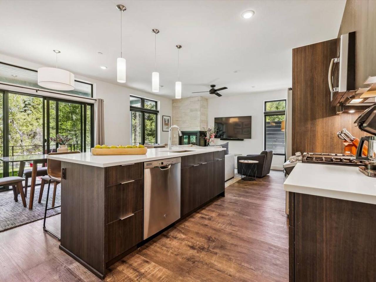 Cozy and inviting, the living area of this 2 bedroom condominium with 2 bathrooms is centered around a gas fireplace and wall-mounted television. Equipped with stainless steel appliances including a gas range, the kitchen is open to the living space and includes a breakfast bar with seating for 4 guests. Next to the island is a dining table with seating for 4 guests and is framed by a wall of glass with doors leading out to the deck.