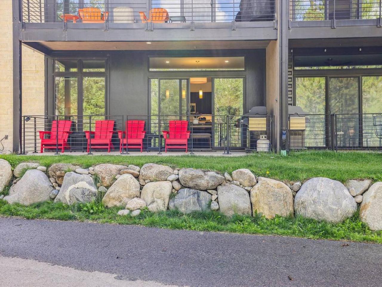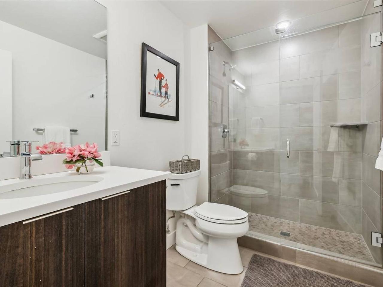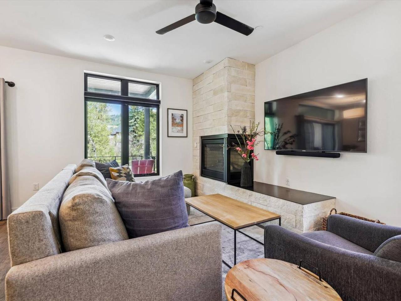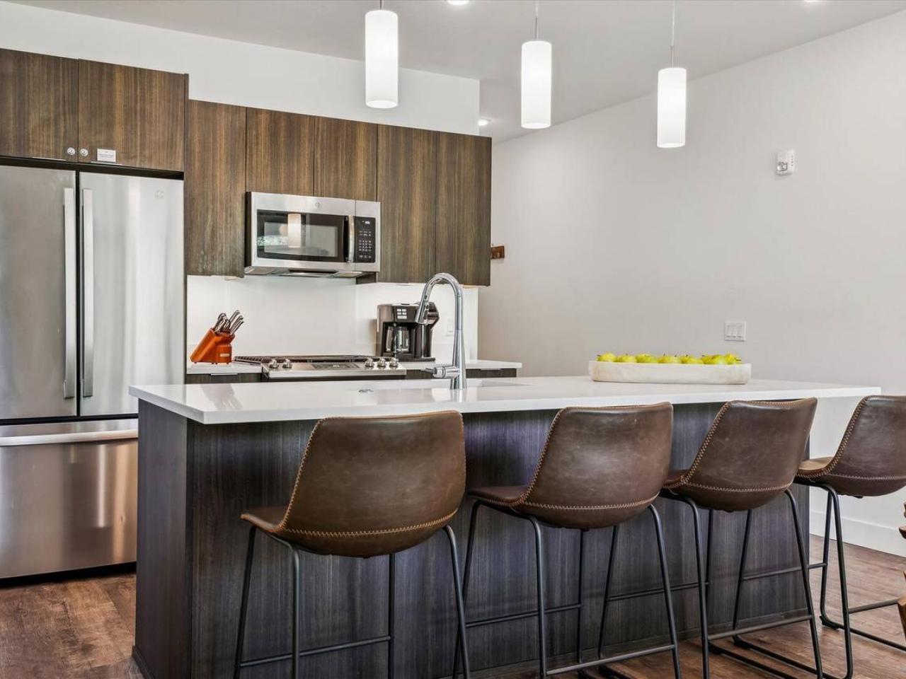 Cozy and inviting, the living area of this 2 bedroom condominium with 2 bathrooms is centered around a gas fireplace and wall-mounted television. Equipped with stainless steel appliances including a gas range, the kitchen is open to the living space and includes a breakfast bar with seating for 4 guests. Next to the island is a dining table with seating for 4 guests and is framed by a wall of glass with doors leading out to the deck.