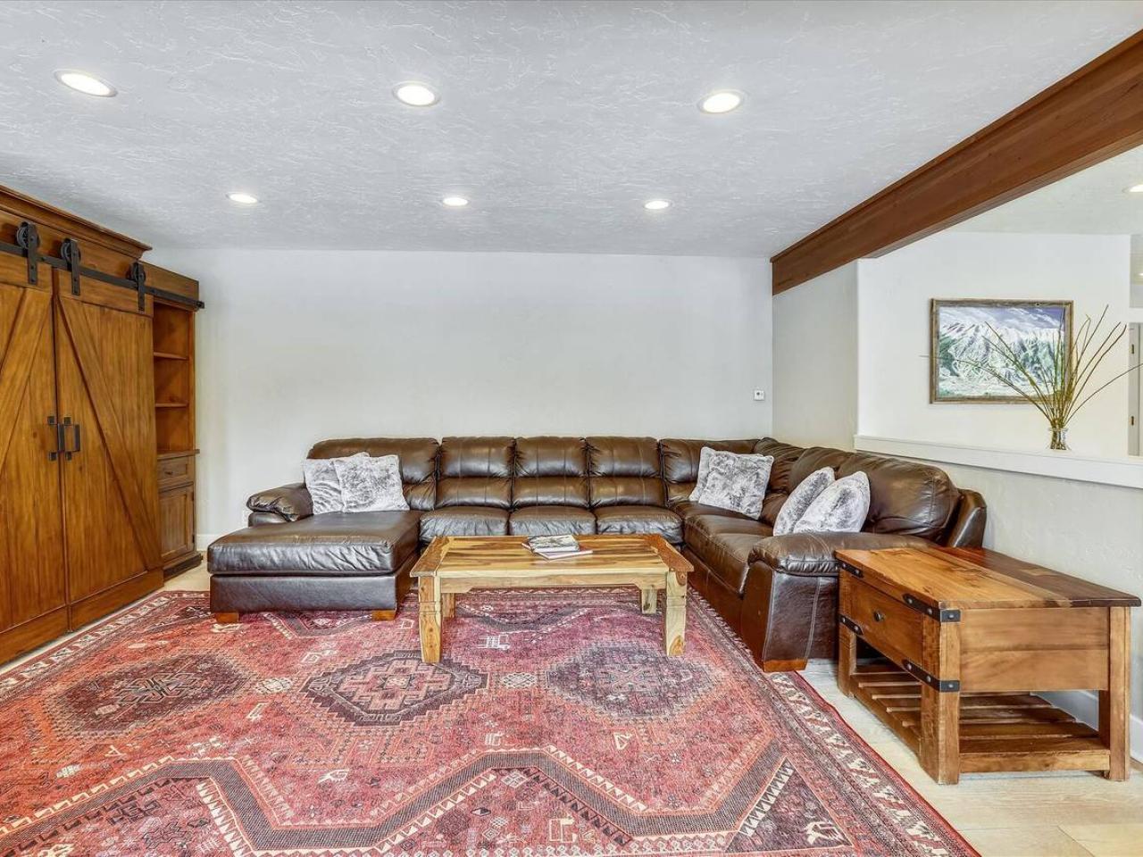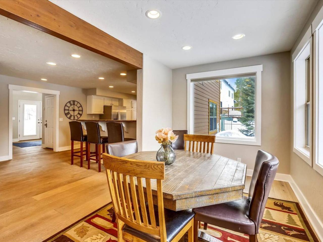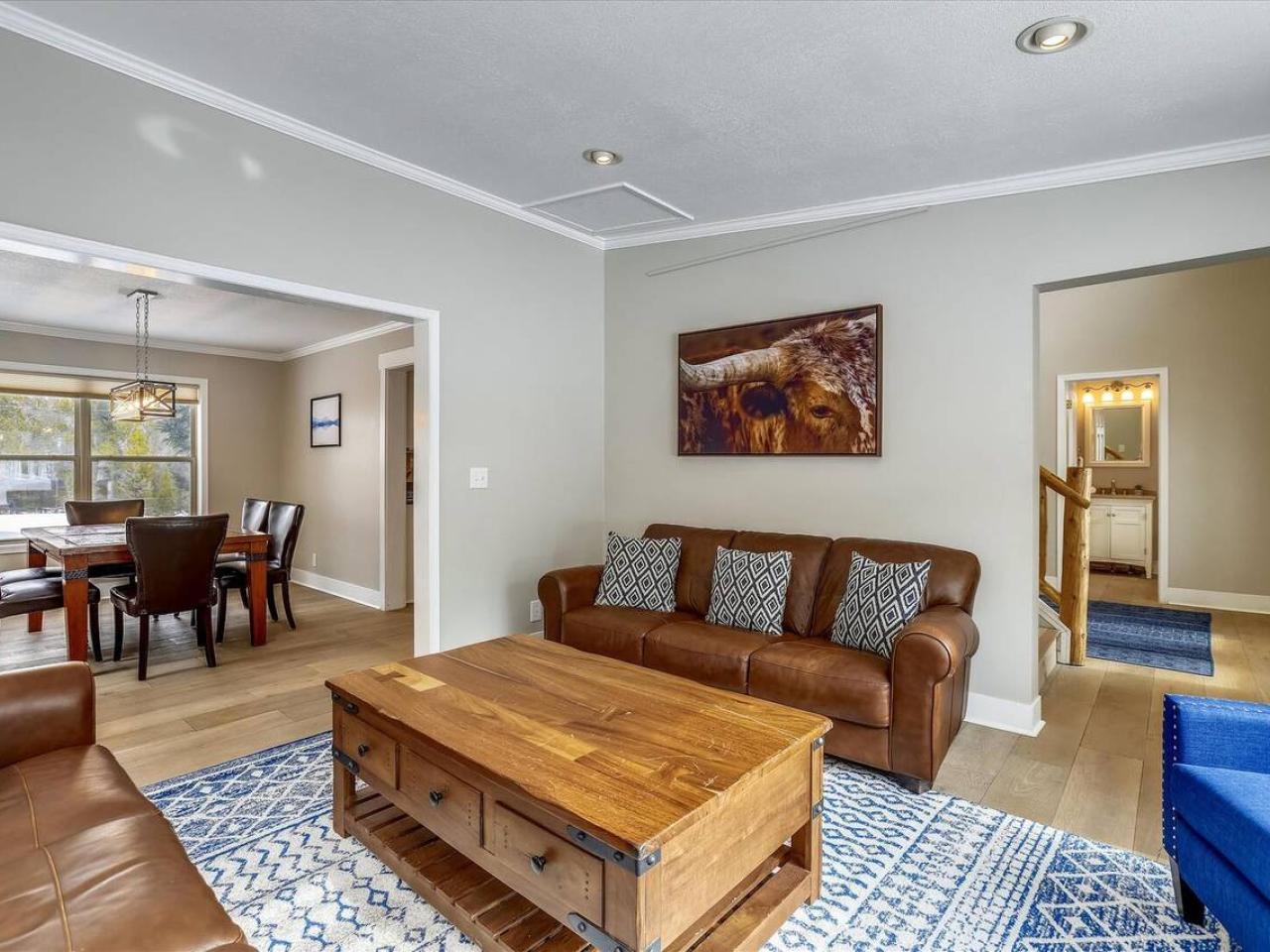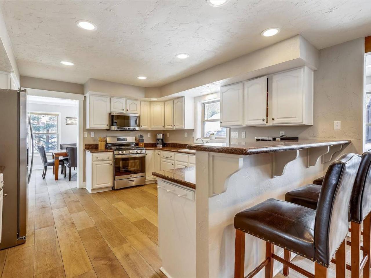 Blending an open layout with distinctive spaces, the main level of this 4 bedroom, 4.5 bathroom mountain retreat features a cozy living room offering a large leather sofa with a television set inside a barn-door accessed wall unit and an adjacent bar. Step out through glass doors in the living room to the sprawling back deck equipped with a barbecue grill and private hot tub. Off of the living room is a breakfast nook seating 5 guests, a kitchen bar accommodating 3 guests and the contemporary kitchen boasting granite countertops and stainless steel appliances.