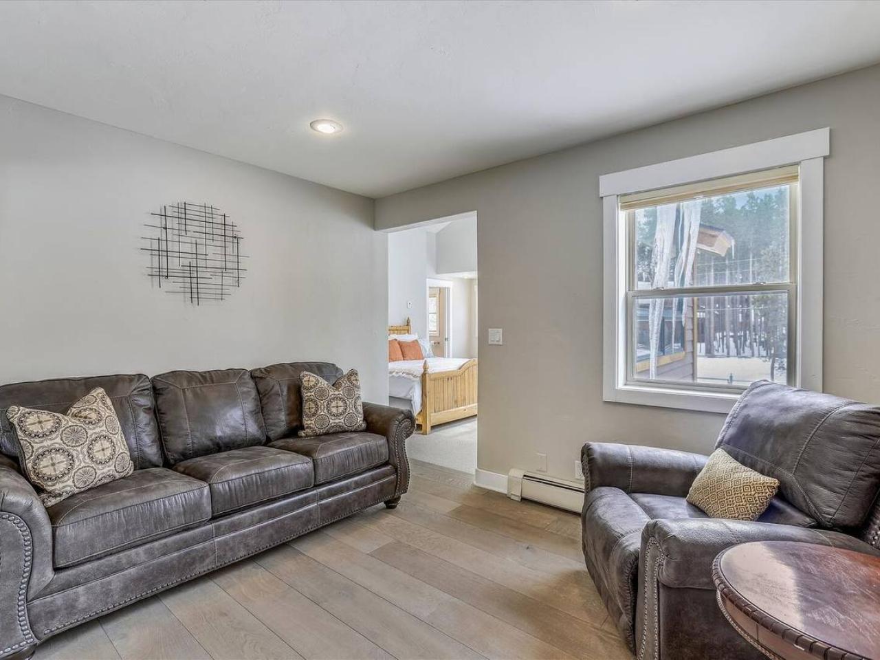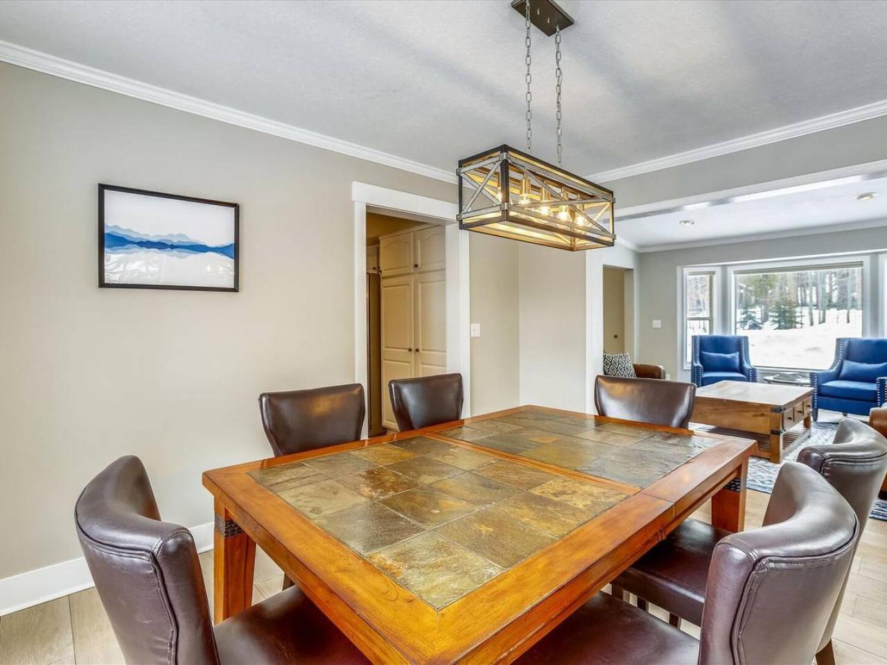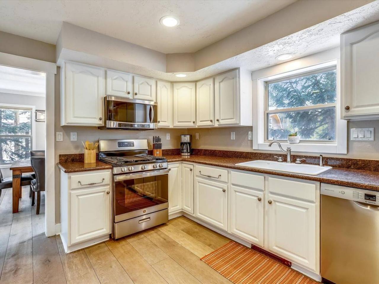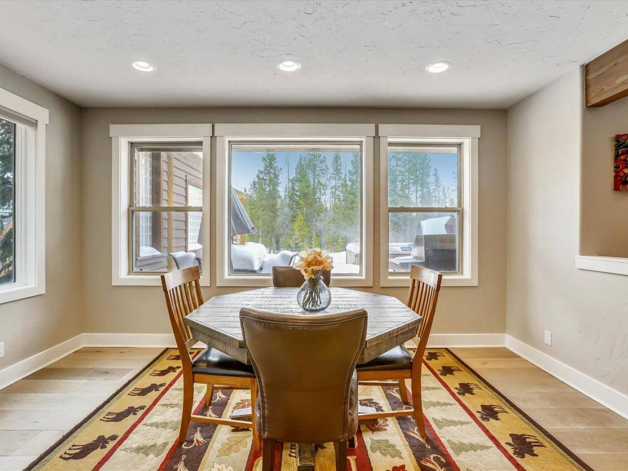 Blending an open layout with distinctive spaces, the main level of this 4 bedroom, 4.5 bathroom mountain retreat features a cozy living room offering a large leather sofa with a television set inside a barn-door accessed wall unit and an adjacent bar. Step out through glass doors in the living room to the sprawling back deck equipped with a barbecue grill and private hot tub. Off of the living room is a breakfast nook seating 5 guests, a kitchen bar accommodating 3 guests and the contemporary kitchen boasting granite countertops and stainless steel appliances.