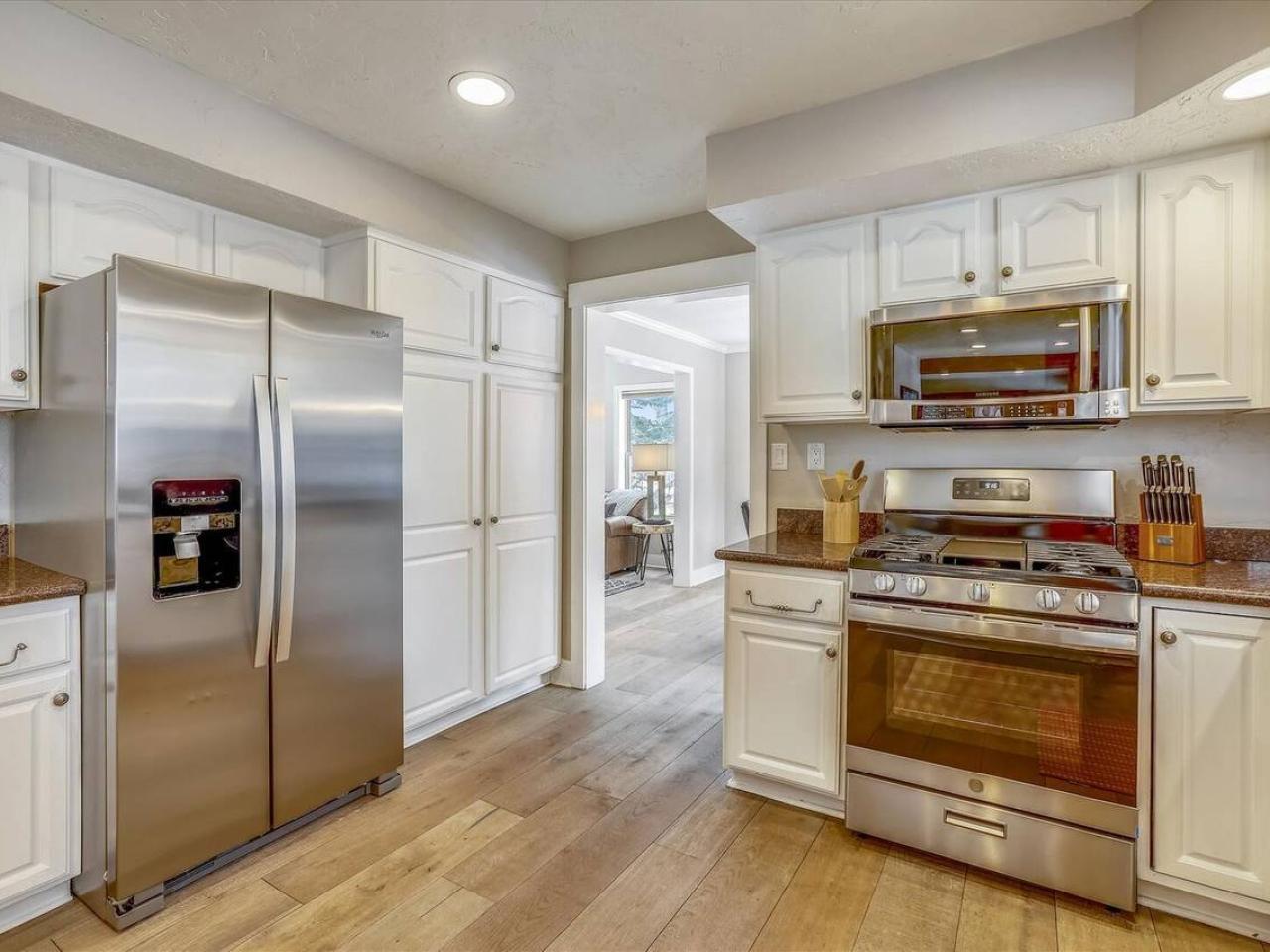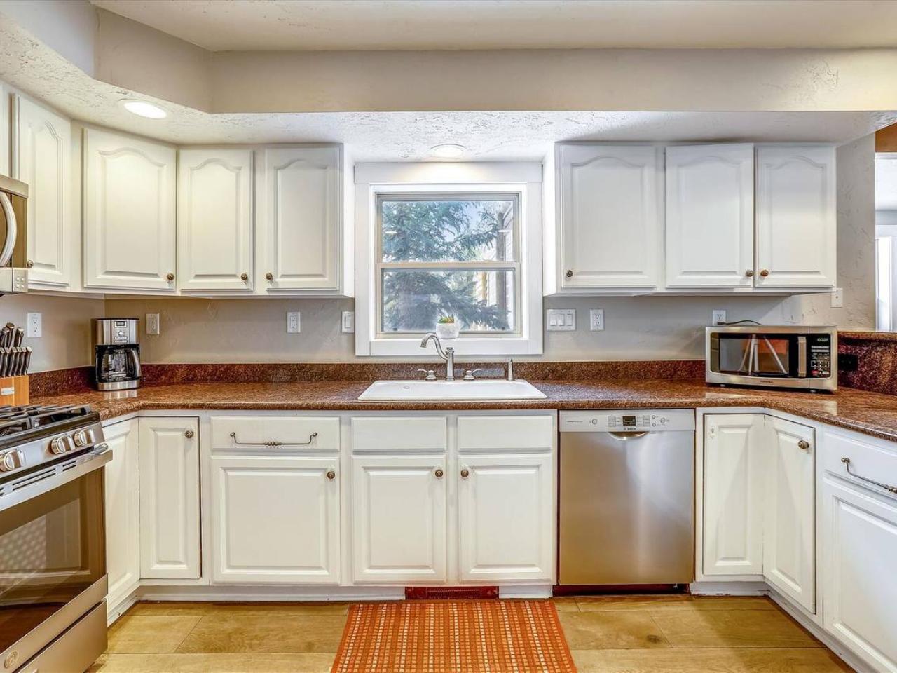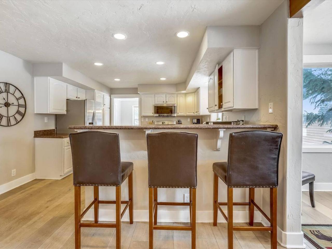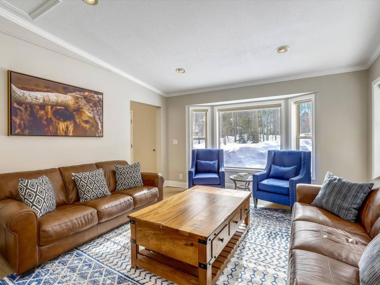 Blending an open layout with distinctive spaces, the main level of this 4 bedroom, 4.5 bathroom mountain retreat features a cozy living room offering a large leather sofa with a television set inside a barn-door accessed wall unit and an adjacent bar. Step out through glass doors in the living room to the sprawling back deck equipped with a barbecue grill and private hot tub. Off of the living room is a breakfast nook seating 5 guests, a kitchen bar accommodating 3 guests and the contemporary kitchen boasting granite countertops and stainless steel appliances.