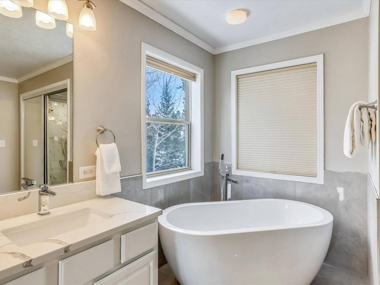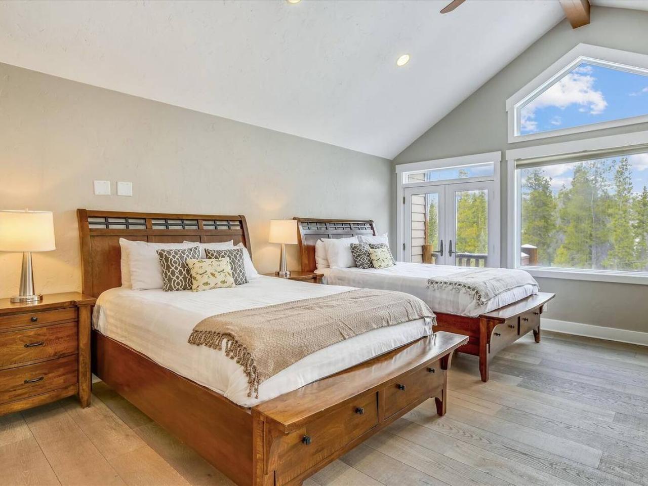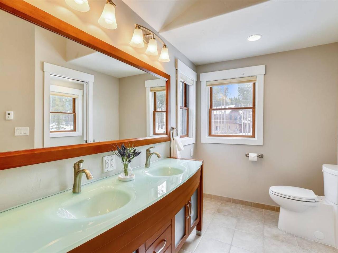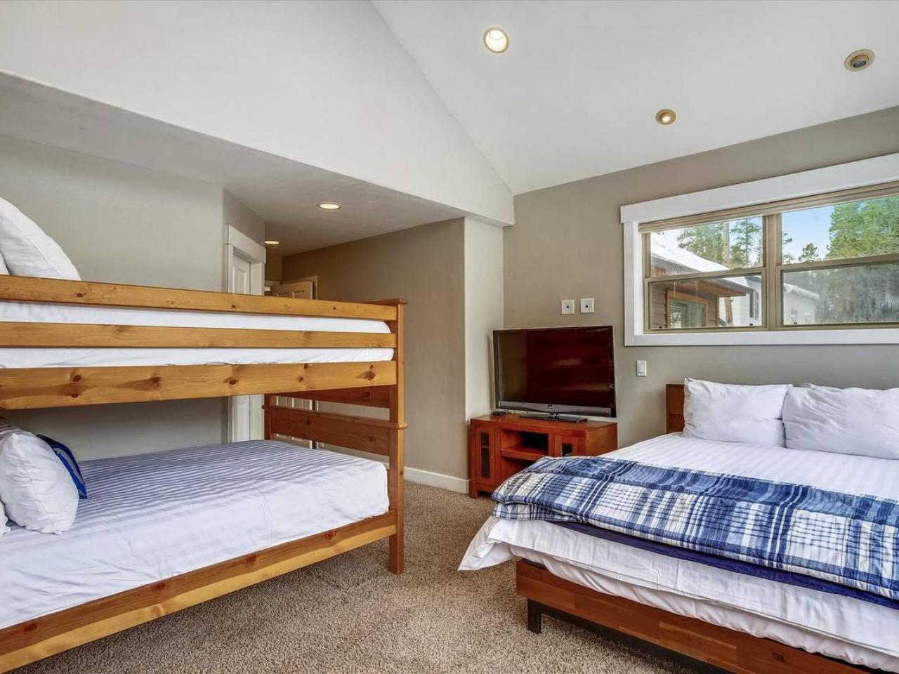 Furnished with a King bed, the primary bedroom includes a sitting area with a Queen Sleeper sofa and a private bathroom outfitted with a dual-sink vanity and walk-in shower. Appointed with two Queen beds and a gas fireplace, one of the guest bedrooms includes a private bathroom with a dual-sink vanity, soaking tub and walk-in shower. Another guest bedroom outfitted with a Queen bed enjoys a private bathroom with a walk-in shower. Accessing a full bathroom in the hallway, the final bedroom is equipped with a Queen bed plus a Twin over Twin bunk bed. All bedrooms are located on the upper level of the residence.