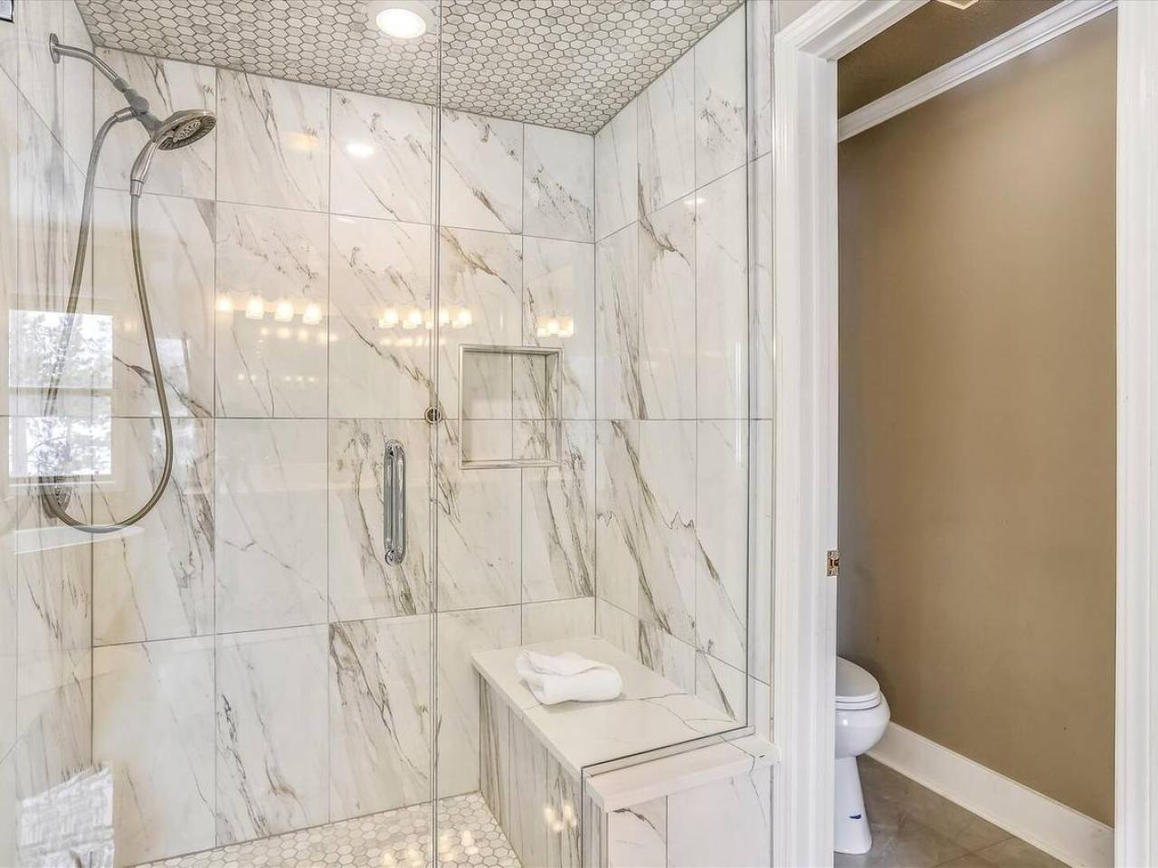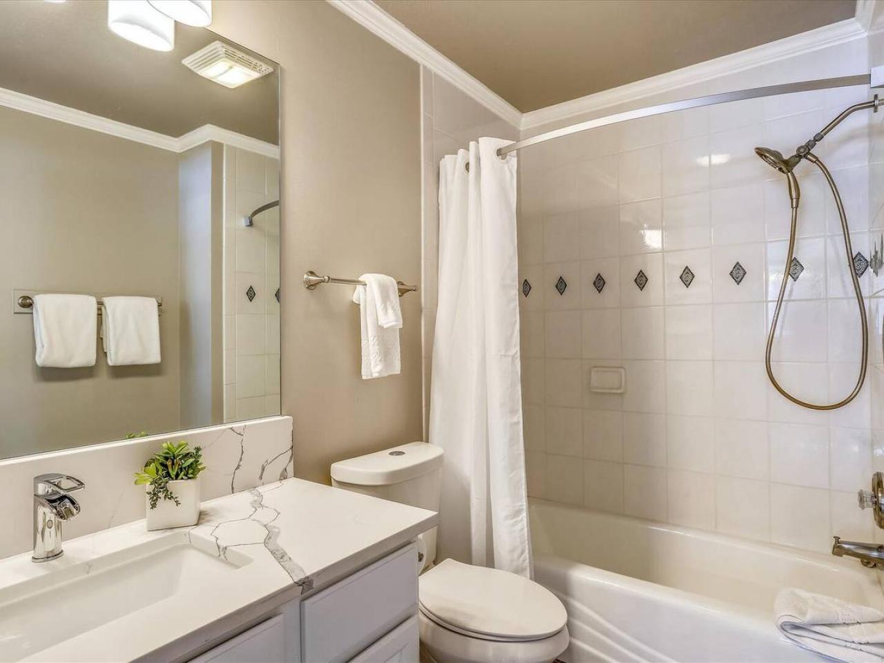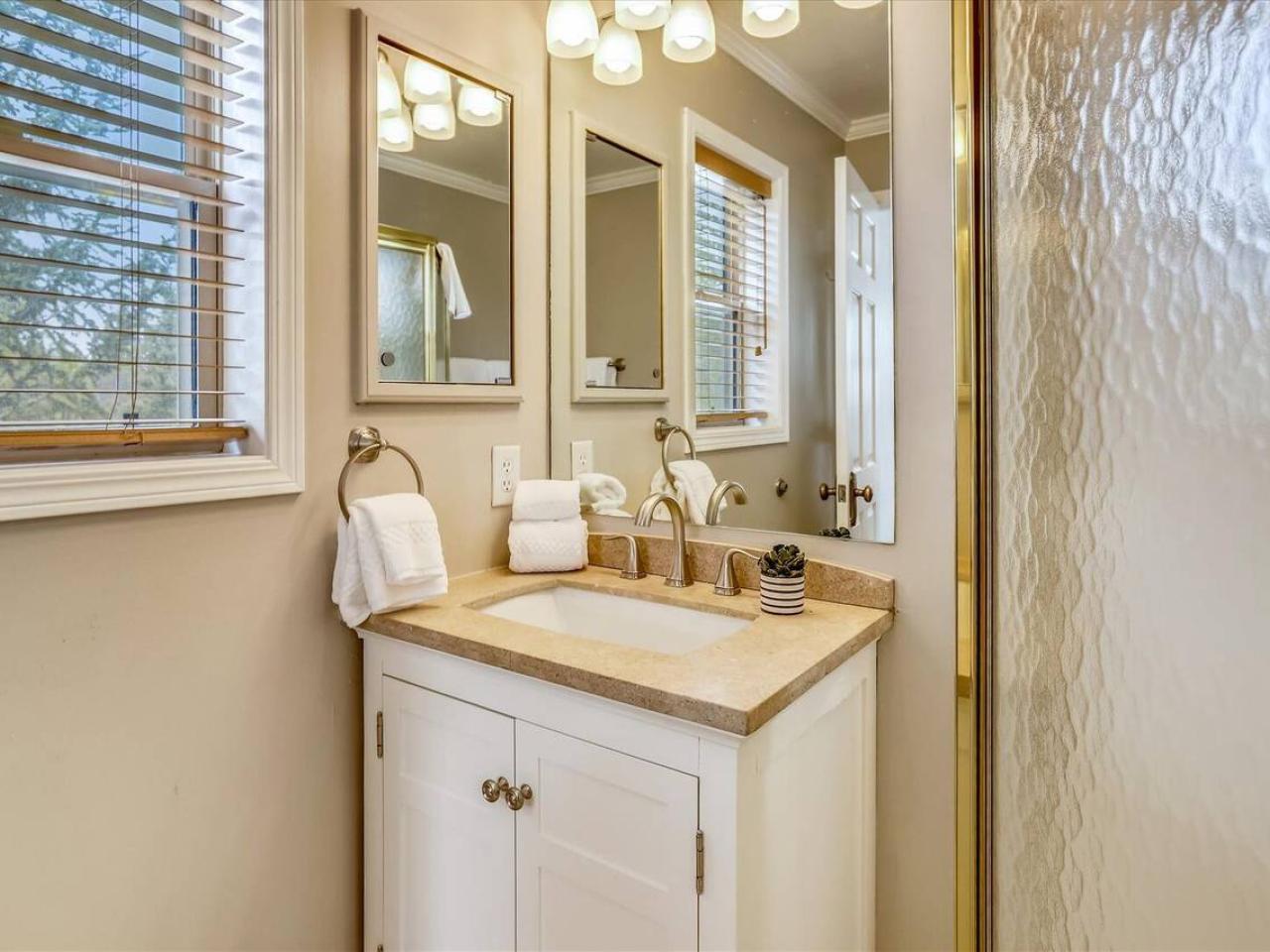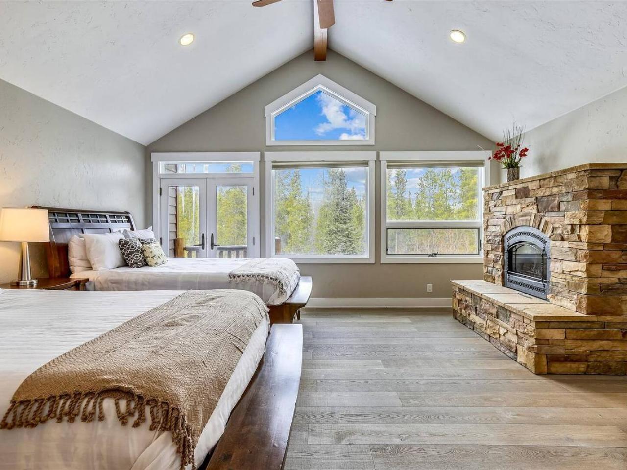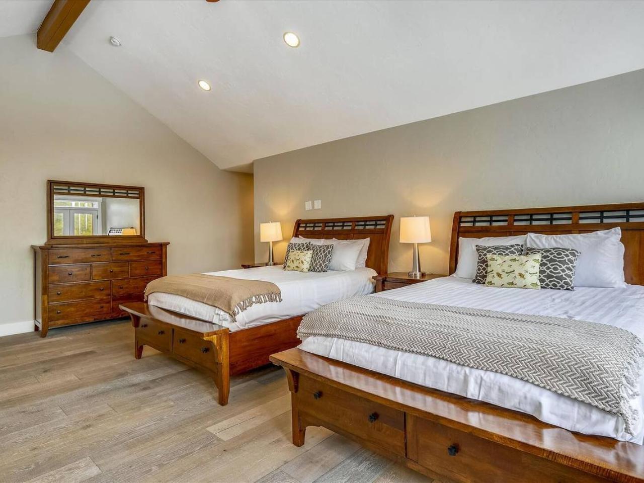 Furnished with a King bed, the primary bedroom includes a sitting area with a Queen Sleeper sofa and a private bathroom outfitted with a dual-sink vanity and walk-in shower. Appointed with two Queen beds and a gas fireplace, one of the guest bedrooms includes a private bathroom with a dual-sink vanity, soaking tub and walk-in shower. Another guest bedroom outfitted with a Queen bed enjoys a private bathroom with a walk-in shower. Accessing a full bathroom in the hallway, the final bedroom is equipped with a Queen bed plus a Twin over Twin bunk bed. All bedrooms are located on the upper level of the residence.