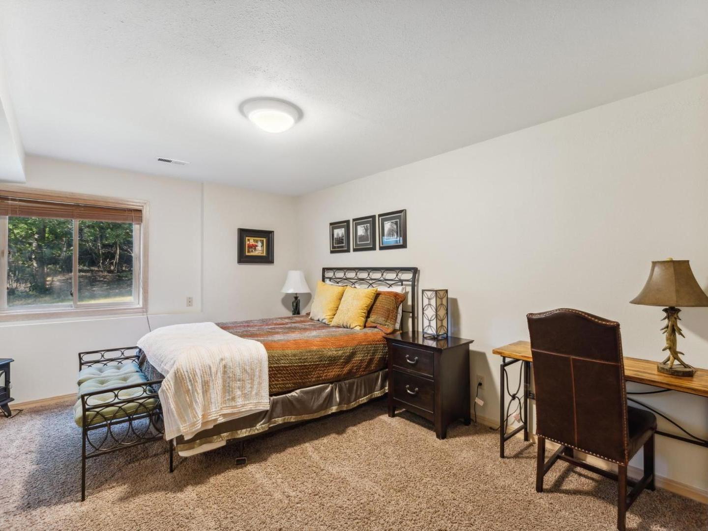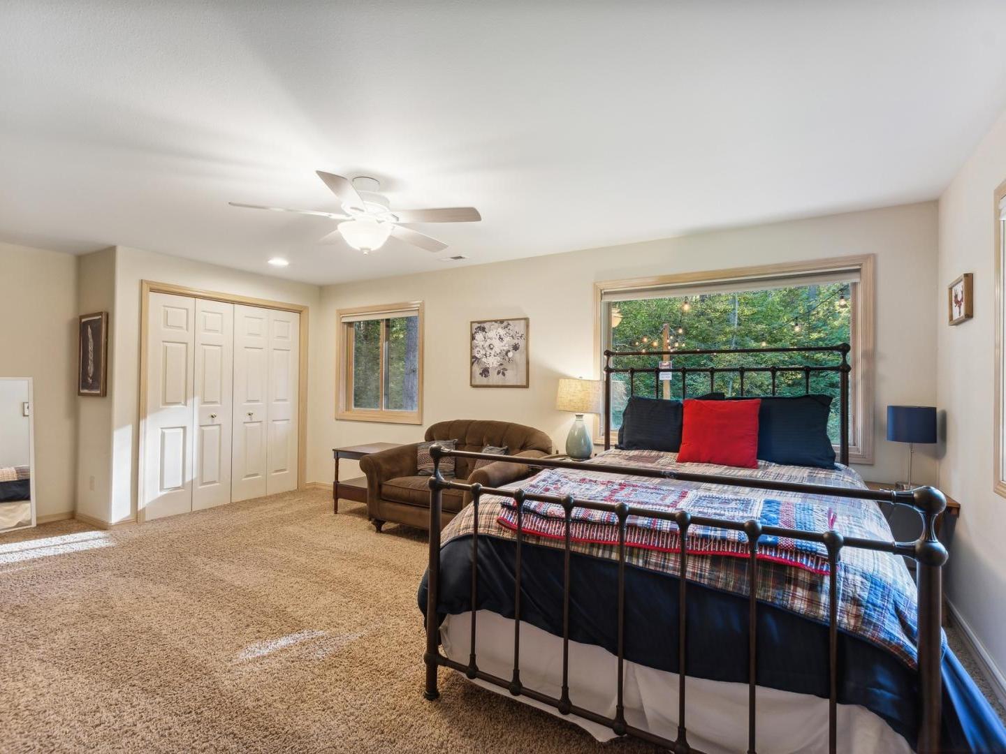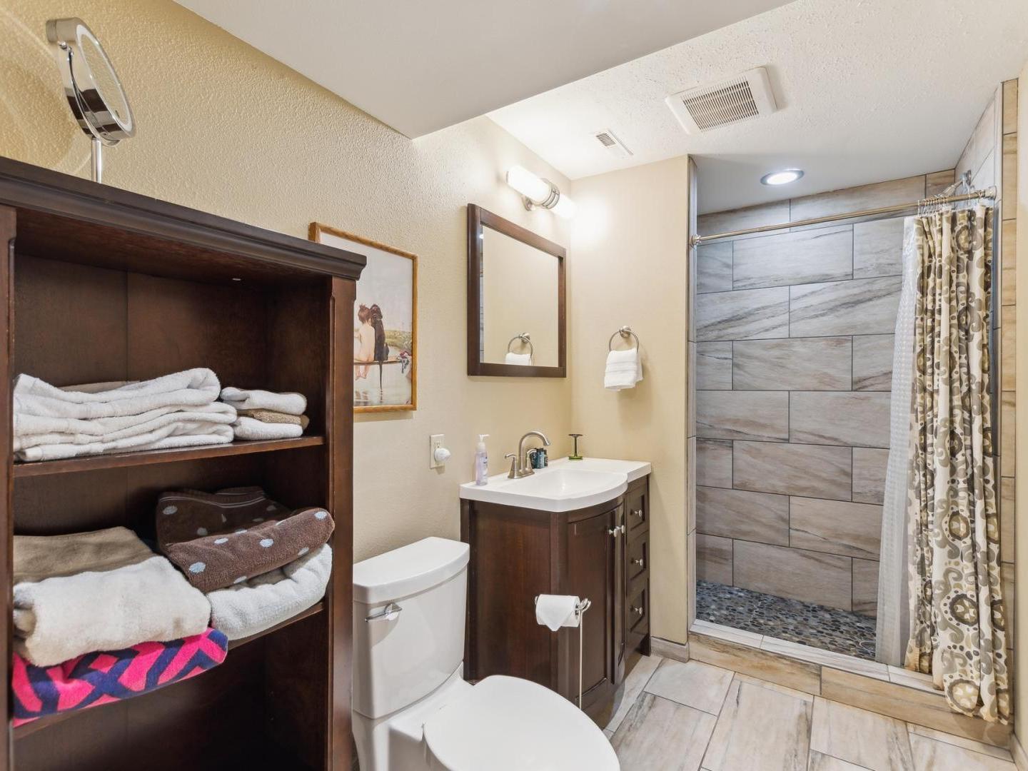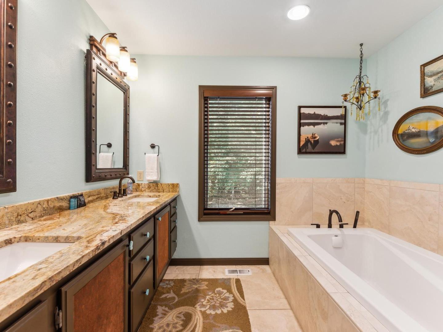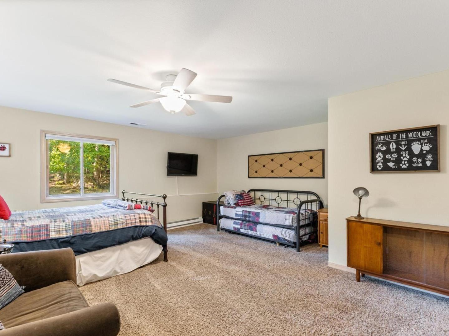Set off of the living area on the main level, the primary bedroom is appointed with a King bed and private bathroom with a dual-sink vanity, soaking tub and walk-in shower. Three lower level guest bedrooms share a full bathroom, two are furnished with Queen beds while the third offers a Queen bed plus a Twin bed with a Twin Trundle bed that pulls out from underneath.