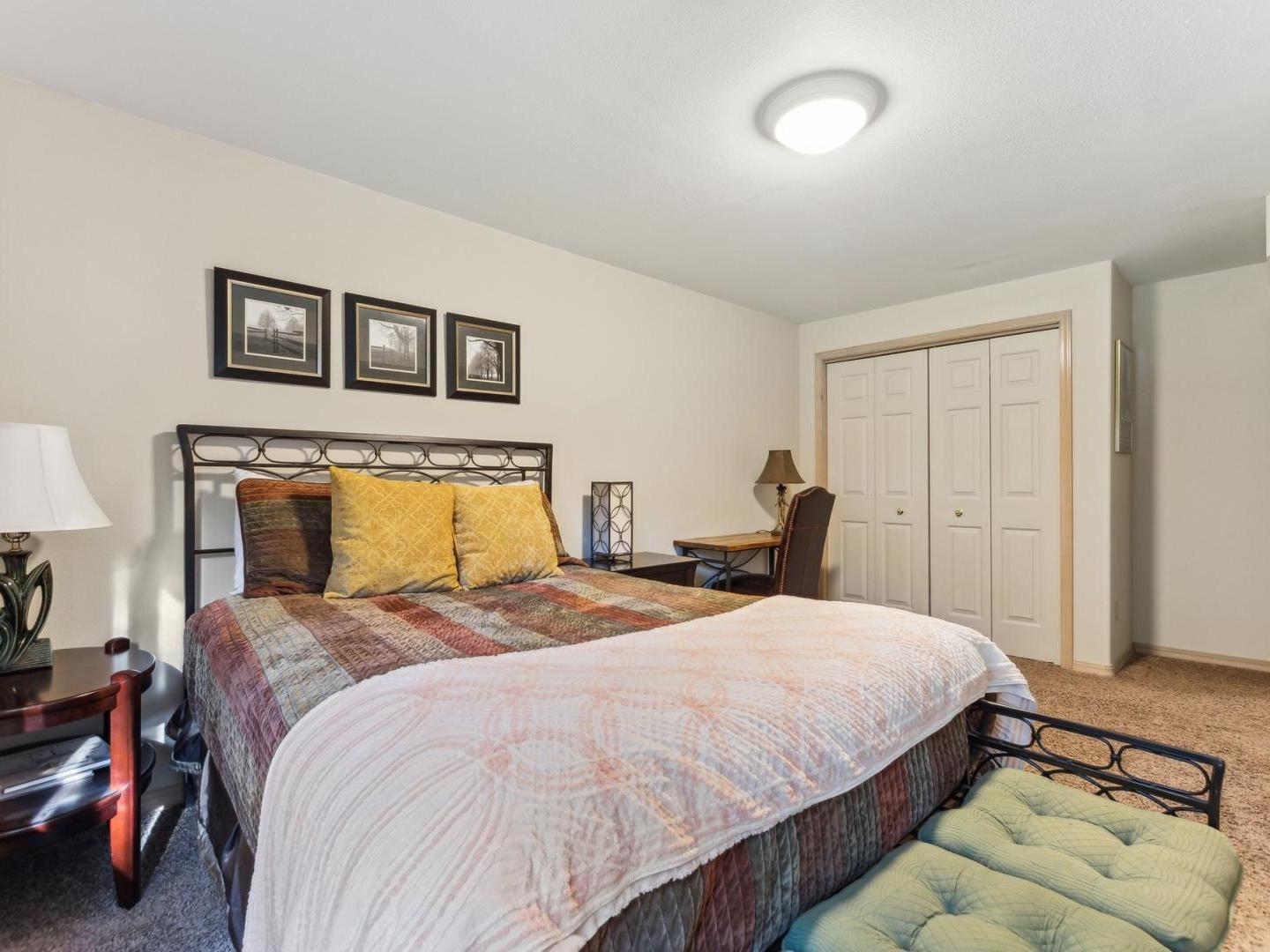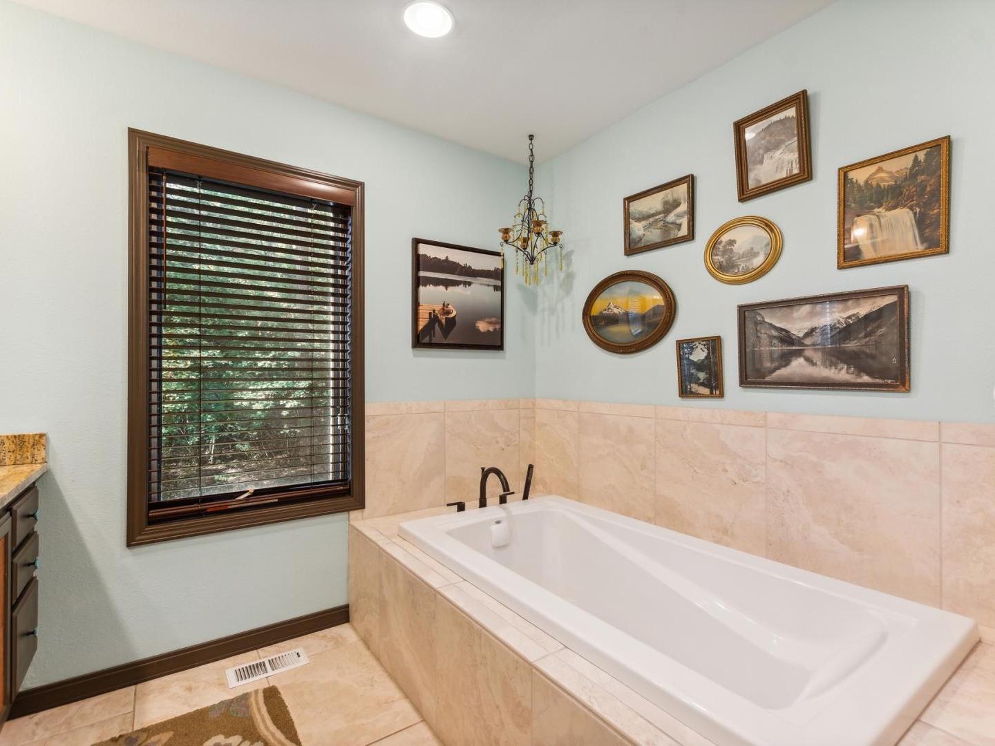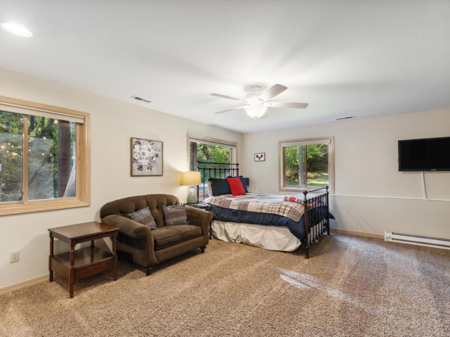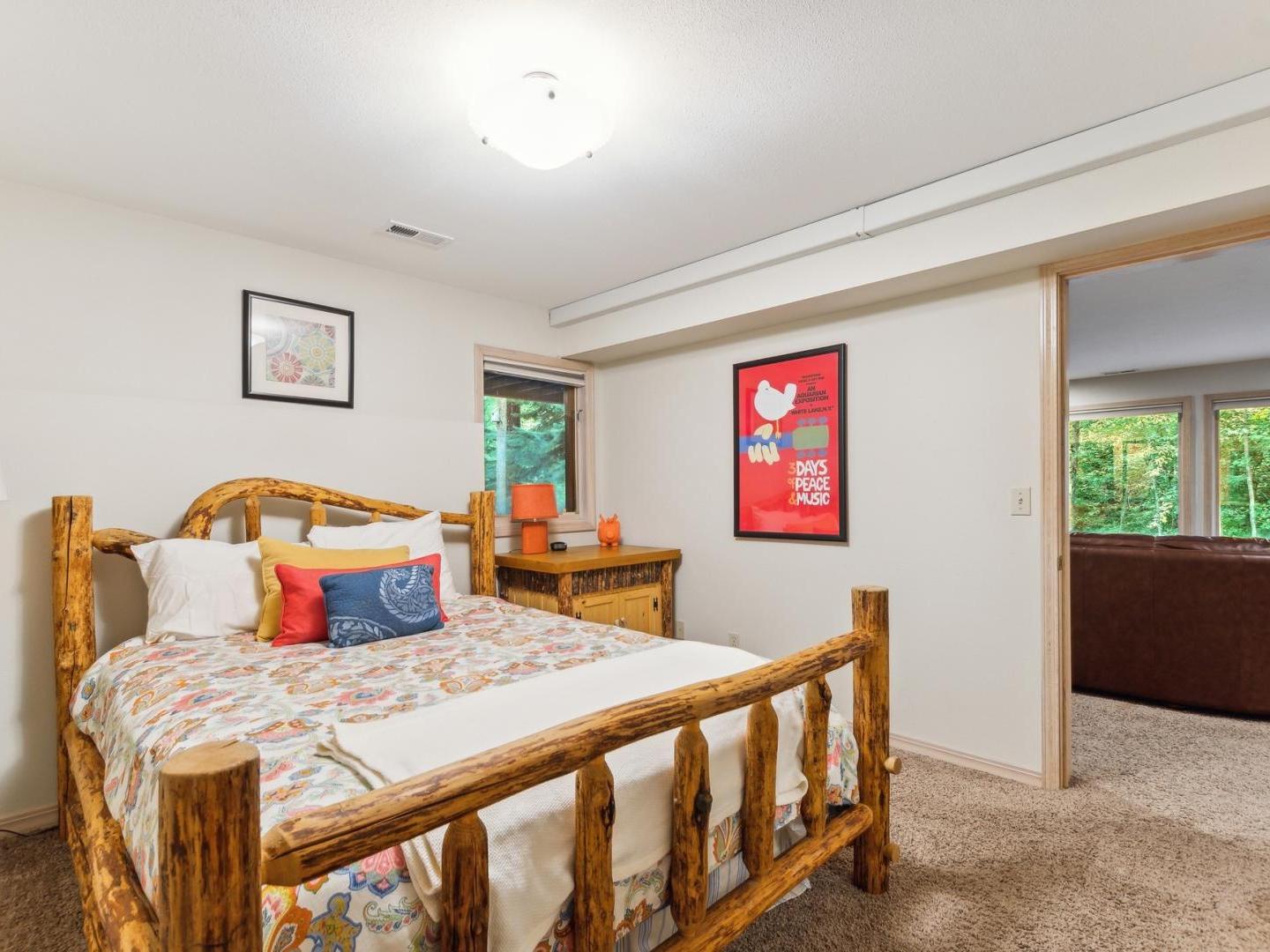 Set off of the living area on the main level, the primary bedroom is appointed with a King bed and private bathroom with a dual-sink vanity, soaking tub and walk-in shower. Three lower level guest bedrooms share a full bathroom, two are furnished with Queen beds while the third offers a Queen bed plus a Twin bed with a Twin Trundle bed that pulls out from underneath.