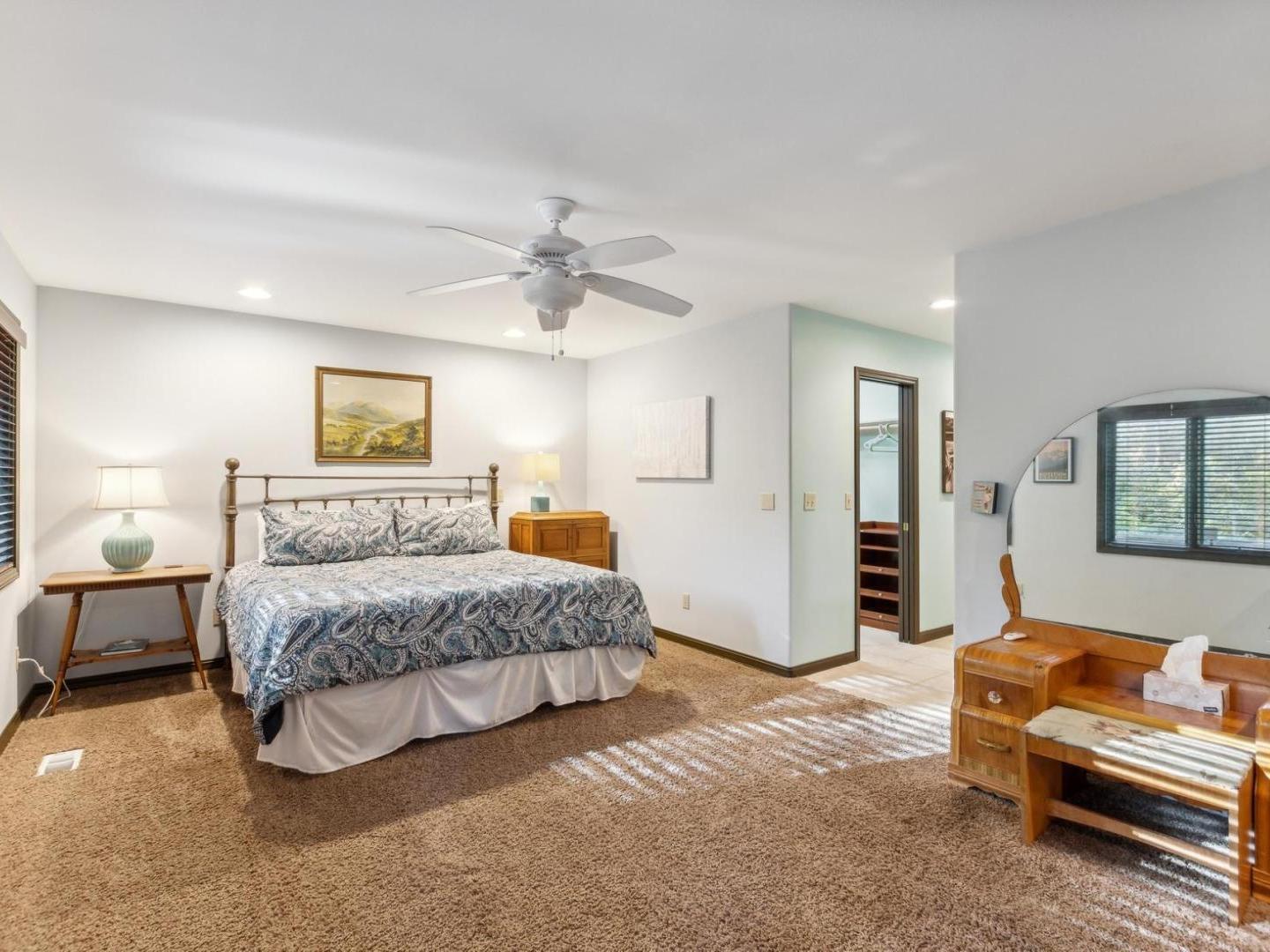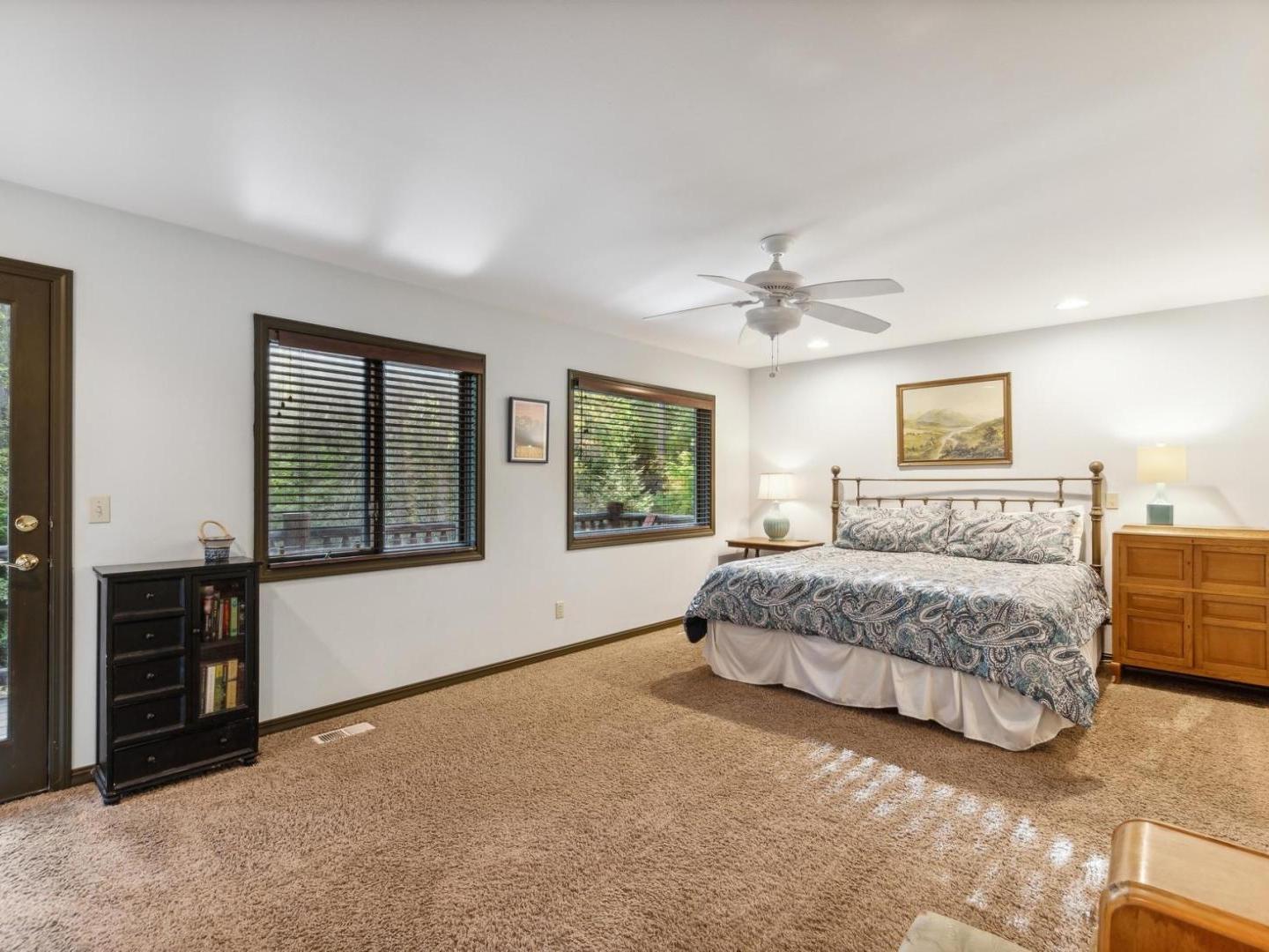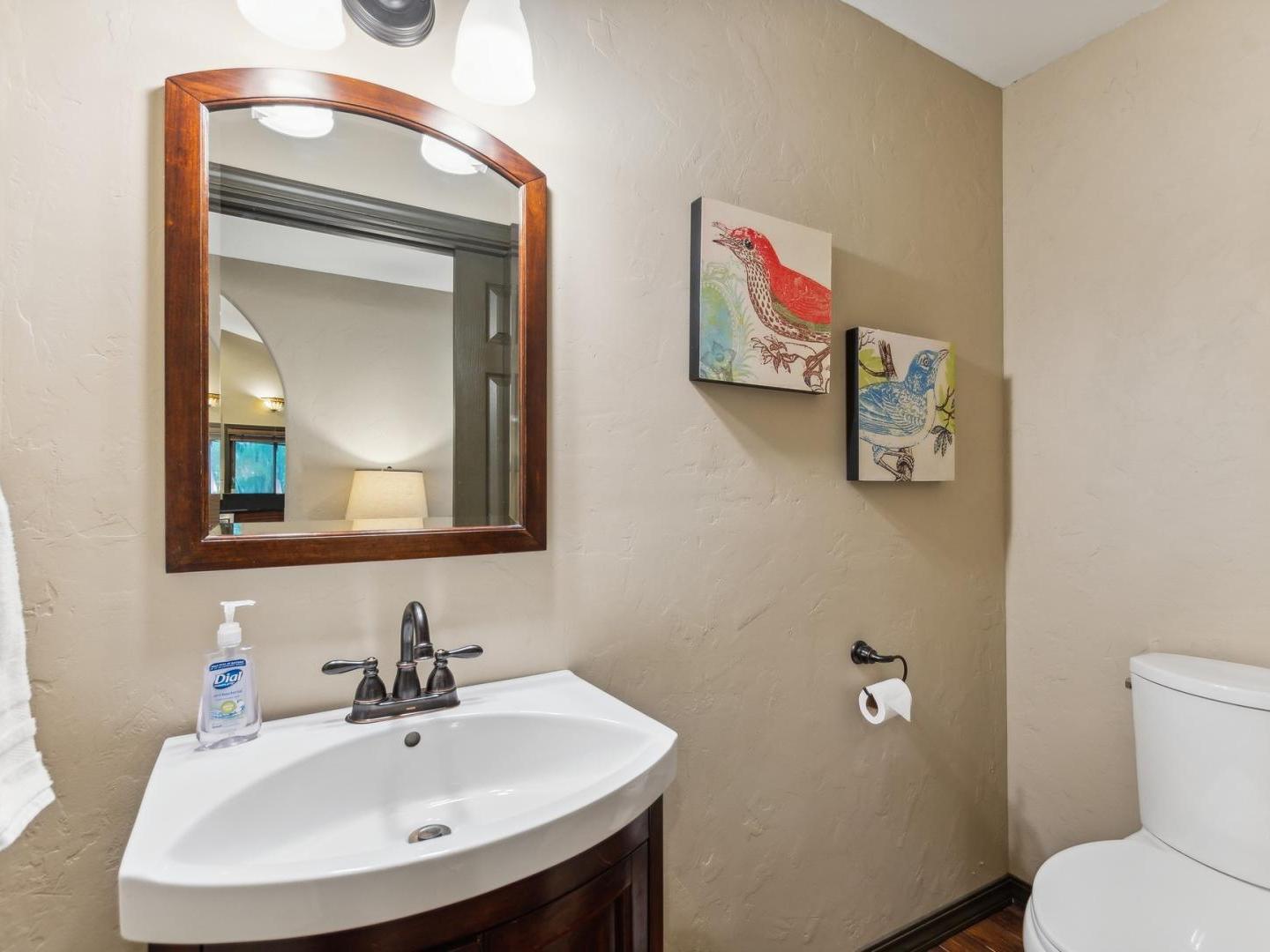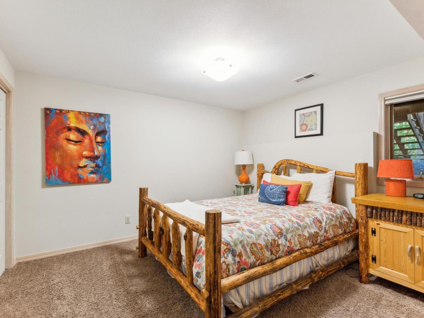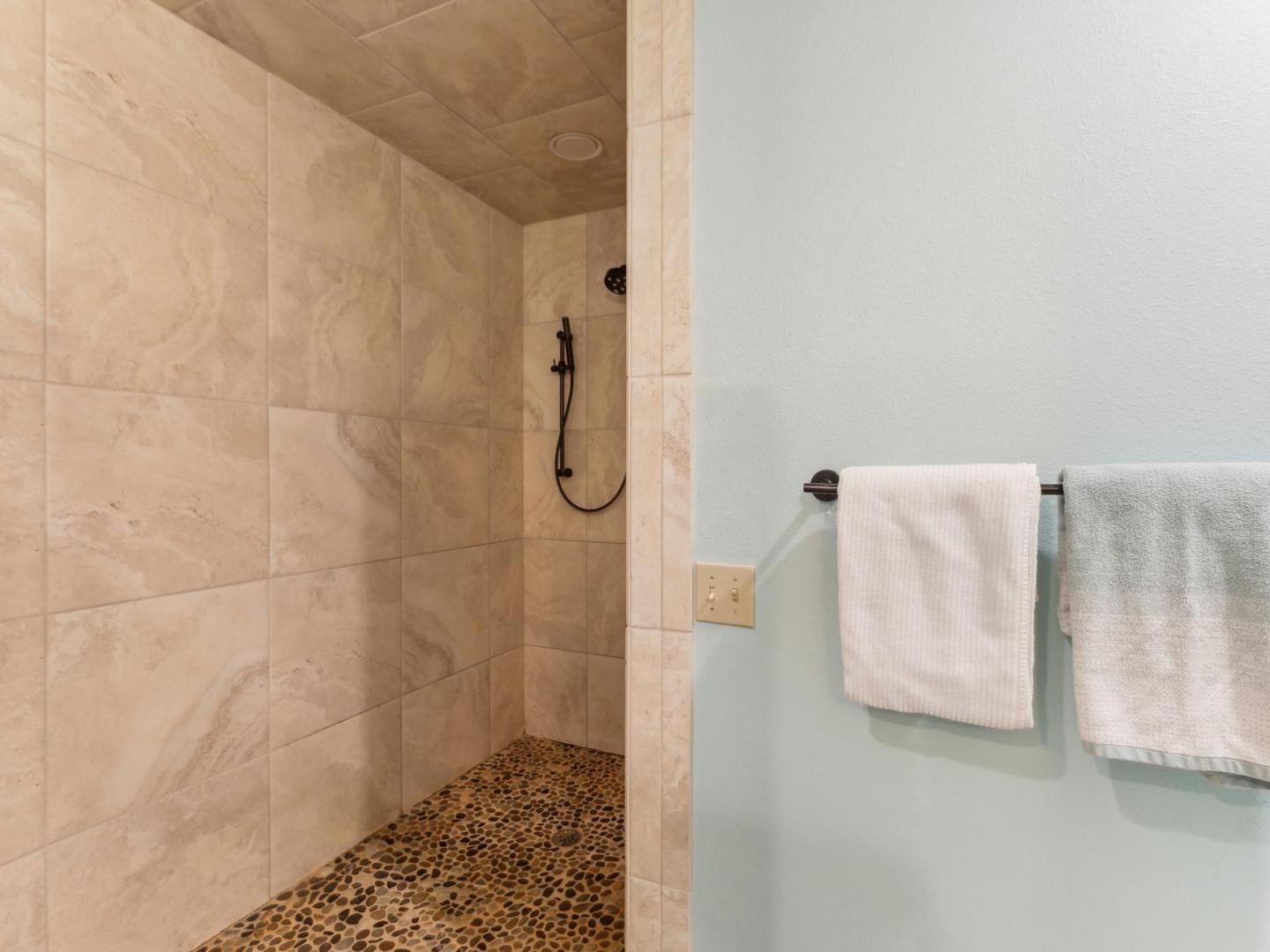 Set off of the living area on the main level, the primary bedroom is appointed with a King bed and private bathroom with a dual-sink vanity, soaking tub and walk-in shower. Three lower level guest bedrooms share a full bathroom, two are furnished with Queen beds while the third offers a Queen bed plus a Twin bed with a Twin Trundle bed that pulls out from underneath.