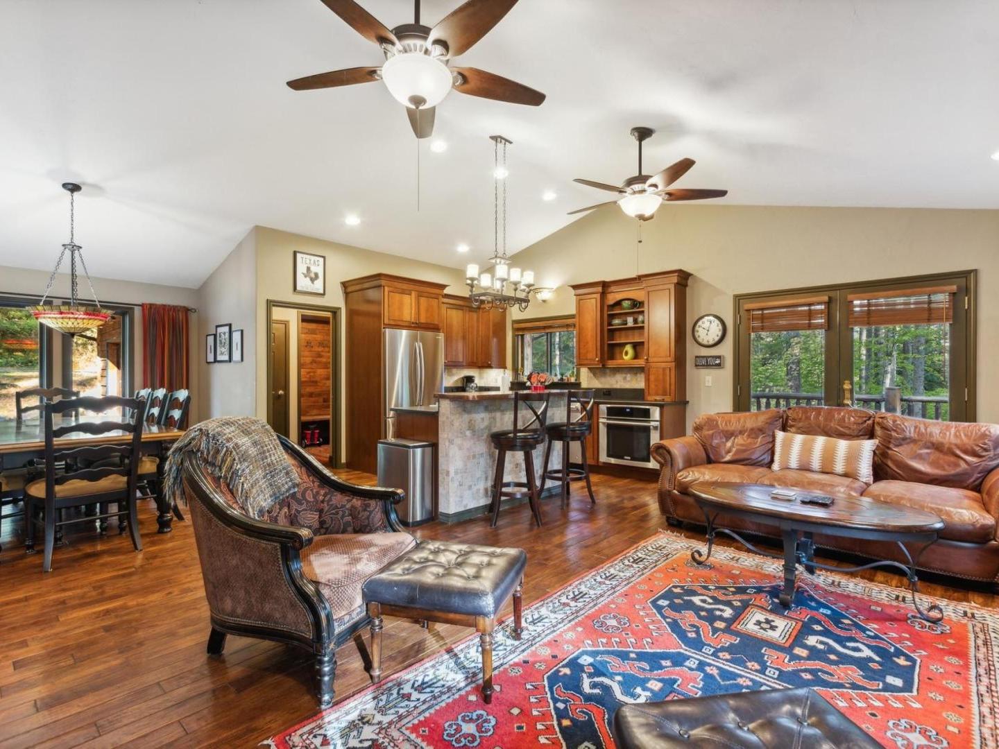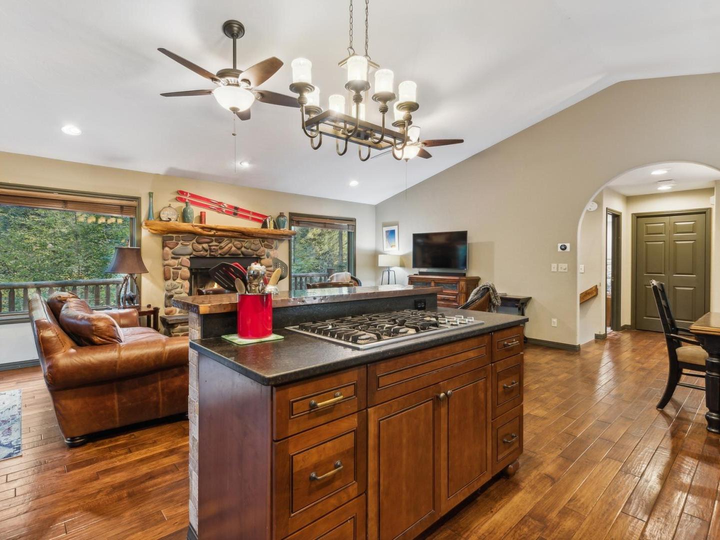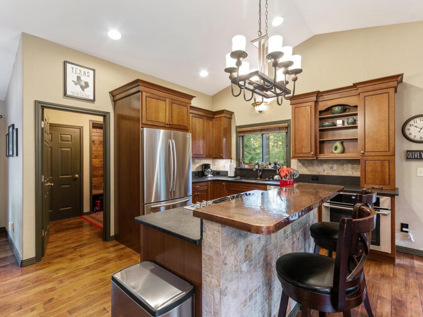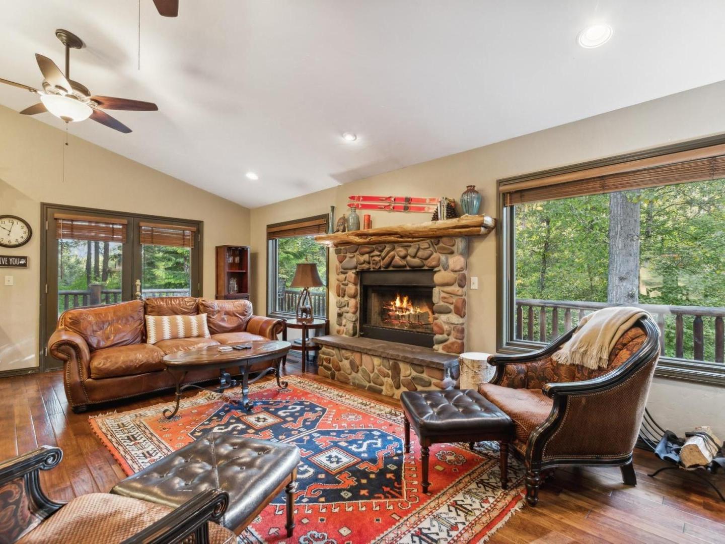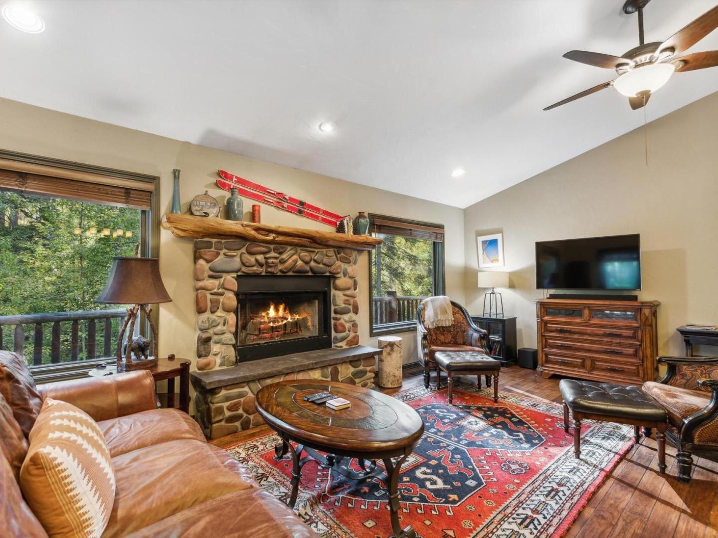 Gather in the cozy living room of this 4 bedroom, 2.5 bathroom private residence featuring comfortable furnishings arranged in front of a river rock fireplace and television. Glass doors lead to the wraparound porch offering forest views, a café table for 2 and a barbecue grill. Culinary enthusiasts will appreciate the gourmet kitchen’s built-in gas range, high-end appliances and granite countertops. A traditional dining table off the side seats 8, with additional seating for 2 at the copper-wrapped bar.