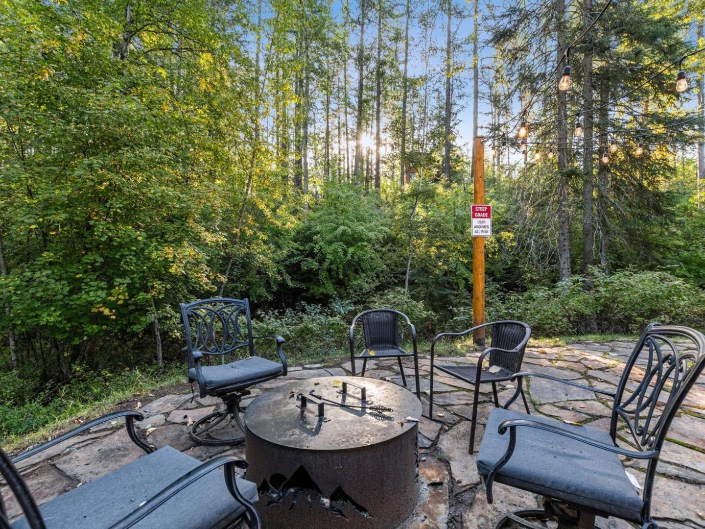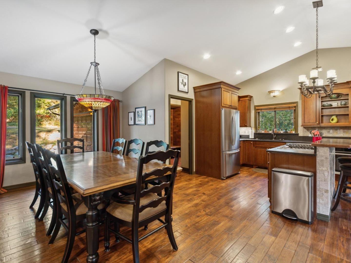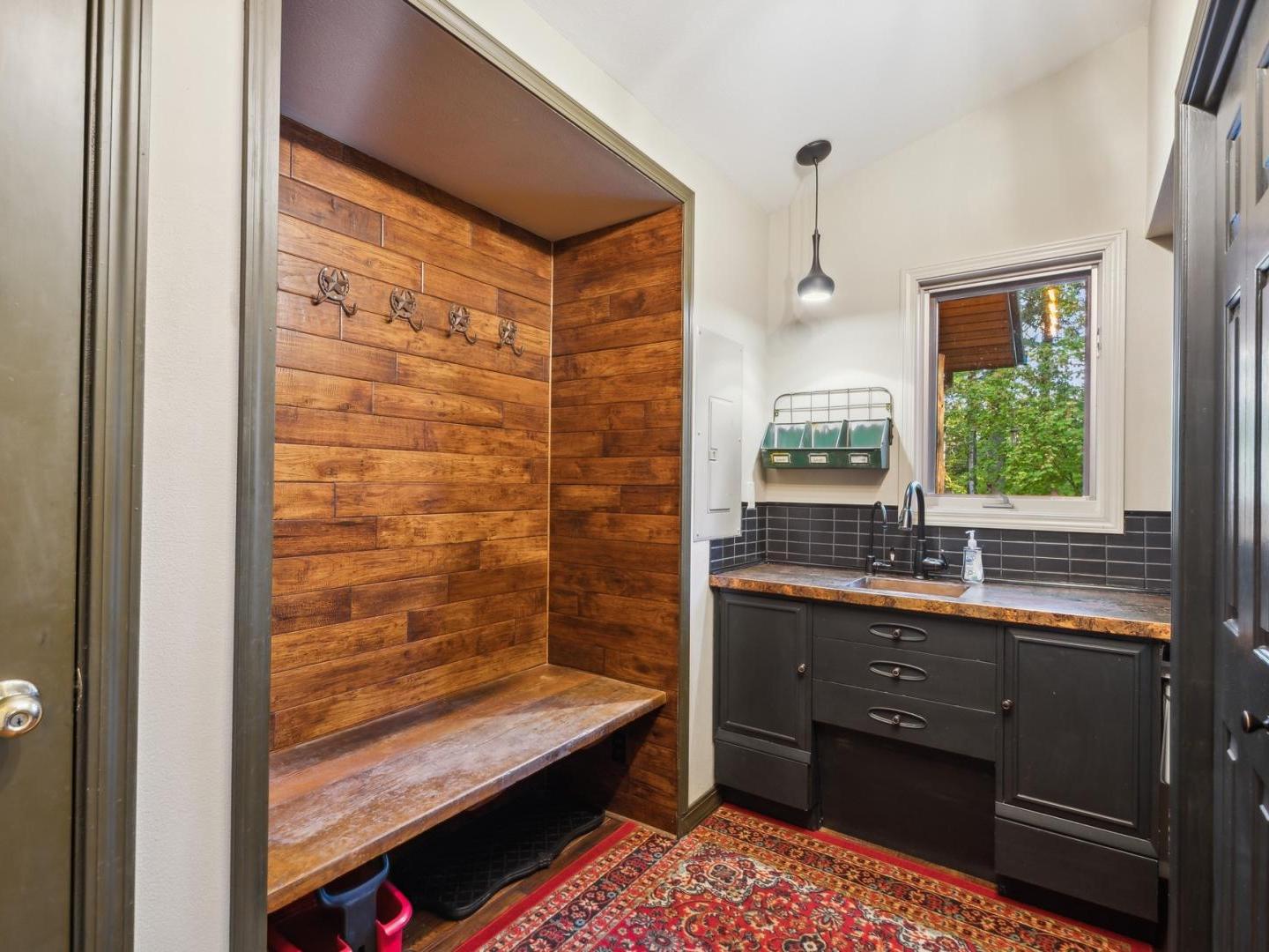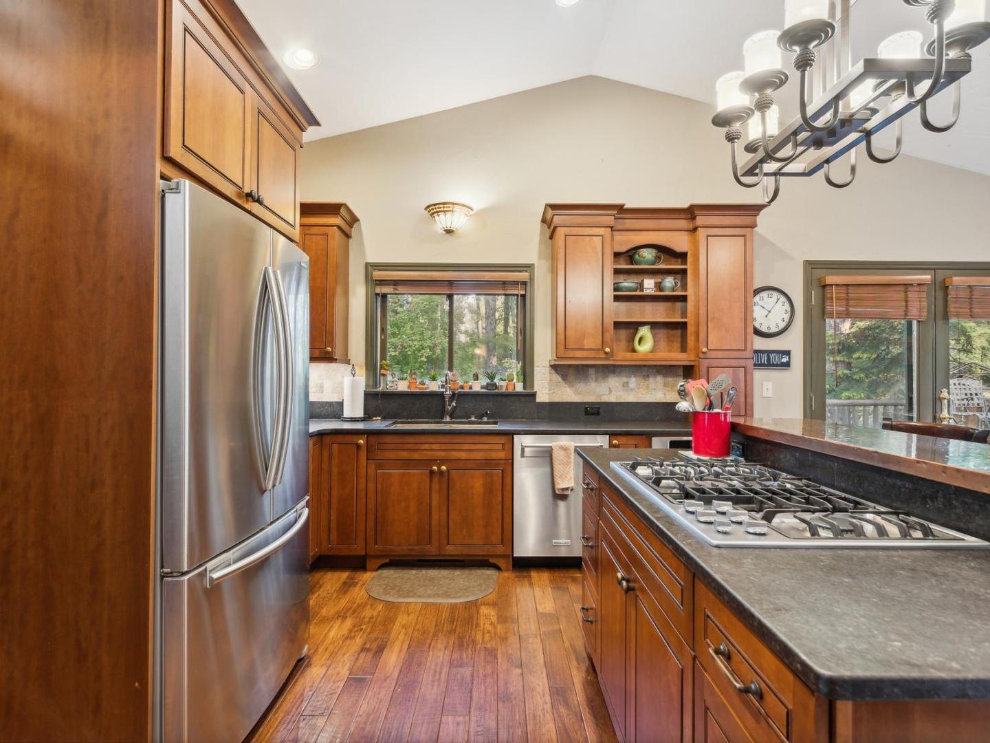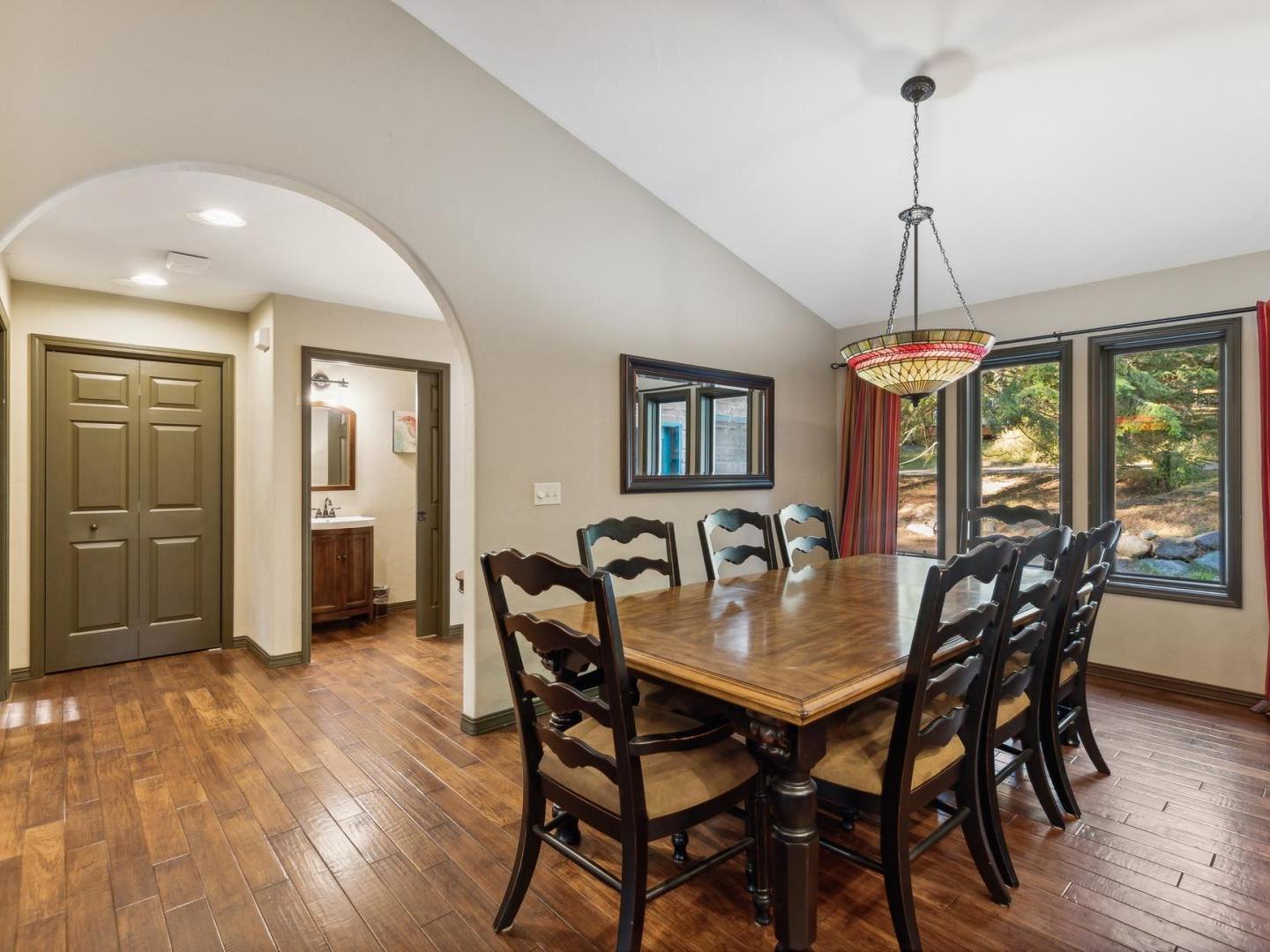 Gather in the cozy living room of this 4 bedroom, 2.5 bathroom private residence featuring comfortable furnishings arranged in front of a river rock fireplace and television. Glass doors lead to the wraparound porch offering forest views, a café table for 2 and a barbecue grill. Culinary enthusiasts will appreciate the gourmet kitchen’s built-in gas range, high-end appliances and granite countertops. A traditional dining table off the side seats 8, with additional seating for 2 at the copper-wrapped bar.