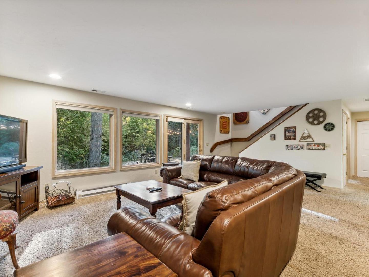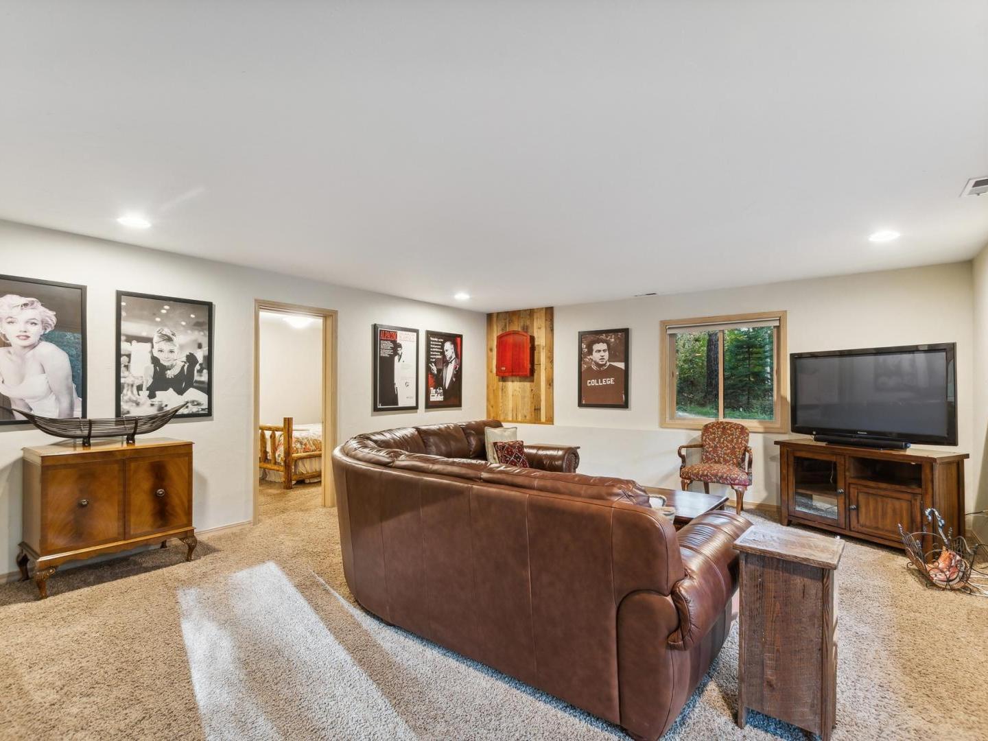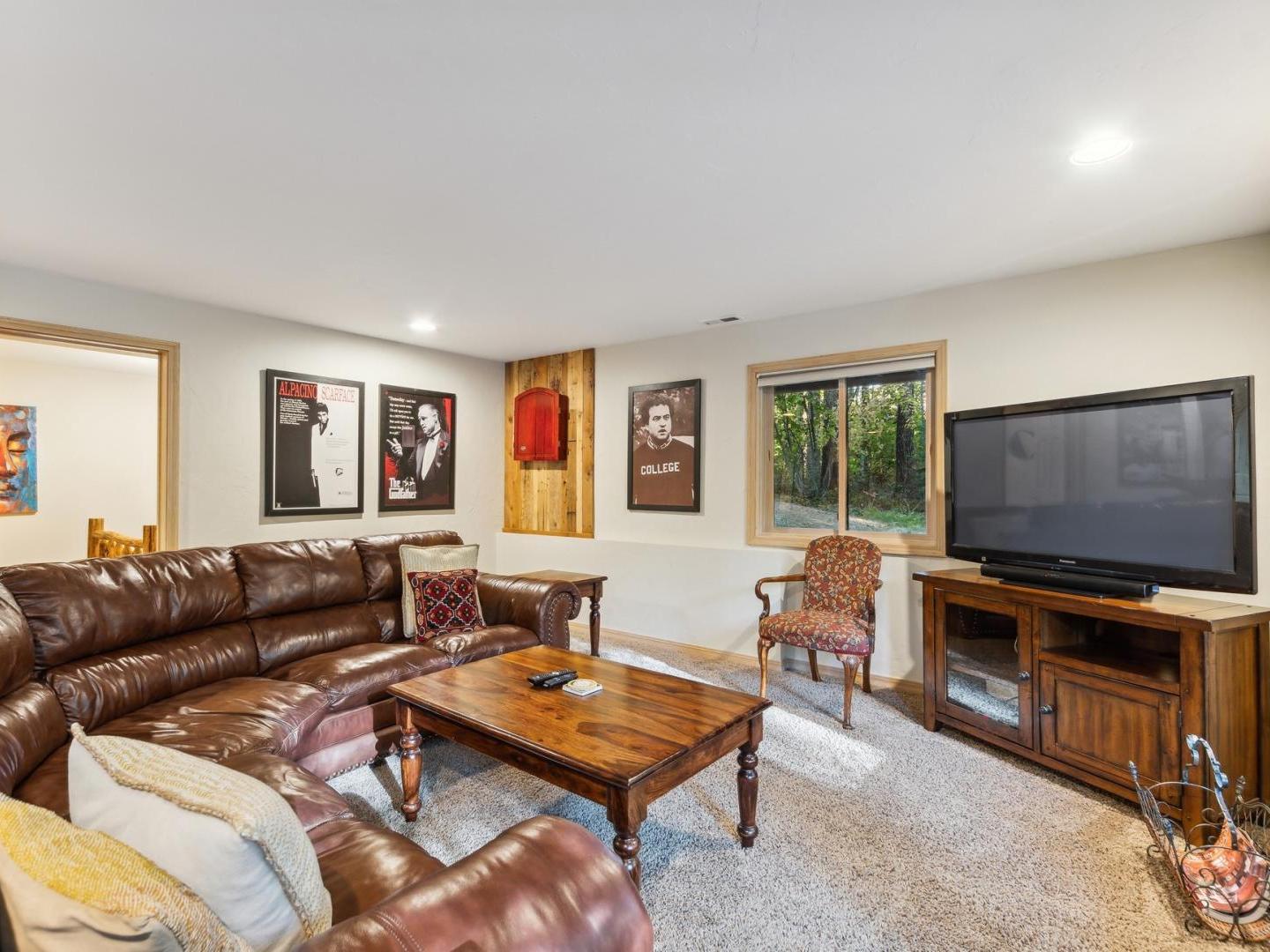 Venture down to the lower level family room with a large leather sectional focused on a television, dart board and games. Outside, string lights illuminate the relaxed back patio with a firepit and private hot tub.