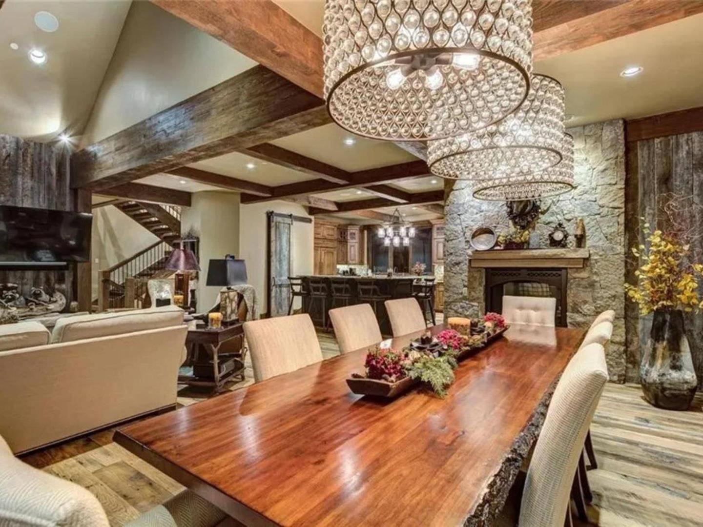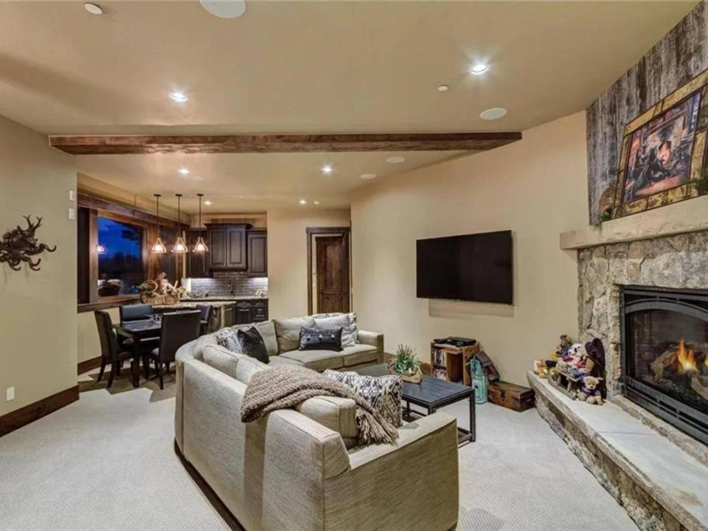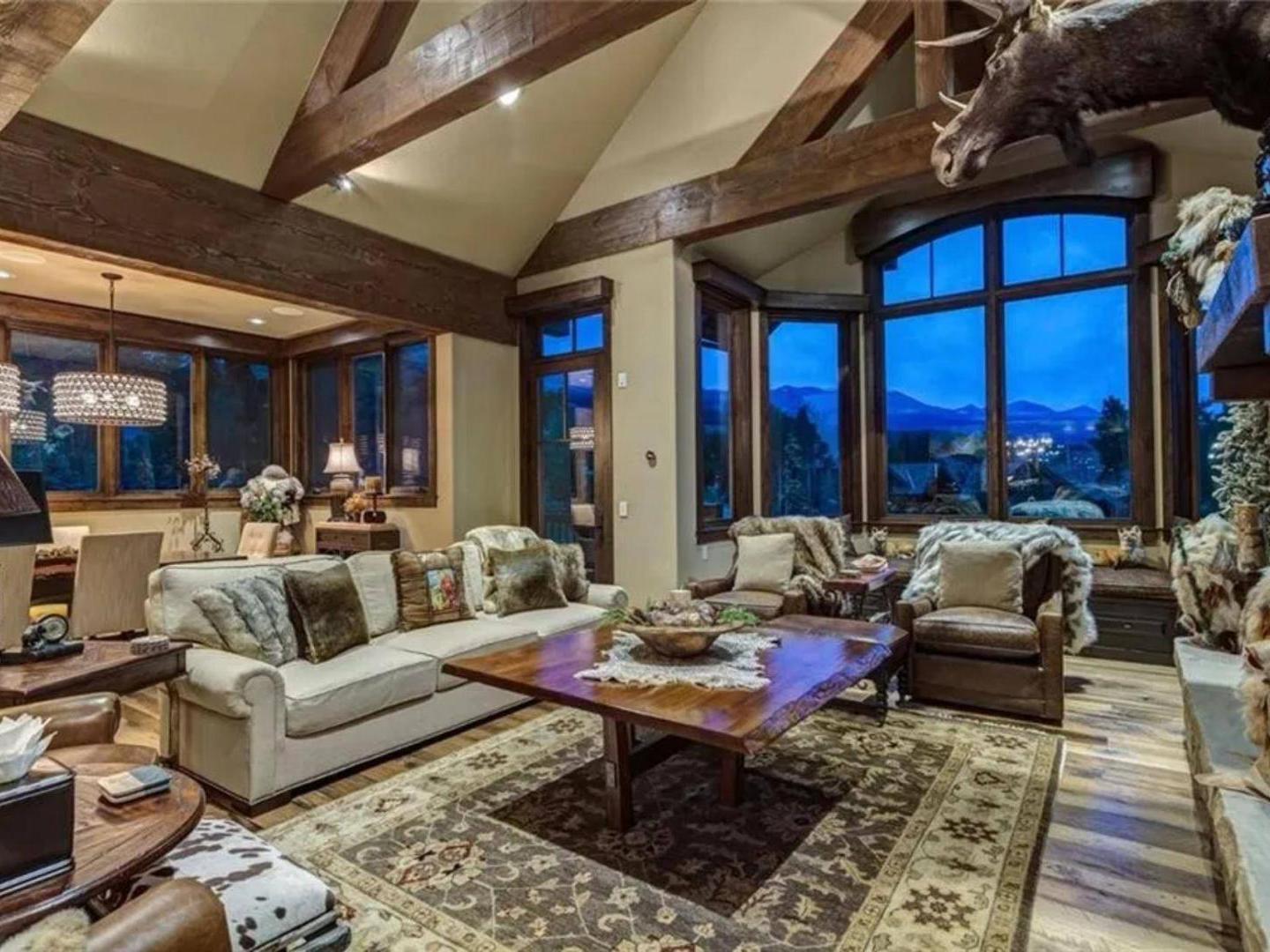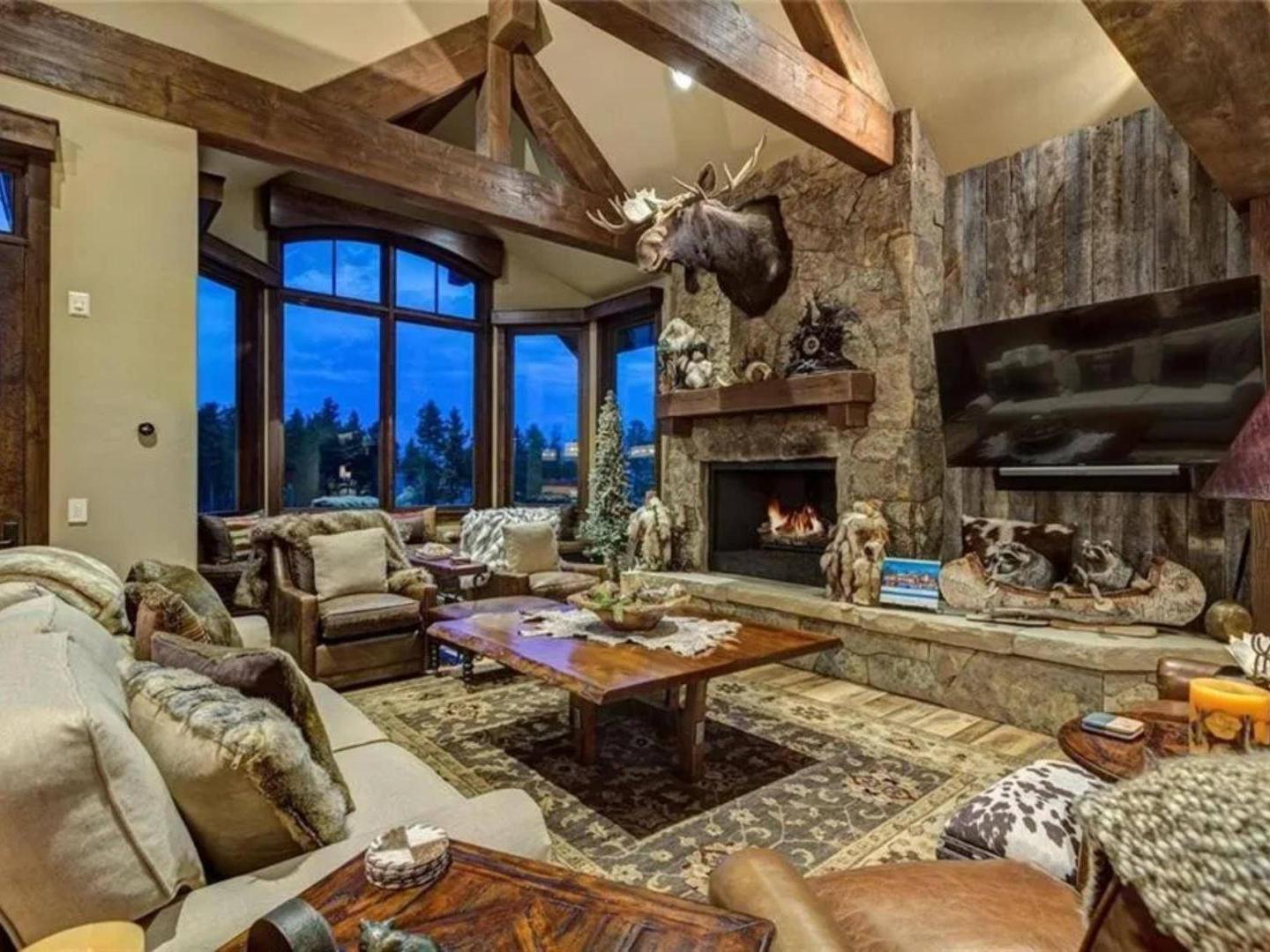 Whether you're gathering around the cozy fireplace, enjoying après-ski in the spacious great room, or preparing meals in the gourmet kitchen, every corner of this 5-bedroom, 5.5-bathroom luxury retreat is thoughtfully crafted to offer comfort, style, and convenience in a stunning alpine setting. Infused with an authentic Western mountain vibe, the main living room welcomes you with vaulted ceilings, exposed beam architecture, and plush furnishings centered around a striking fireplace and adjacent wall-mounted television.