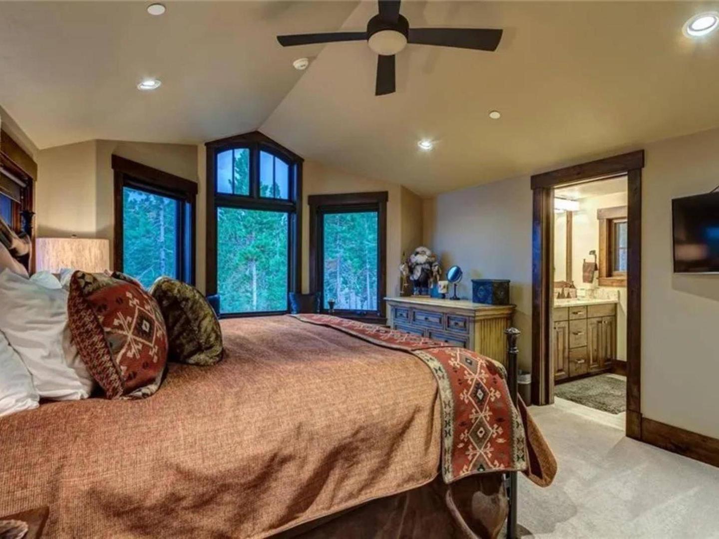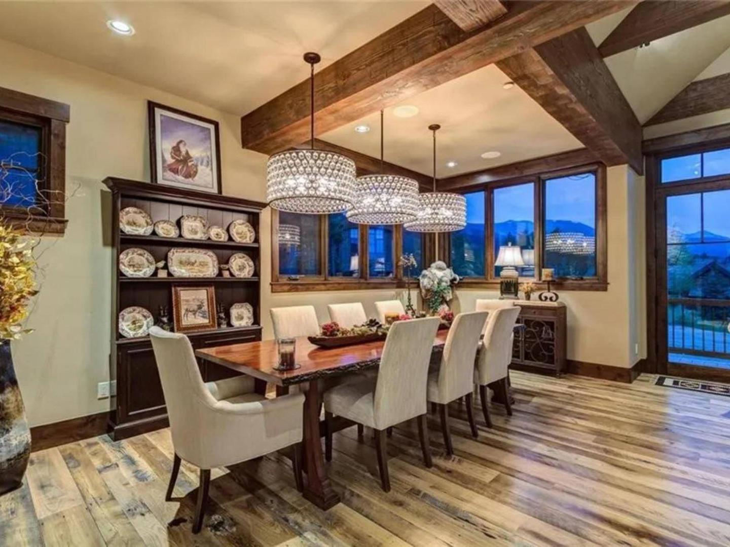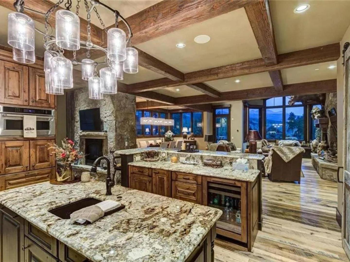 Whether you're gathering around the cozy fireplace, enjoying après-ski in the spacious great room, or preparing meals in the gourmet kitchen, every corner of this 5-bedroom, 5.5-bathroom luxury retreat is thoughtfully crafted to offer comfort, style, and convenience in a stunning alpine setting. Infused with an authentic Western mountain vibe, the main living room welcomes you with vaulted ceilings, exposed beam architecture, and plush furnishings centered around a striking fireplace and adjacent wall-mounted television.