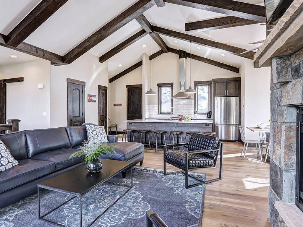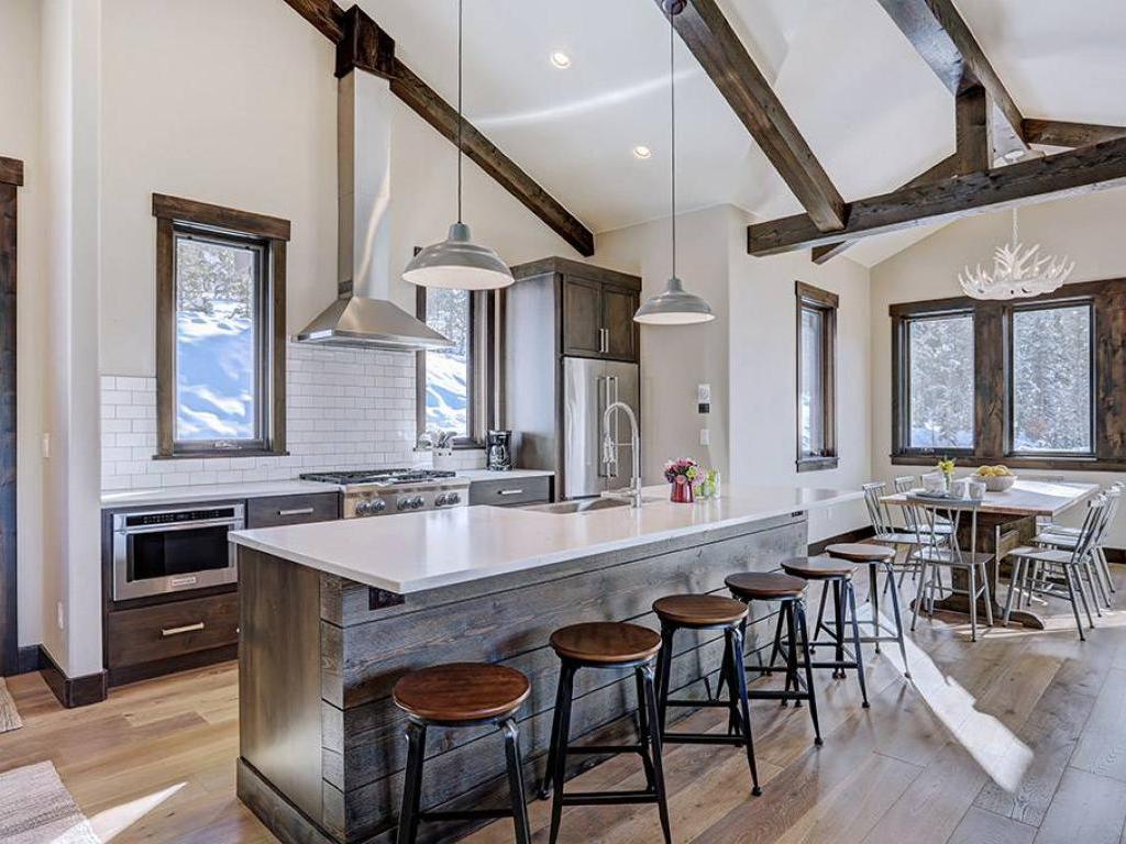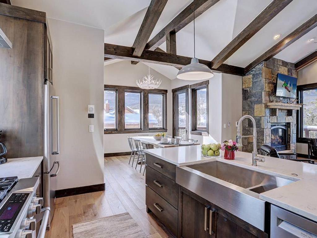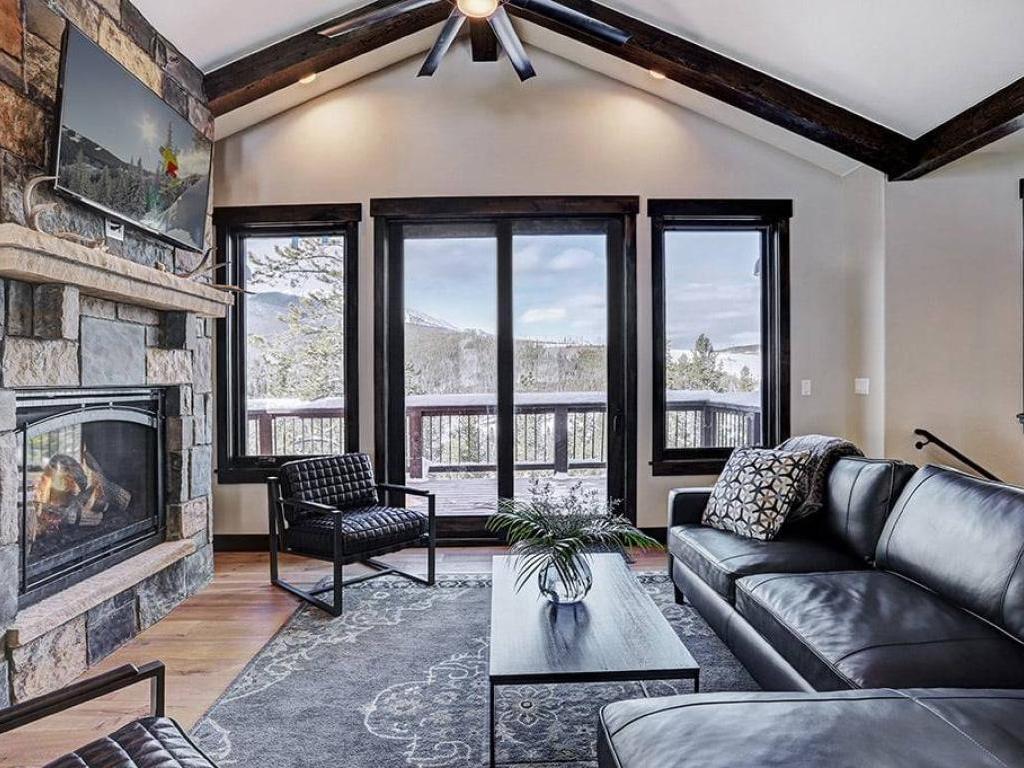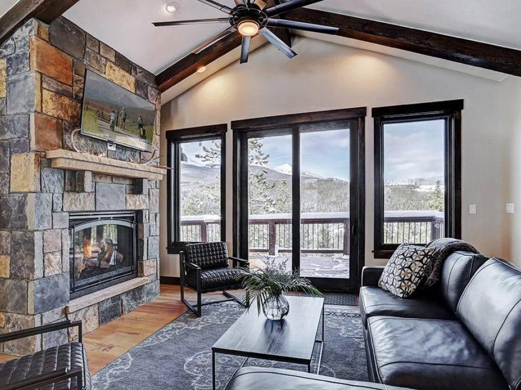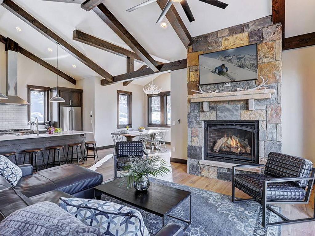 Focused on a gas fireplace and wall-mounted television, with a wall of windows showcasing majestic mountain views, the main level living room in this 3 bedroom, 4.5 vacation home offers comfortable furnishings set under vaulted ceilings. Step out through glass doors to enjoy close-ups of the mountain on the deck, equipped with a barbecue grill, or enjoy a meal at the adjacent dining table with seating for 8 guests. Overlooking the living room and dining area, the refined kitchen is appointed with hgh-end appliances, polished stone countertops and breakfast bar seating for 6 guests.