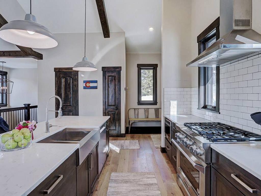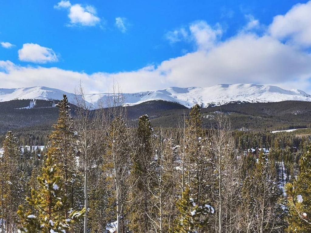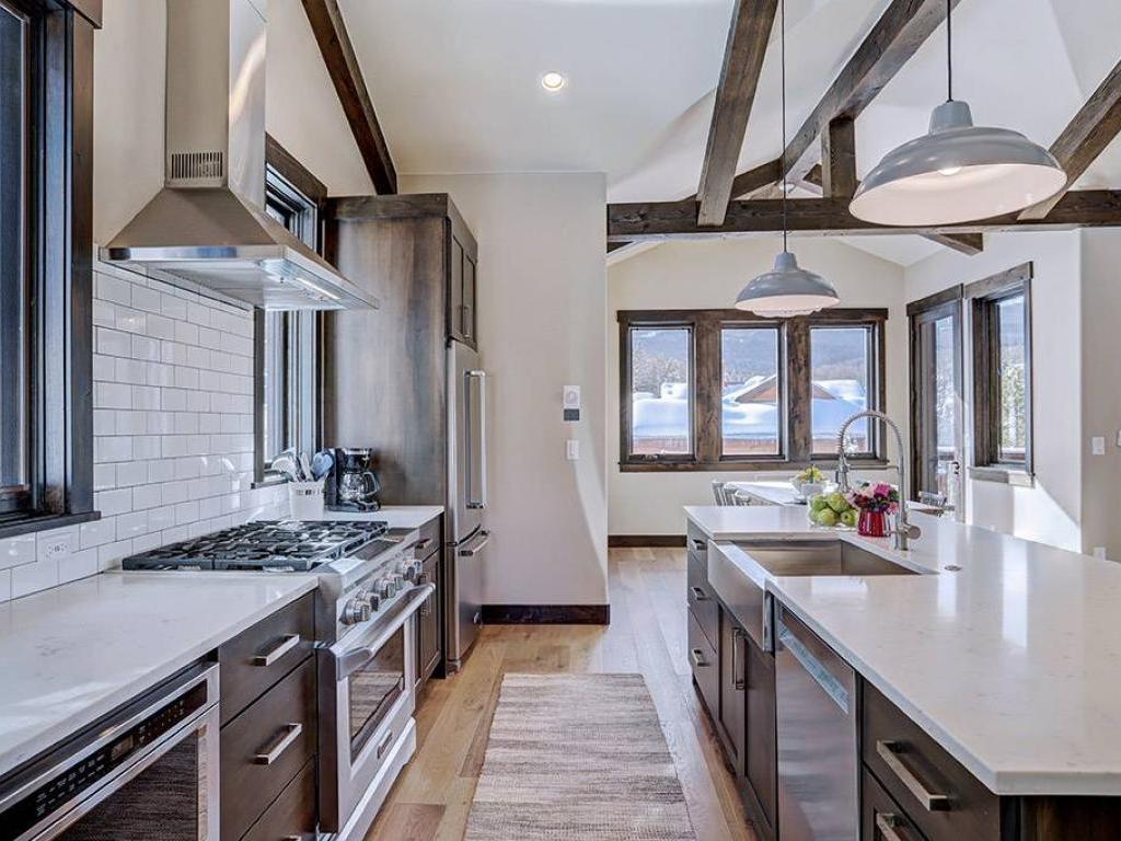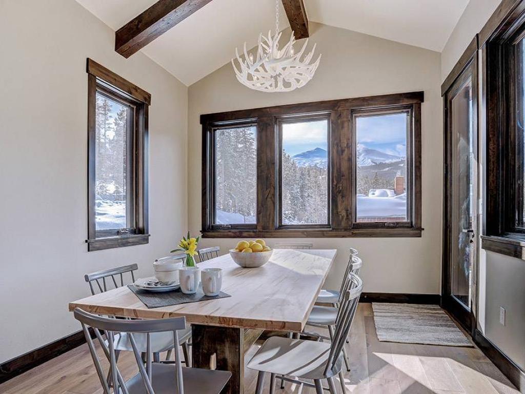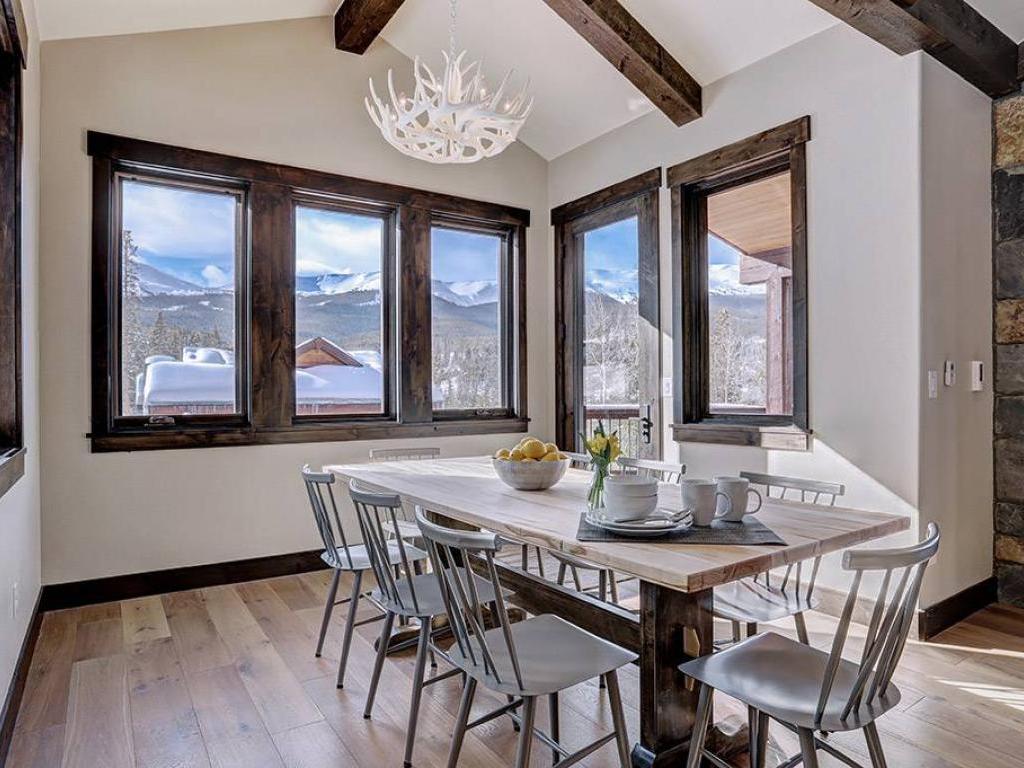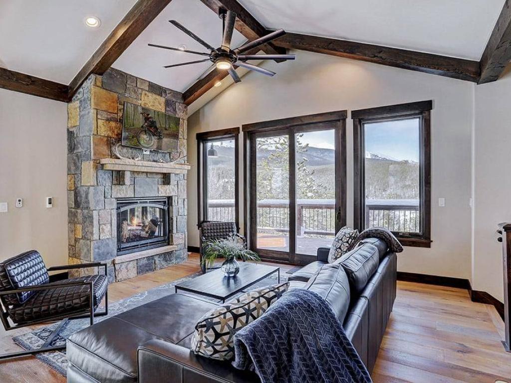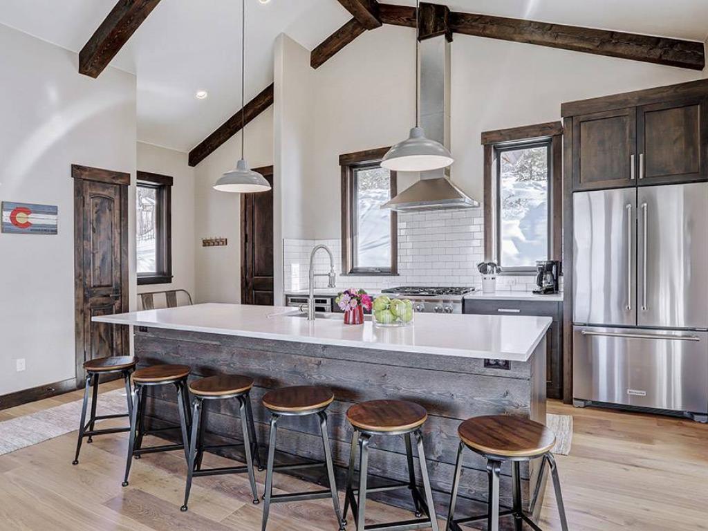 Focused on a gas fireplace and wall-mounted television, with a wall of windows showcasing majestic mountain views, the main level living room in this 3 bedroom, 4.5 vacation home offers comfortable furnishings set under vaulted ceilings. Step out through glass doors to enjoy close-ups of the mountain on the deck, equipped with a barbecue grill, or enjoy a meal at the adjacent dining table with seating for 8 guests. Overlooking the living room and dining area, the refined kitchen is appointed with hgh-end appliances, polished stone countertops and breakfast bar seating for 6 guests.