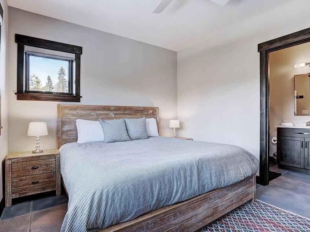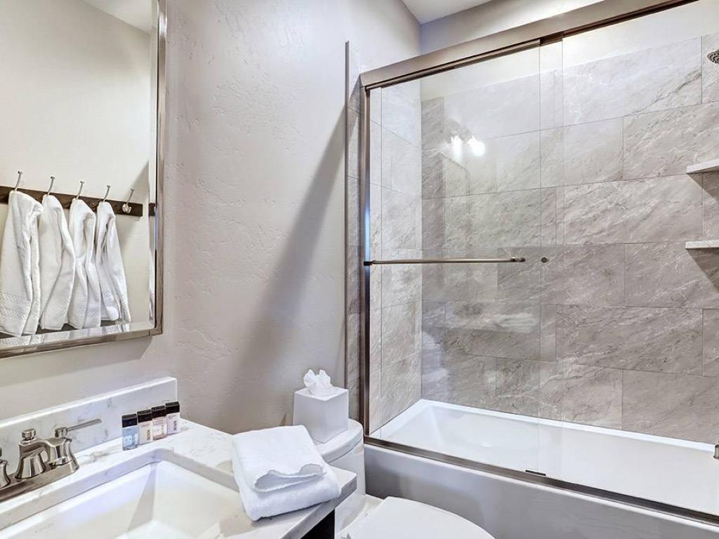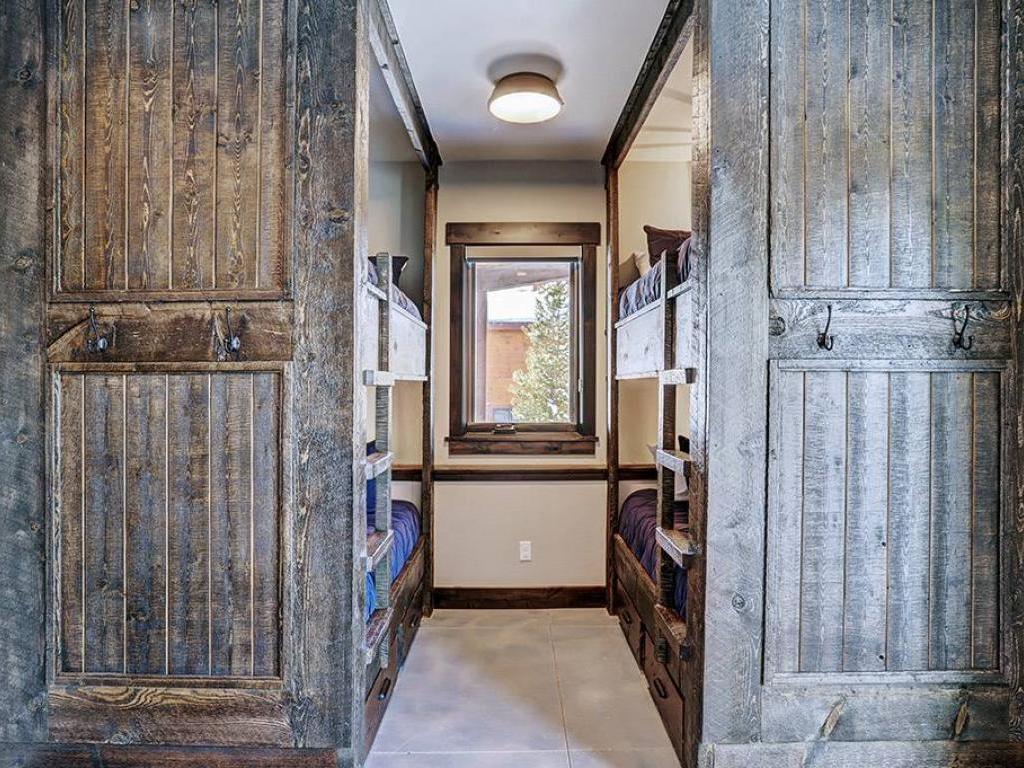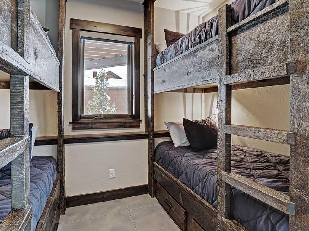 Furnished with a King bed, the main level primary bedroom is set under vaulted ceilings and includes a private bathroom with a dual-sink vanity, soaking tub and walk-in shower. Both lower level bedrooms enjoy private bathrooms, one is appointed with a King bed while the other has a Queen bed. Additional sleeping accommodations are provided by two sets of Twin over Twin bunk beds located in a nook off of the family room.
