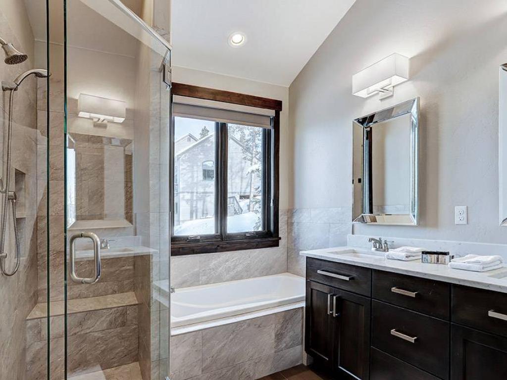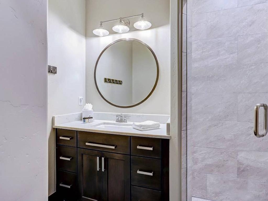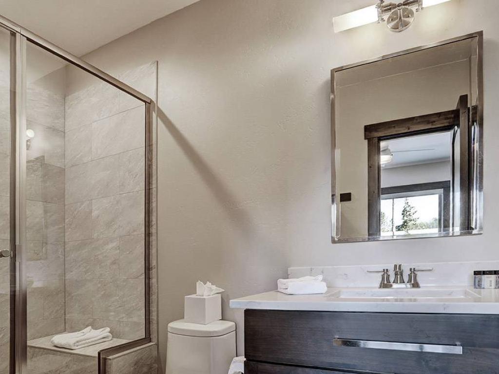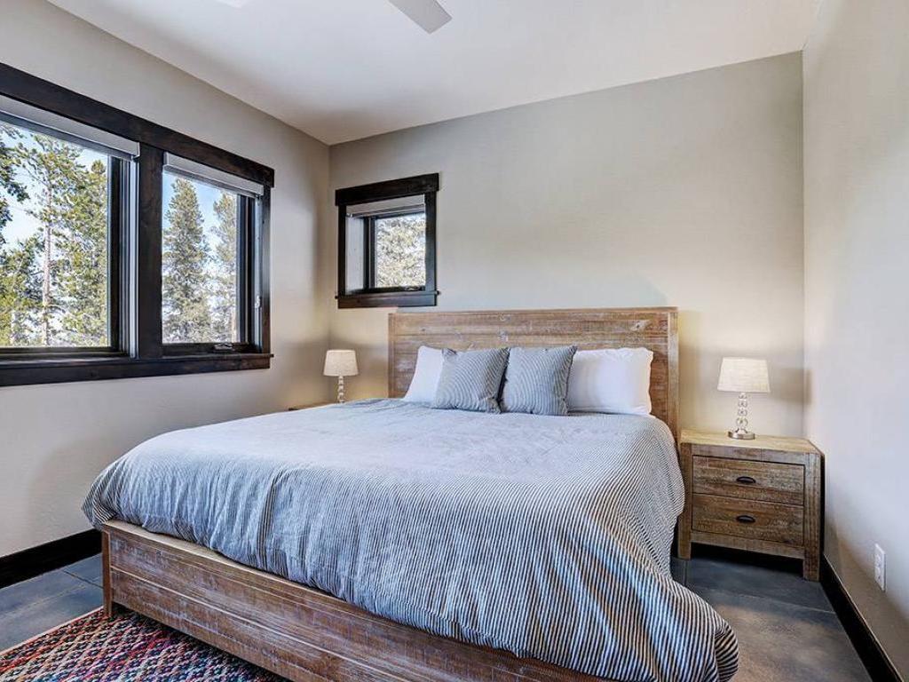 Furnished with a King bed, the main level primary bedroom is set under vaulted ceilings and includes a private bathroom with a dual-sink vanity, soaking tub and walk-in shower. Both lower level bedrooms enjoy private bathrooms, one is appointed with a King bed while the other has a Queen bed. Additional sleeping accommodations are provided by two sets of Twin over Twin bunk beds located in a nook off of the family room.