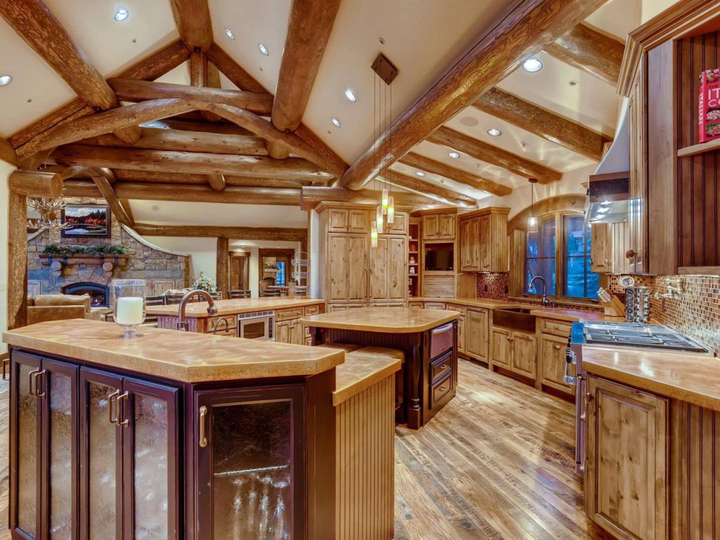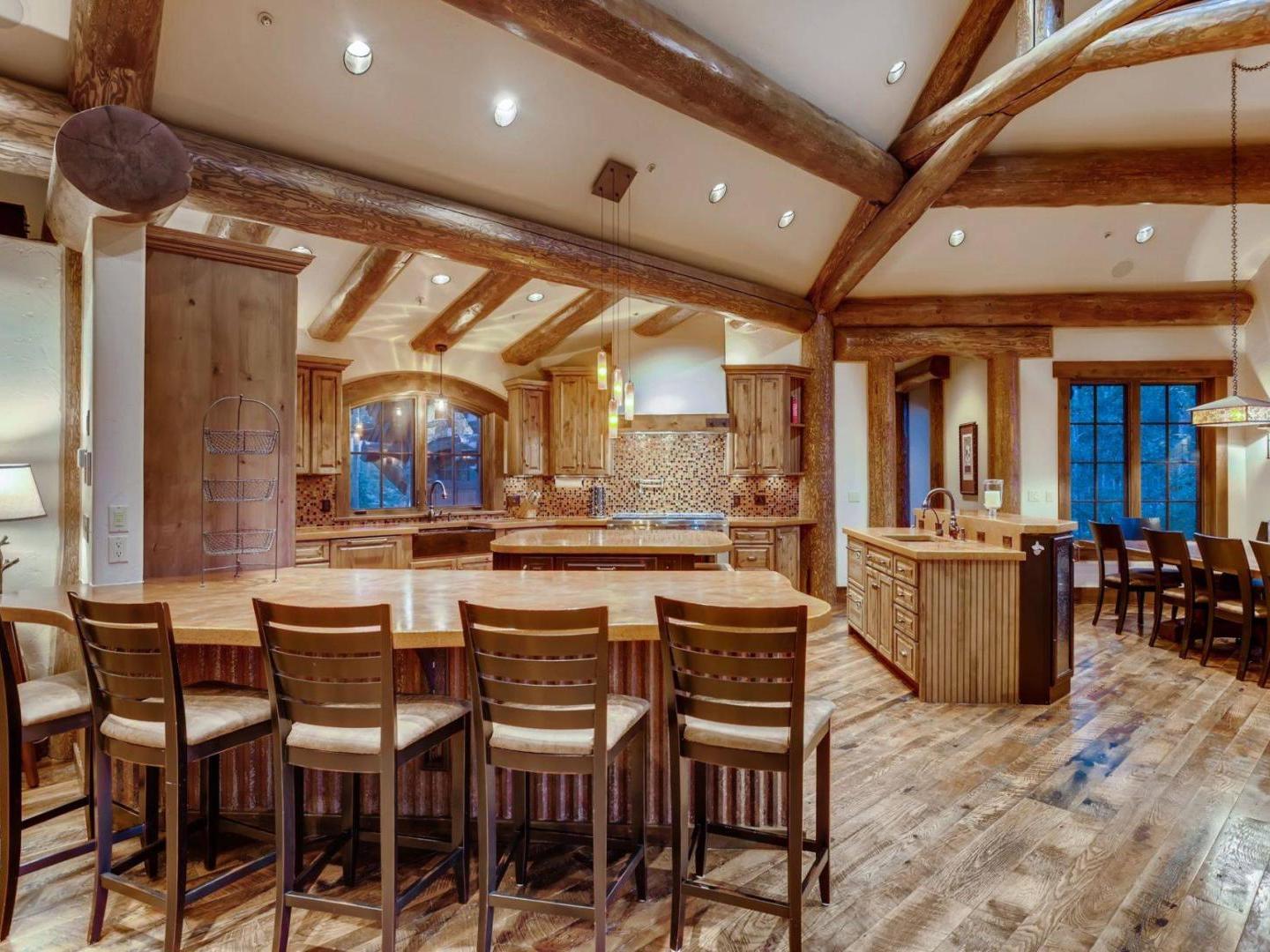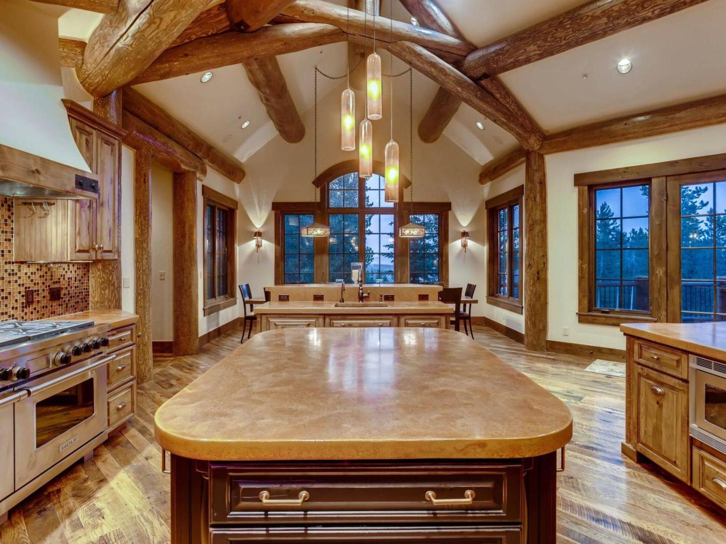 Vaulted ceilings with an array of exposed log beams and massive windows in the main living area creates an amazing space for entertaining. Comfortable furnishings are arranged around a stone fireplace and large television in the living room which sits open to the adjacent gourmet kitchen. Granite countertops and professional grade appliances invite the chefs in the group to prepare tasty meals while still being a part of the action in this open layout. Five chairs at the breakfast bar and seating for twelve in the adjoining dining room framed by windows allow for large dinner parties.