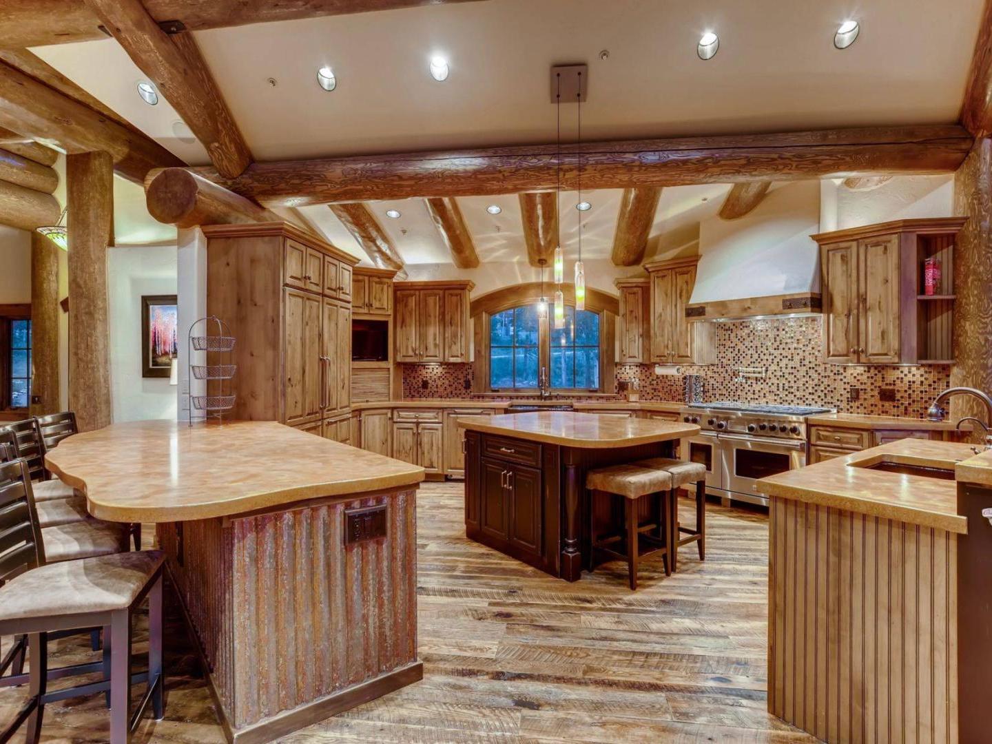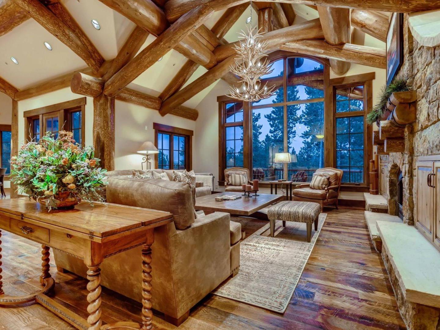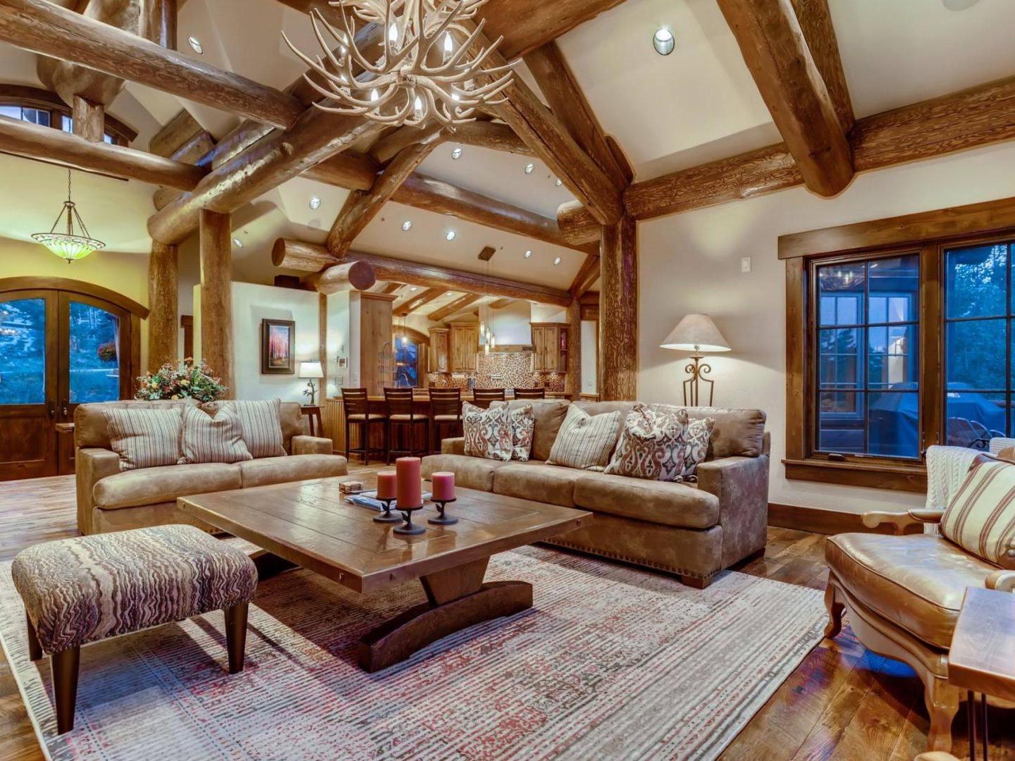 Vaulted ceilings with an array of exposed log beams and massive windows in the main living area creates an amazing space for entertaining. Comfortable furnishings are arranged around a stone fireplace and large television in the living room which sits open to the adjacent gourmet kitchen. Granite countertops and professional grade appliances invite the chefs in the group to prepare tasty meals while still being a part of the action in this open layout. Five chairs at the breakfast bar and seating for twelve in the adjoining dining room framed by windows allow for large dinner parties.
