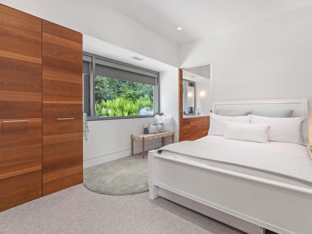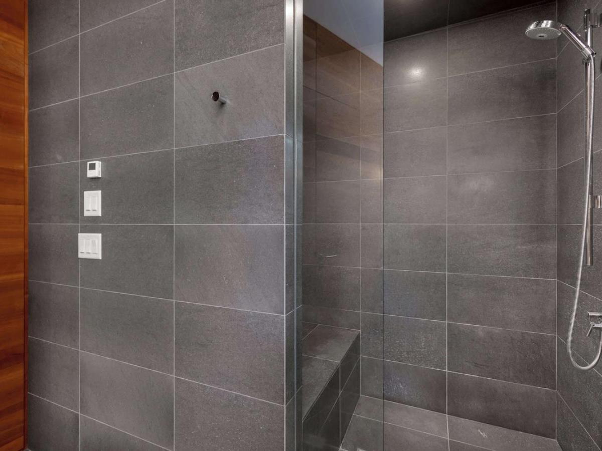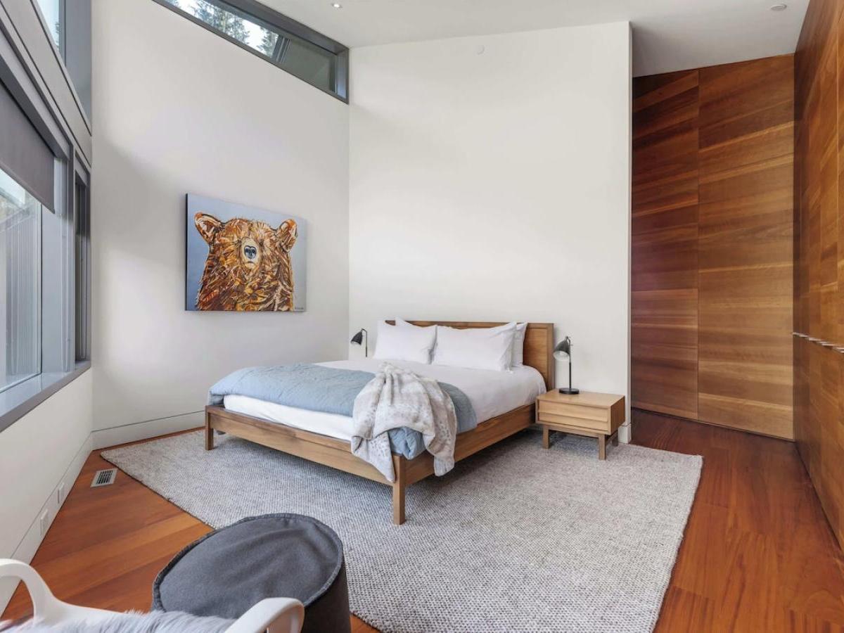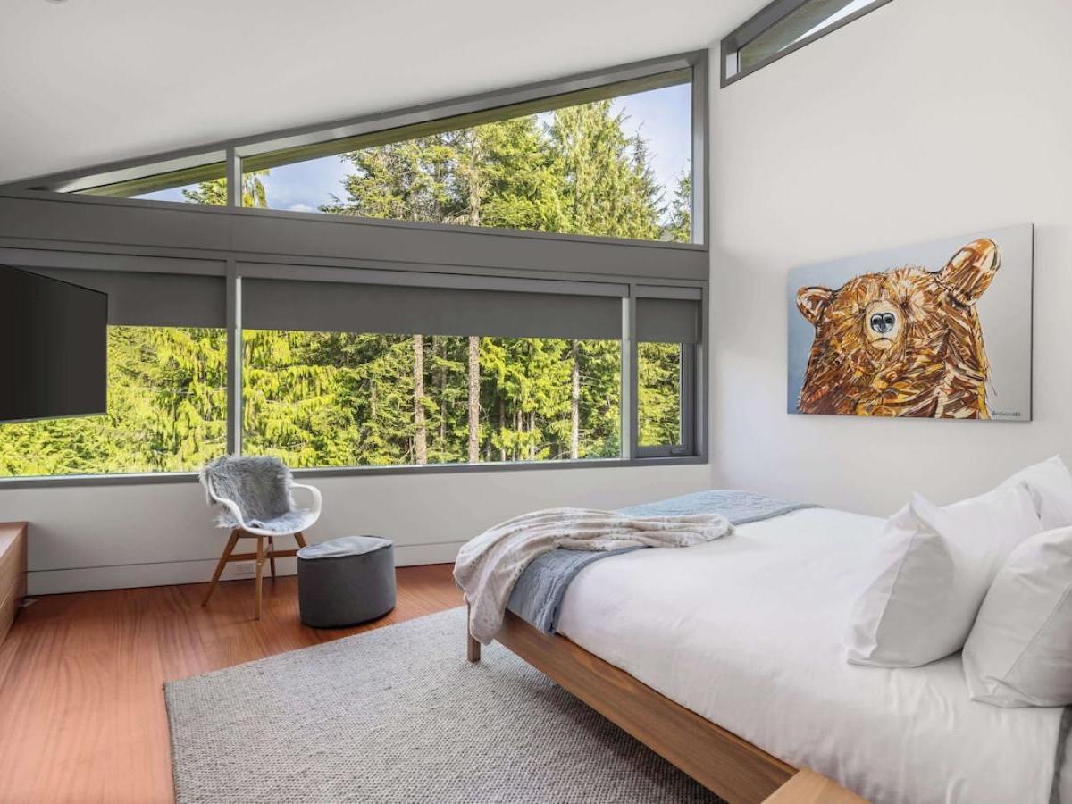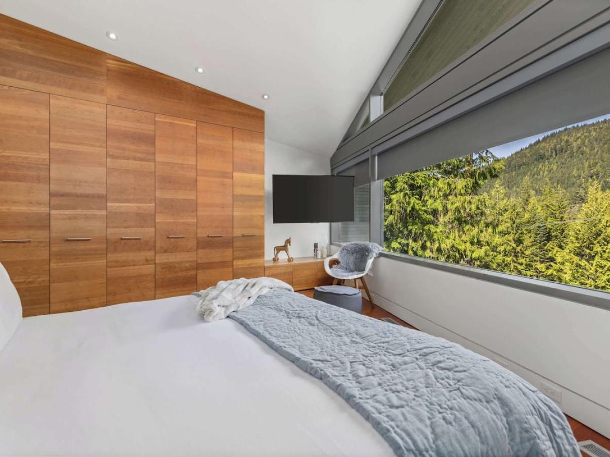 On the main level, the serene primary suite boasts a California King bed, flat-screen TV, and forest views framed by expansive picture windows. The luxurious ensuite bathroom invites indulgence with an oversized soaking tub, steam shower, and spa-like finishes.