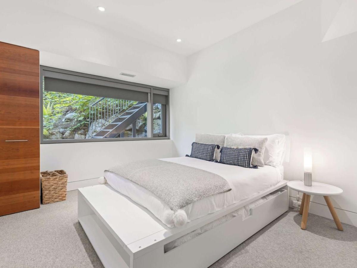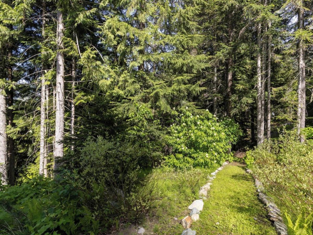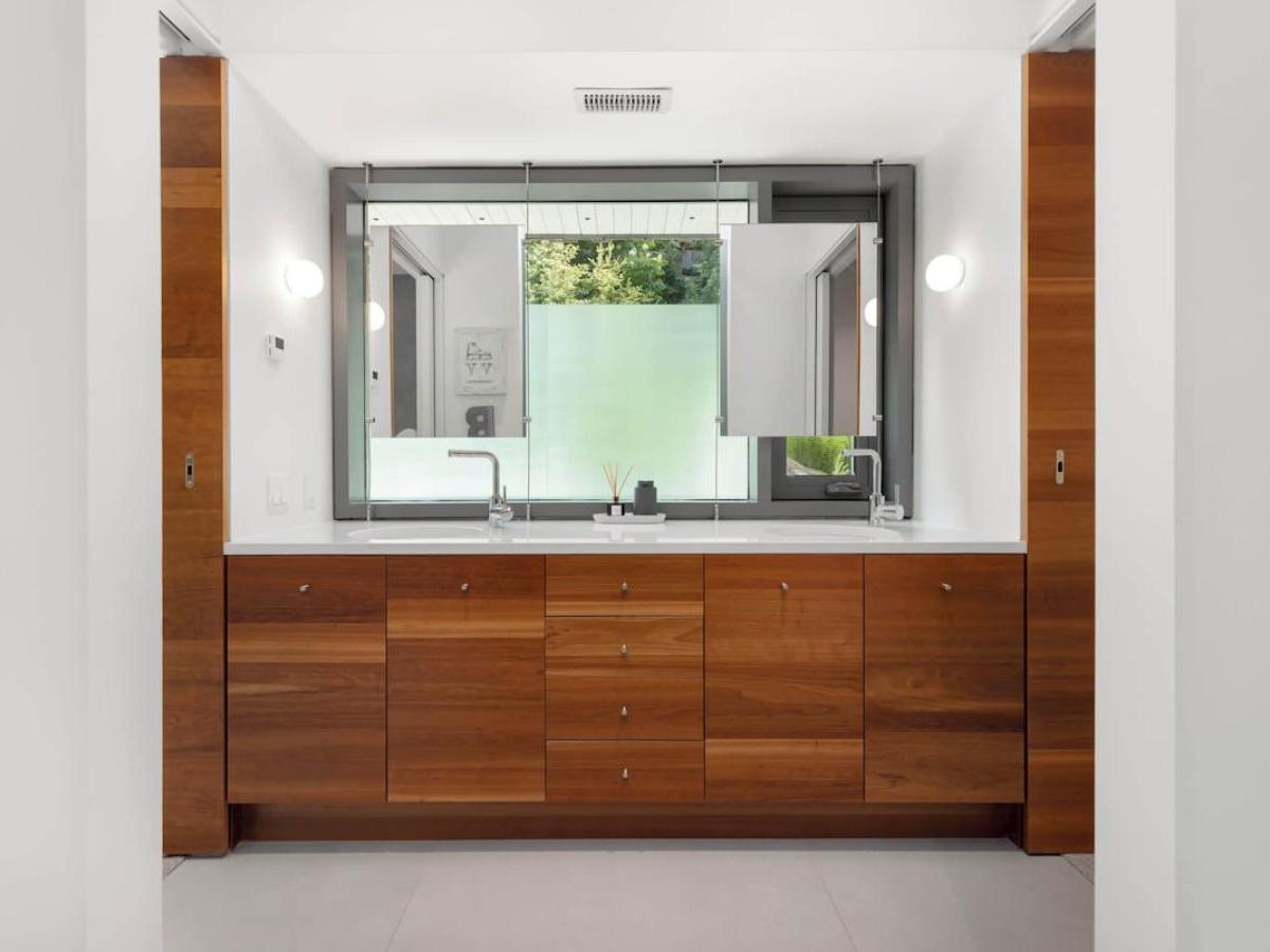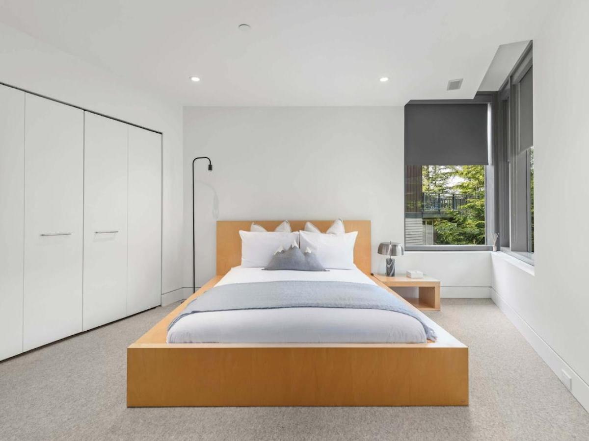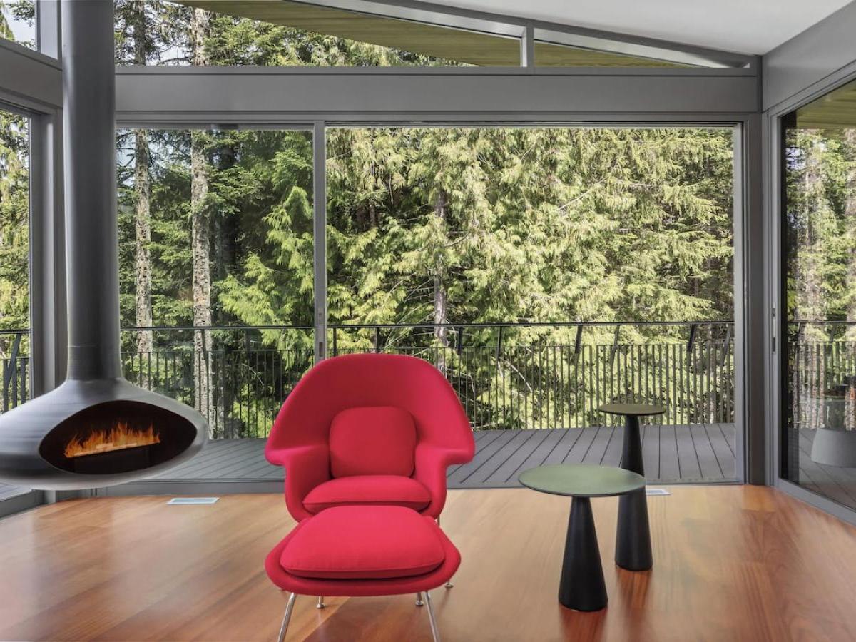 On the main level, the serene primary suite boasts a California King bed, flat-screen TV, and forest views framed by expansive picture windows. The luxurious ensuite bathroom invites indulgence with an oversized soaking tub, steam shower, and spa-like finishes.