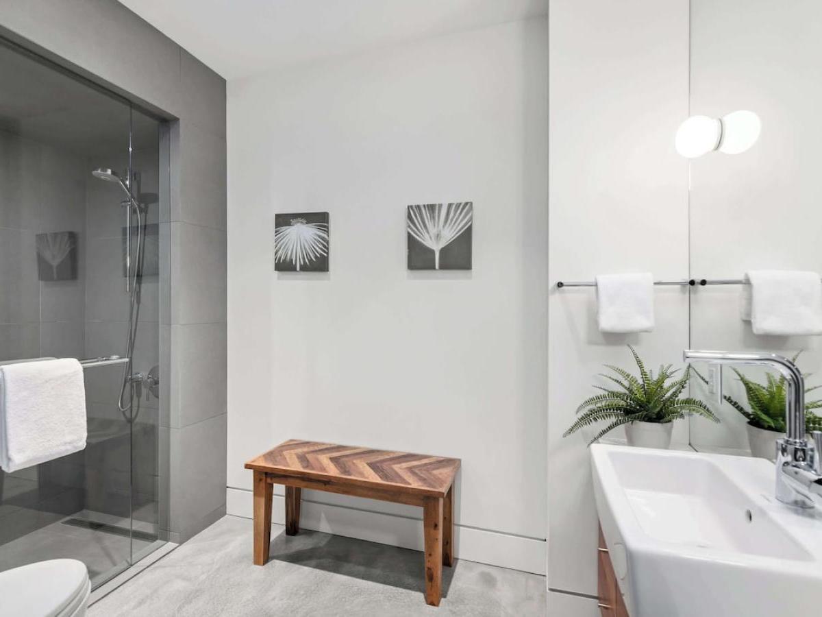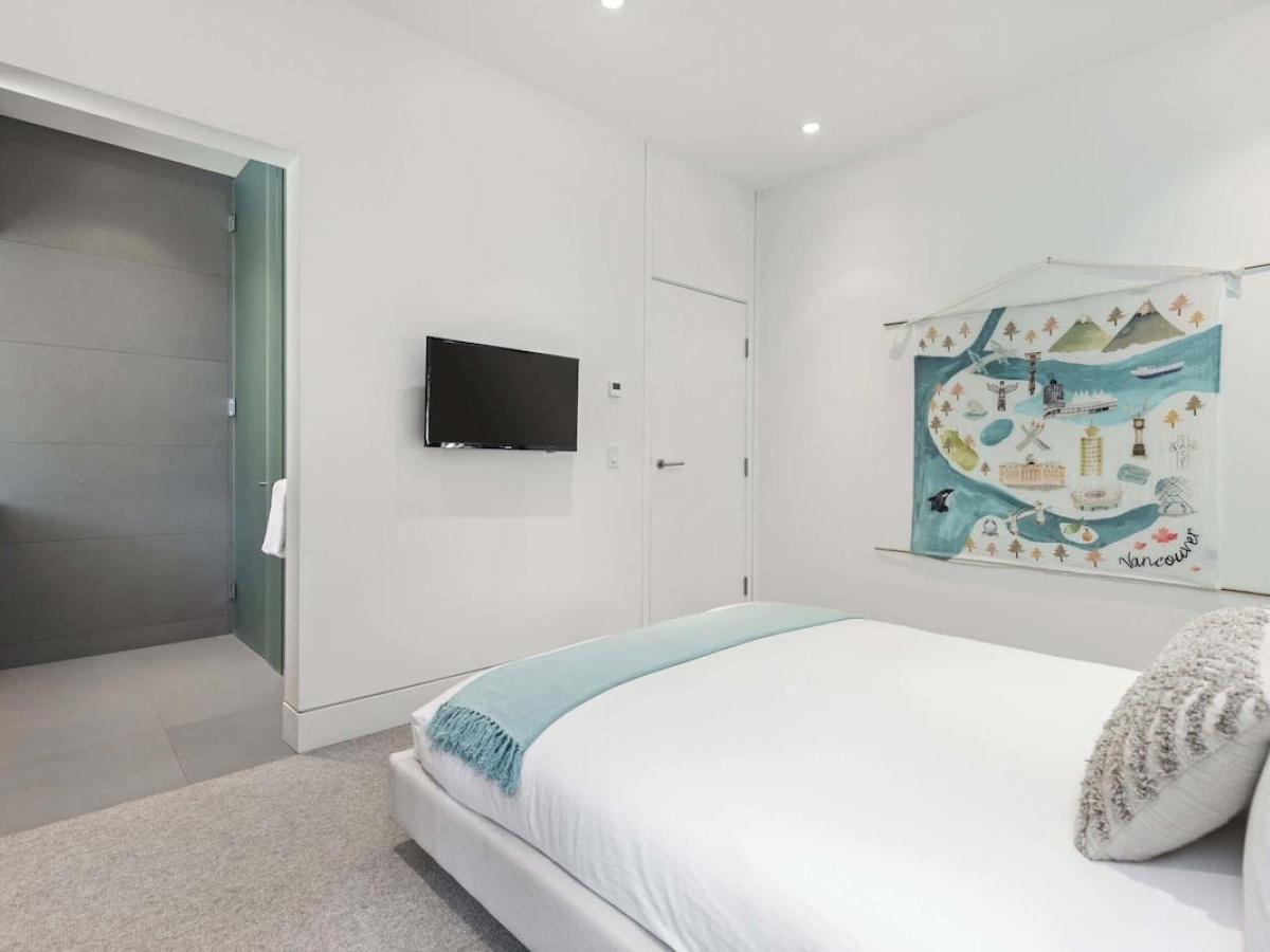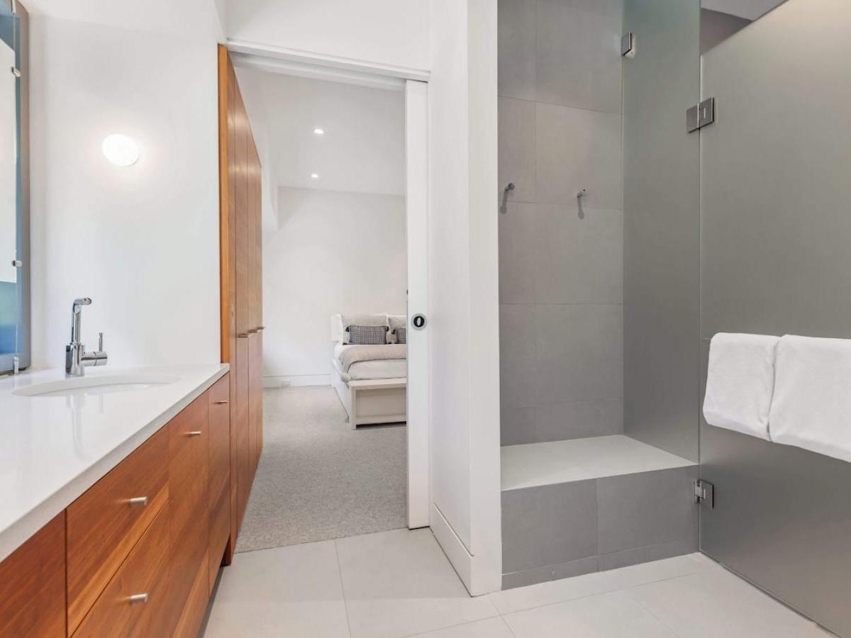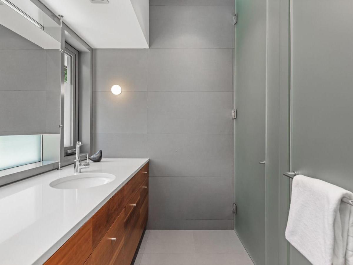 Downstairs, a guest bedroom features a Queen bed and flat-screen TV, conveniently located next to a modern bathroom with a glass-enclosed shower. Two additional guest rooms, each with a Double bed plus a Twin Trundle bed, provide comfortable accommodations for children or extra guests. These rooms share a Jack-and-Jill ensuite complete with a double vanity and walk-in shower. The fifth bedroom offers a Queen bed, flat-screen TV, and a private ensuite with a glass-enclosed shower.