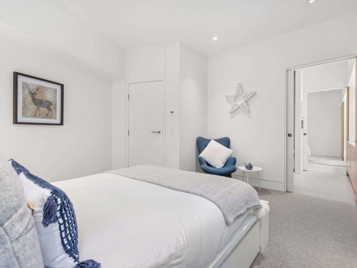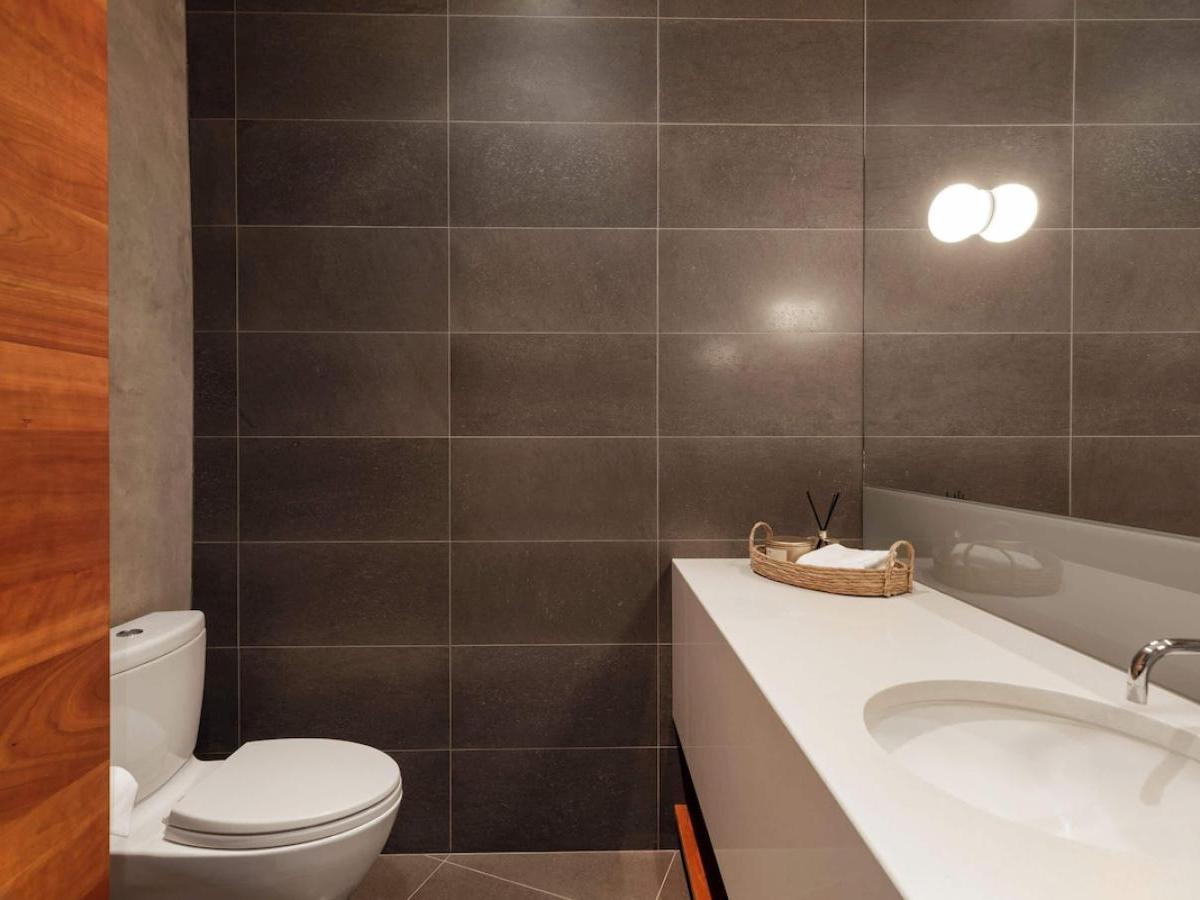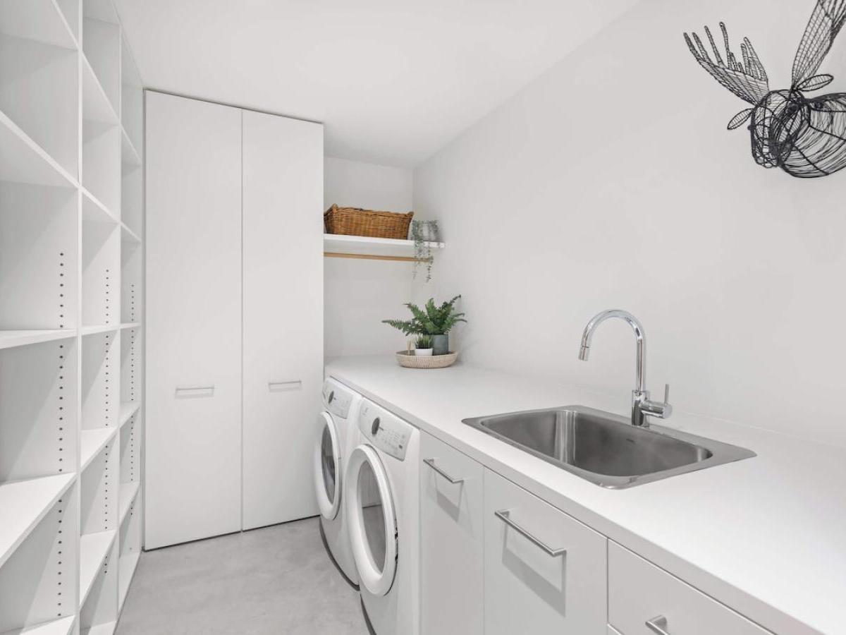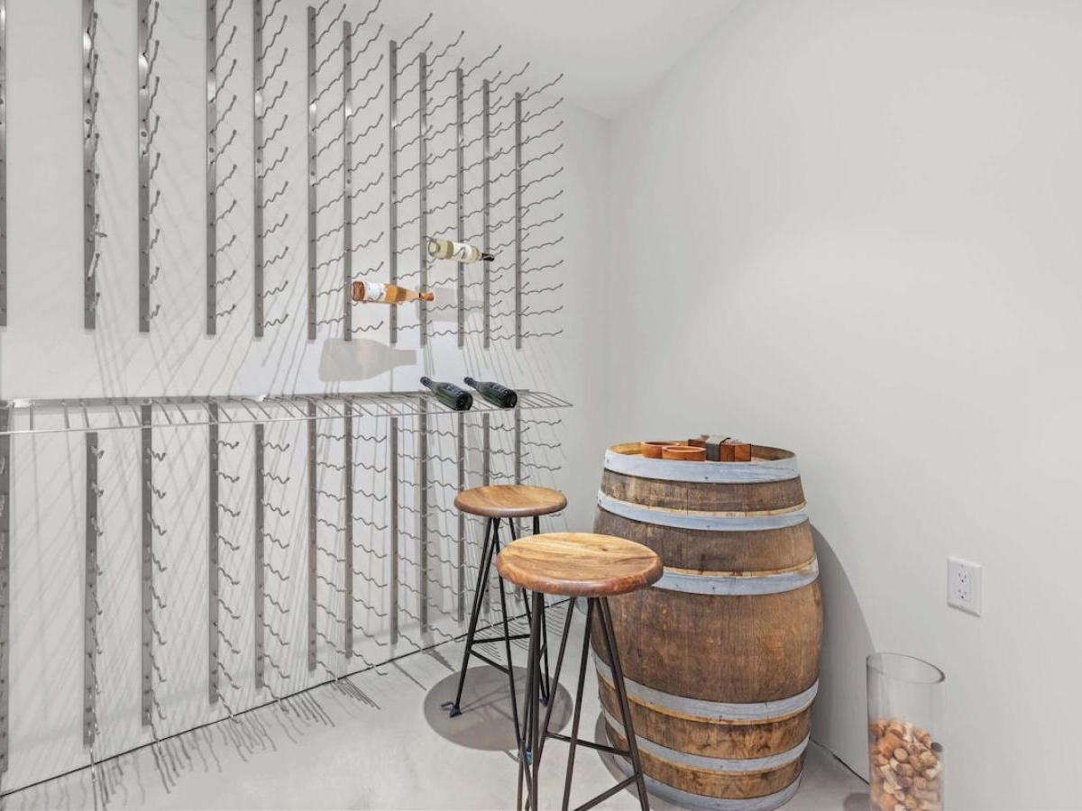 Downstairs, a guest bedroom features a Queen bed and flat-screen TV, conveniently located next to a modern bathroom with a glass-enclosed shower. Two additional guest rooms, each with a Double bed plus a Twin Trundle bed, provide comfortable accommodations for children or extra guests. These rooms share a Jack-and-Jill ensuite complete with a double vanity and walk-in shower. The fifth bedroom offers a Queen bed, flat-screen TV, and a private ensuite with a glass-enclosed shower.