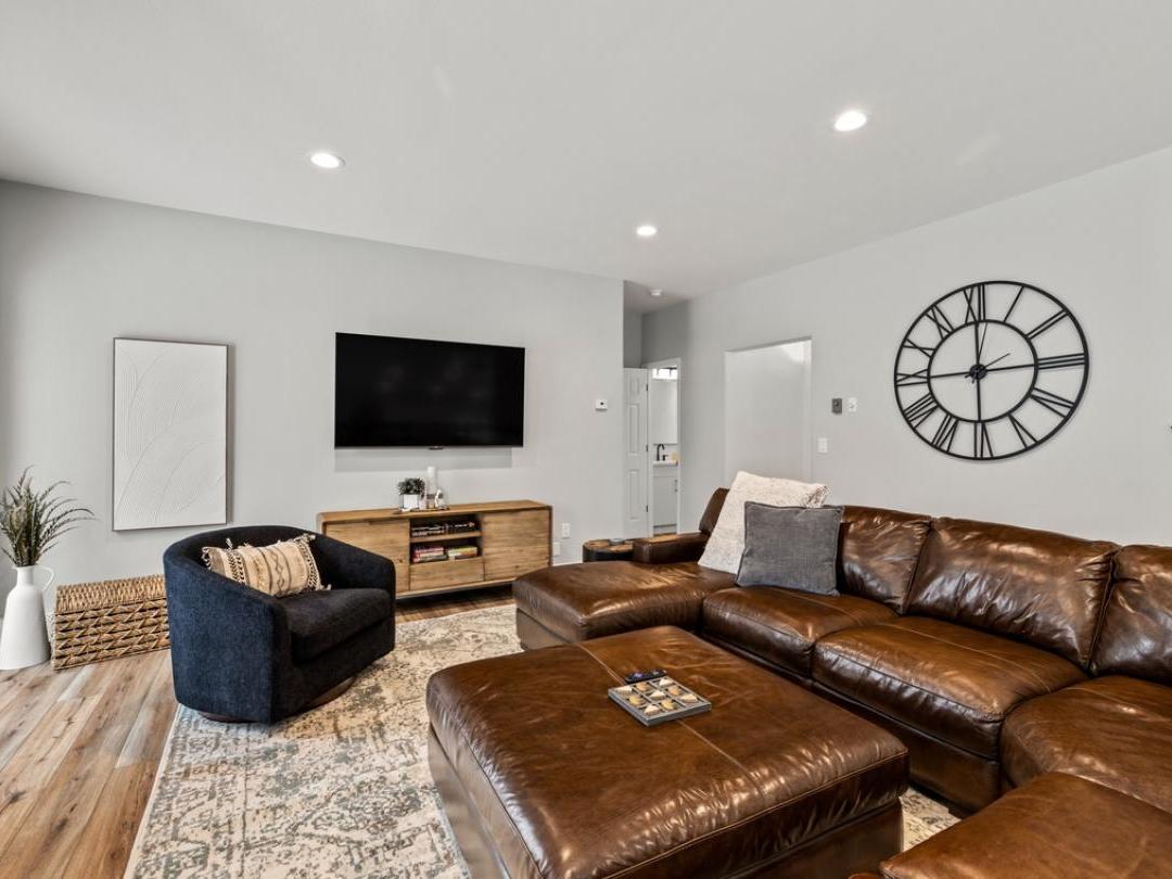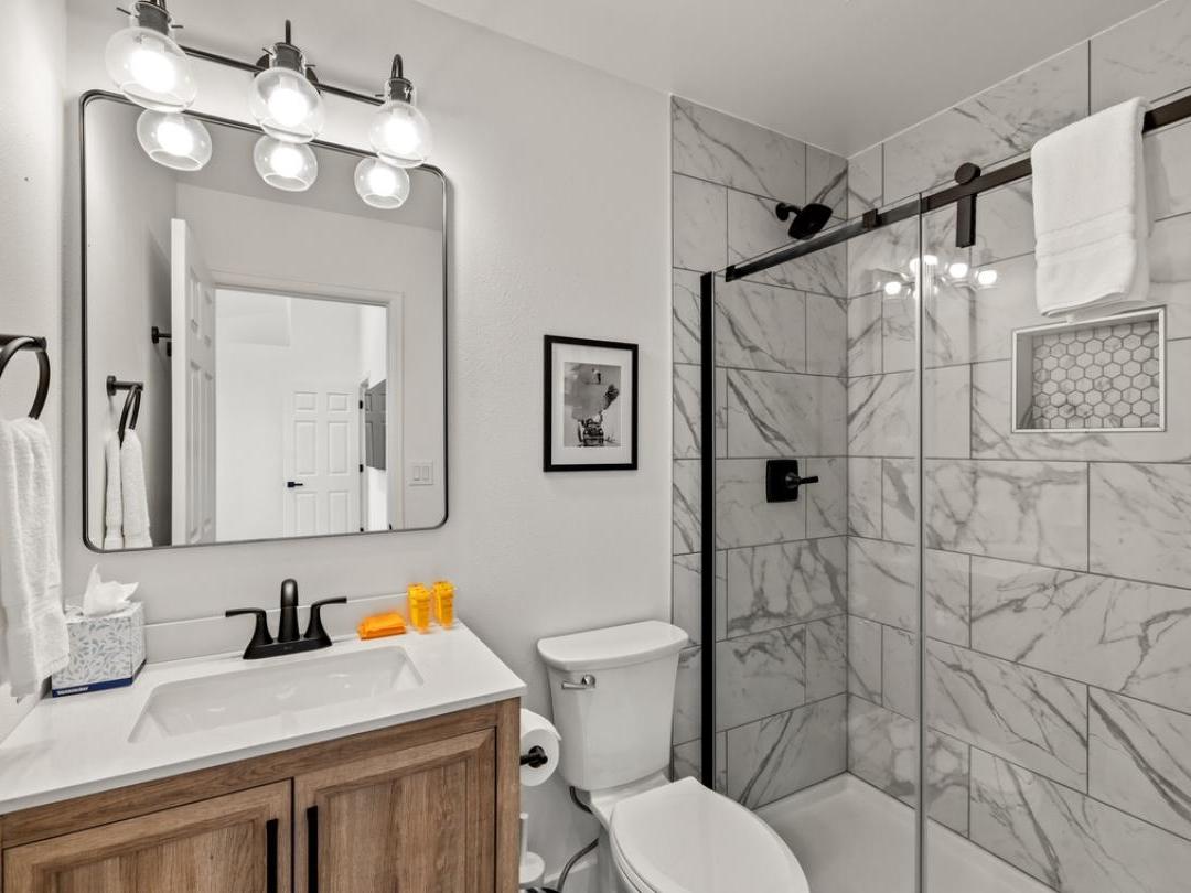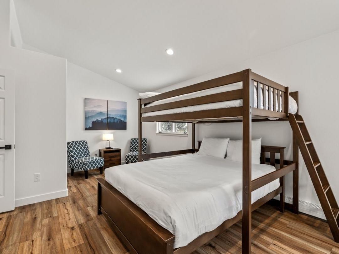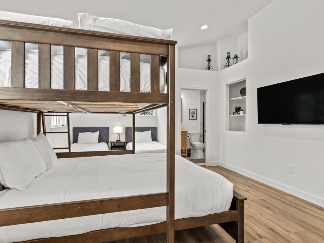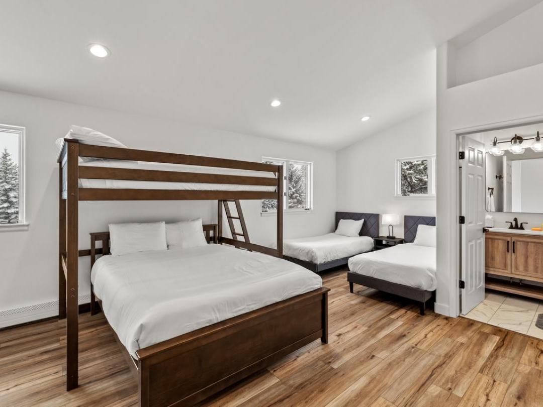 Furnished with a King bed, the main level primary suite is set off of the living room and includes a private bathroom with a dual-sink vanity, soaking tub and walk-in shower. Two upper level guest bedrooms are outfitted with King beds and share a Jack and Jill bathroom with a dual-sink vanity and combination tub/shower. Enjoying a private bathroom, the upper level bunk room is equipped with a Full over Queen bunk bed plus two Twin beds. Two lower level bedrooms share a full bathroom with the family room, one offers a Queen bed while the bunk room has a Twin over Twin bunk plus a Twin bed. Additional sleeping accommodations are provided by a Full Sleeper Sofa in the living room.