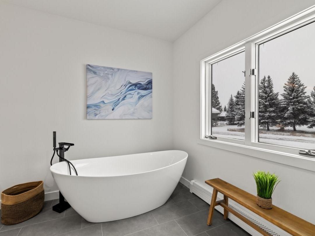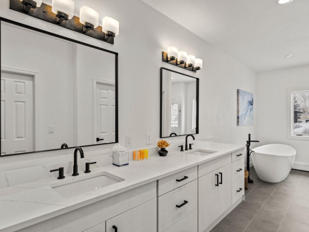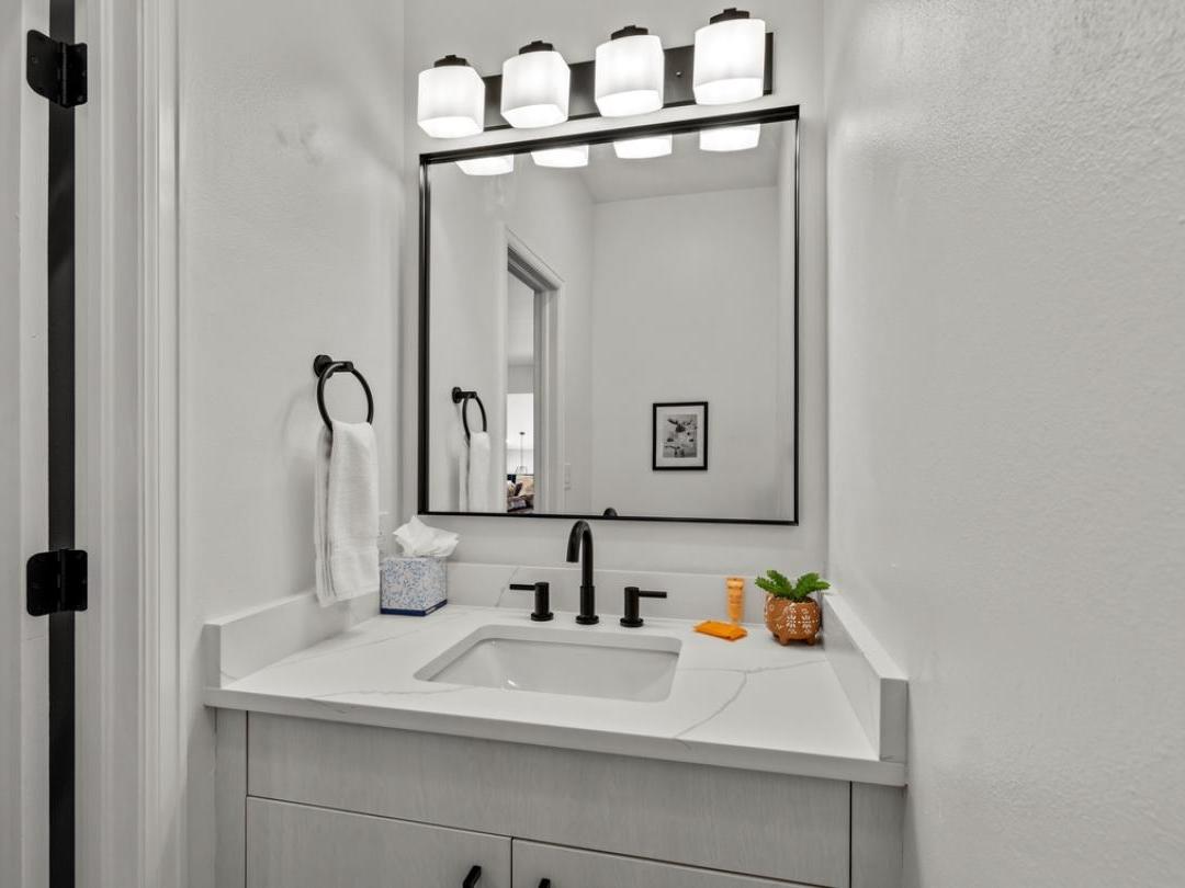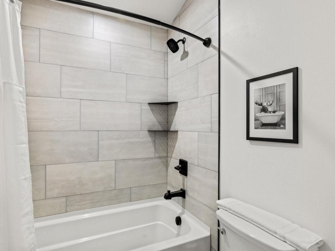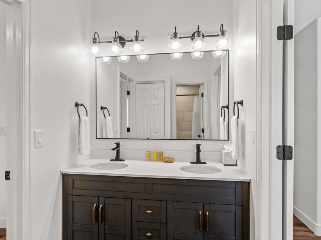 Furnished with a King bed, the main level primary suite is set off of the living room and includes a private bathroom with a dual-sink vanity, soaking tub and walk-in shower. Two upper level guest bedrooms are outfitted with King beds and share a Jack and Jill bathroom with a dual-sink vanity and combination tub/shower. Enjoying a private bathroom, the upper level bunk room is equipped with a Full over Queen bunk bed plus two Twin beds. Two lower level bedrooms share a full bathroom with the family room, one offers a Queen bed while the bunk room has a Twin over Twin bunk plus a Twin bed. Additional sleeping accommodations are provided by a Full Sleeper Sofa in the living room.