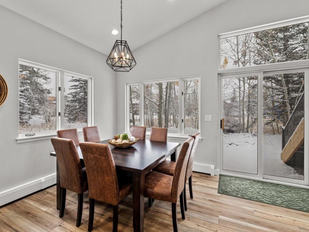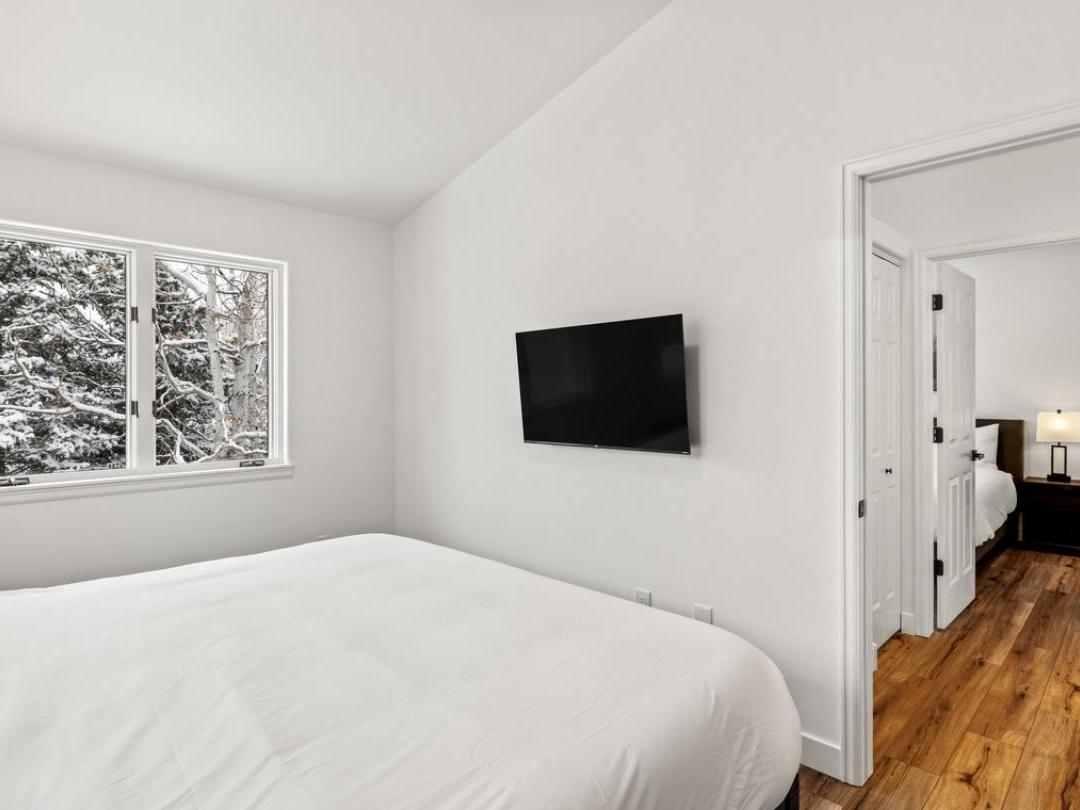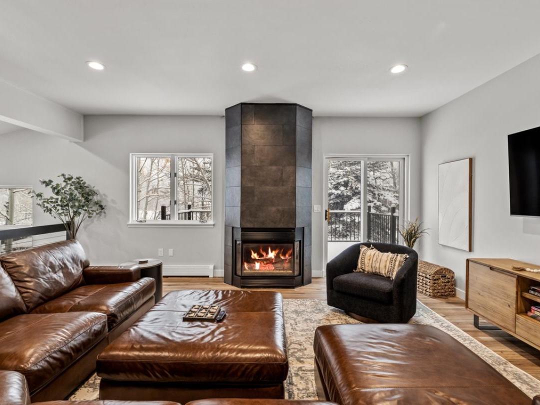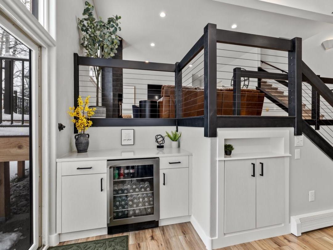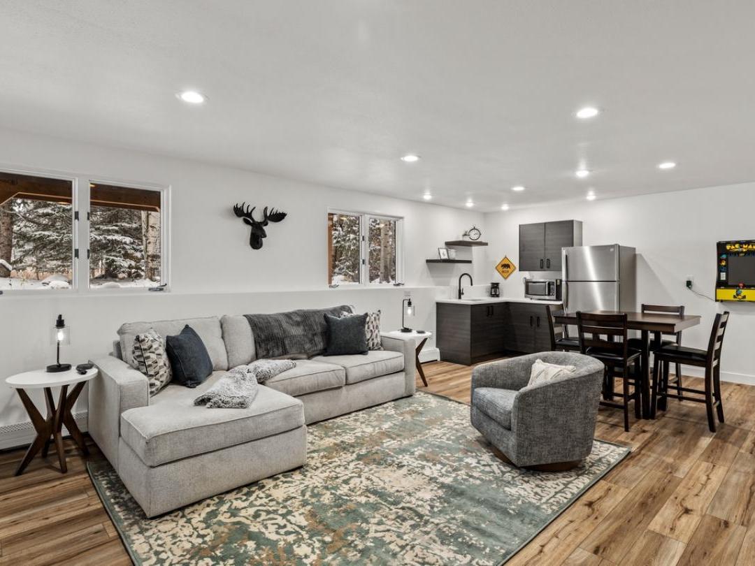 Head to the lower level to find an expansive family room with a comfortably furnished sitting area in front of a wall-mounted television, Pac-Man video game, wet bar with a fridge and microwave and dining/game table. A half level up is the gear area with benches and plenty of hooks for all of your outdoor adventure accessories. Getting to the slopes and downtown is convenient with the free bus stop a block away and on-call complimentary shuttle service during the winter season.