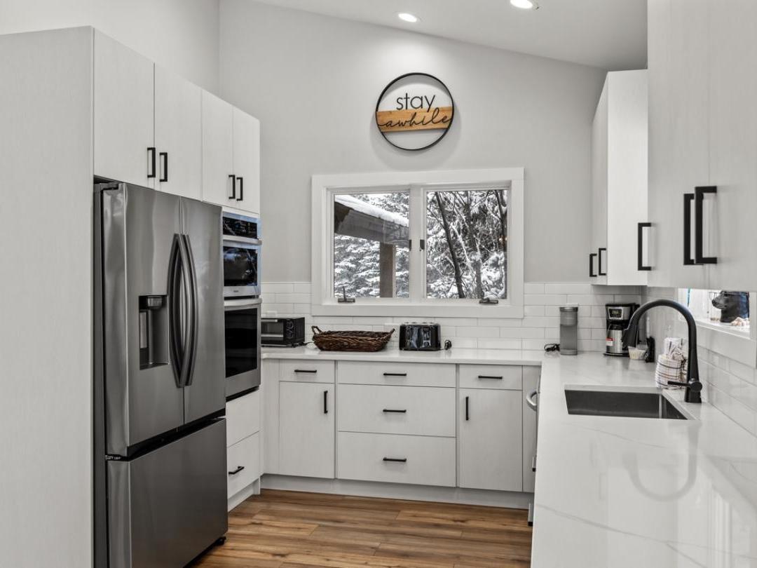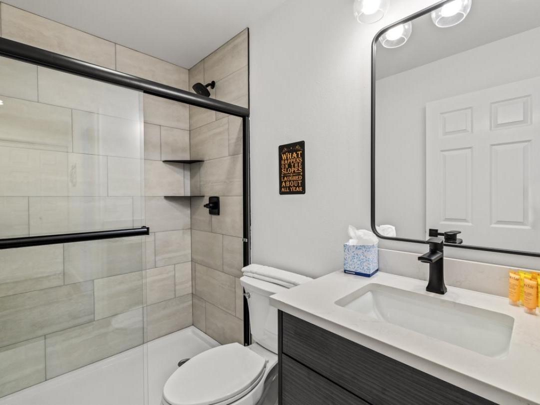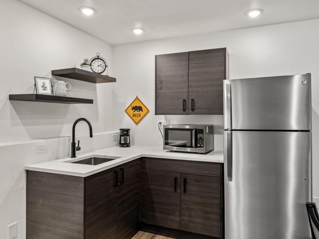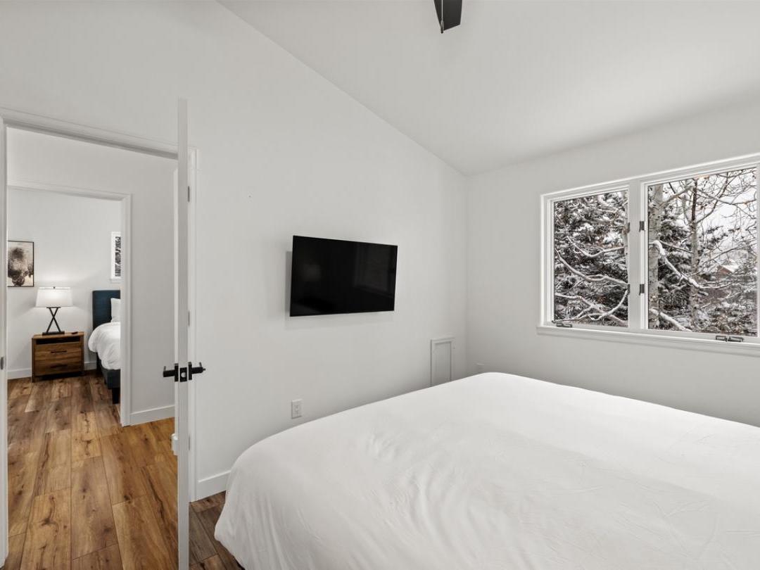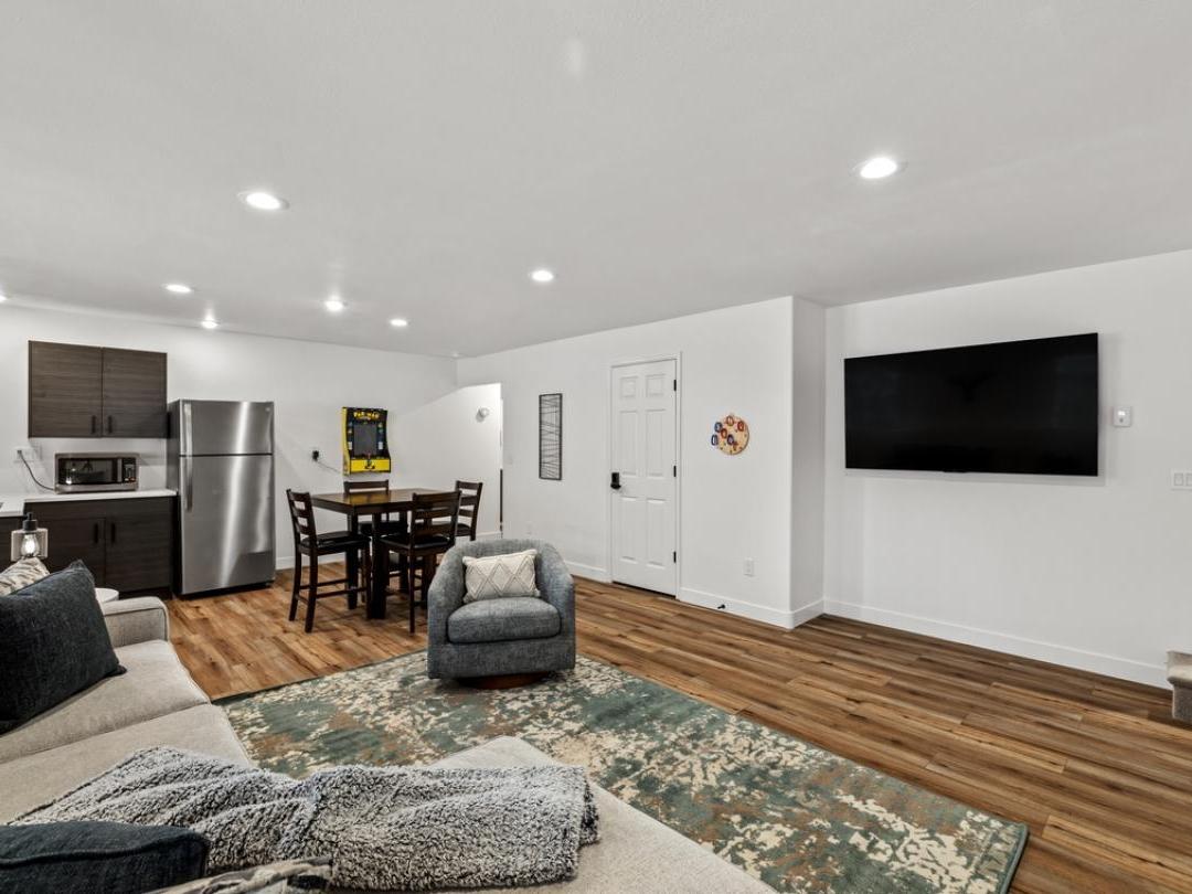 Head to the lower level to find an expansive family room with a comfortably furnished sitting area in front of a wall-mounted television, Pac-Man video game, wet bar with a fridge and microwave and dining/game table. A half level up is the gear area with benches and plenty of hooks for all of your outdoor adventure accessories. Getting to the slopes and downtown is convenient with the free bus stop a block away and on-call complimentary shuttle service during the winter season.