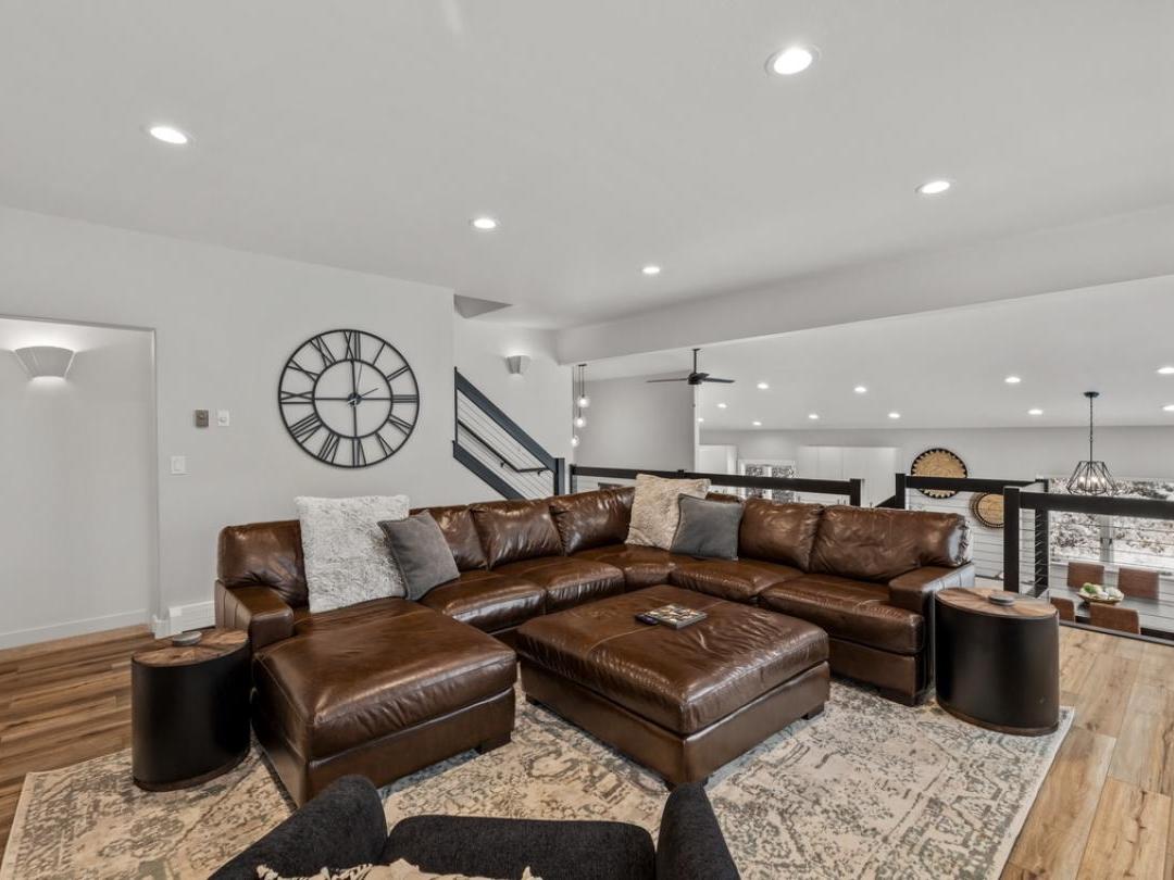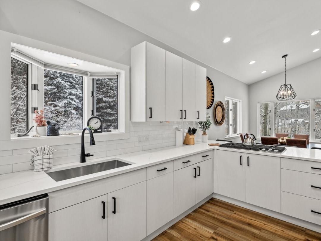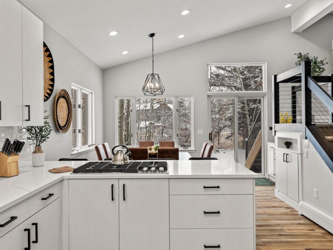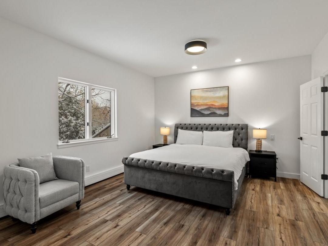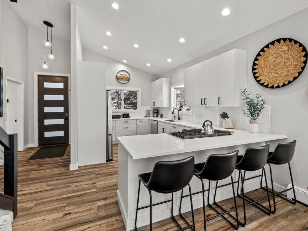 Head to the lower level to find an expansive family room with a comfortably furnished sitting area in front of a wall-mounted television, Pac-Man video game, wet bar with a fridge and microwave and dining/game table. A half level up is the gear area with benches and plenty of hooks for all of your outdoor adventure accessories. Getting to the slopes and downtown is convenient with the free bus stop a block away and on-call complimentary shuttle service during the winter season.