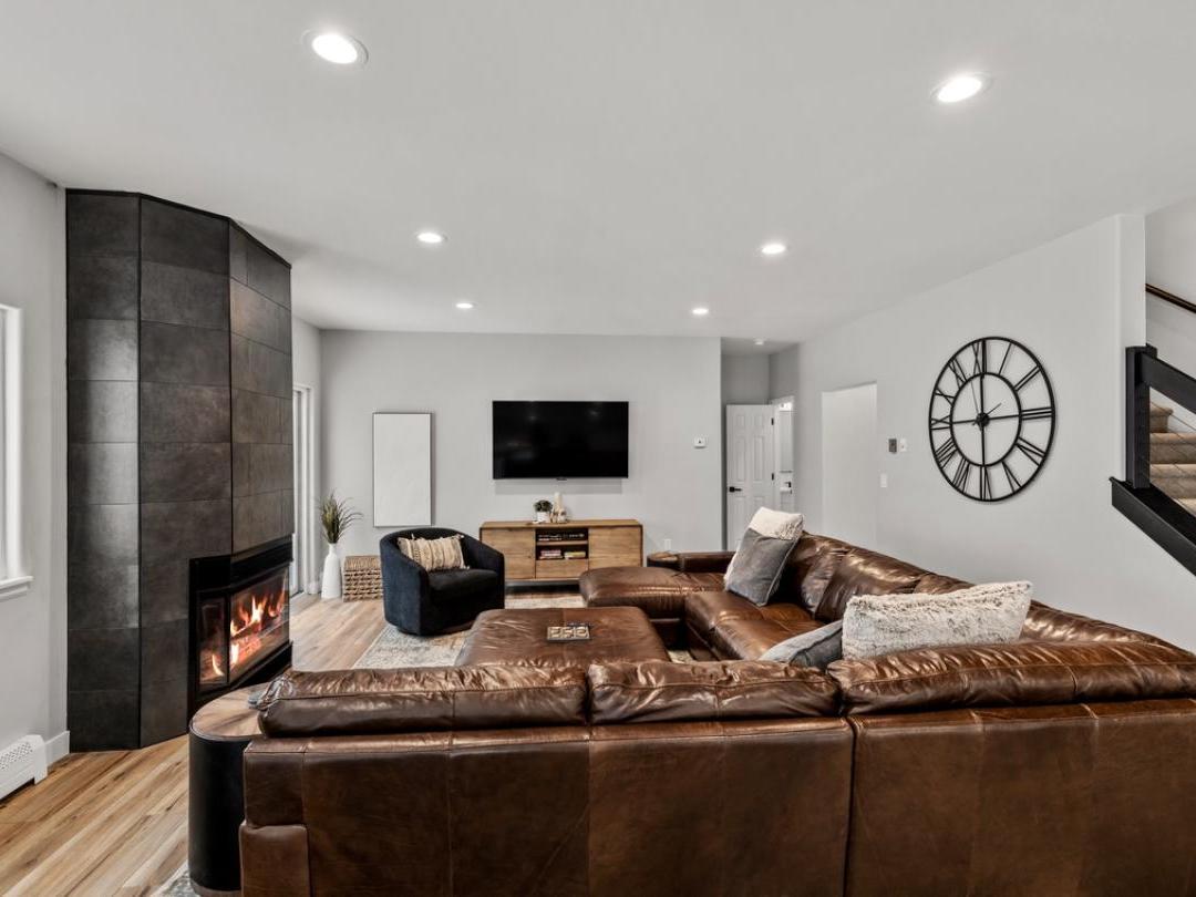 Featuring a unique layout, the living room of this 6 bedroom, 4.5 bathroom duplex vacation home offers a large leather sofa arranged in front of a gas fireplace and wall-mounted television. Set a half level below yet open to the living room, the fully equipped kitchen is appointed with stainless steel appliances, polished-stone countertops, breakfast bar seating for 4 guests and a dining area seating 8 guests. Glass doors in the dining area lead out to the back patio boasting a private hot tub and a barbecue grill.