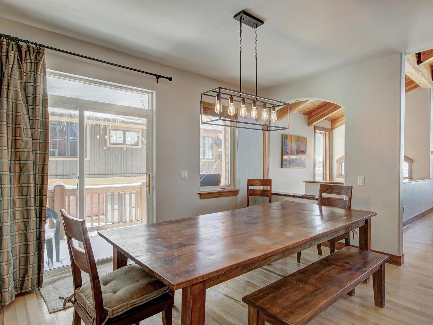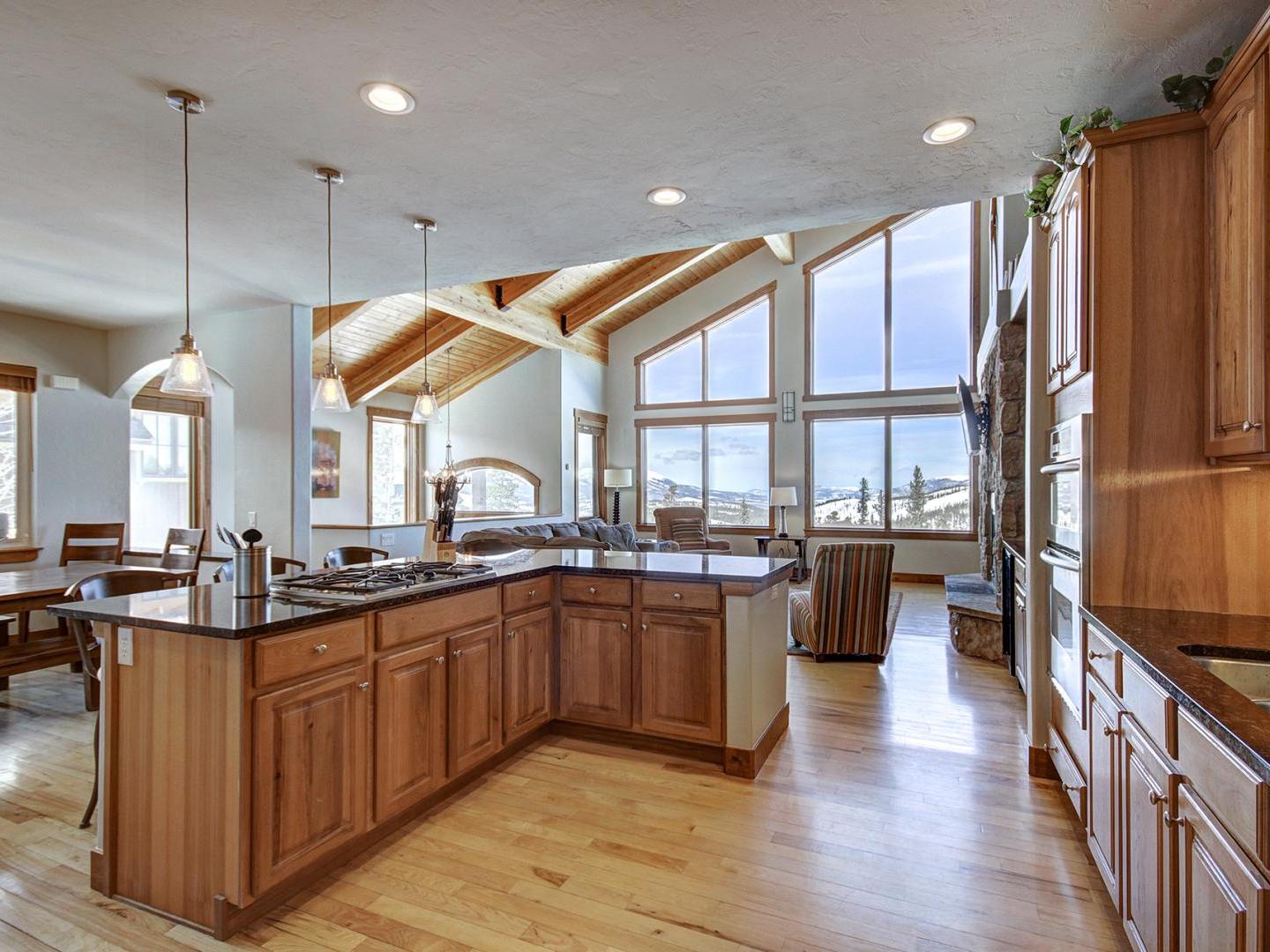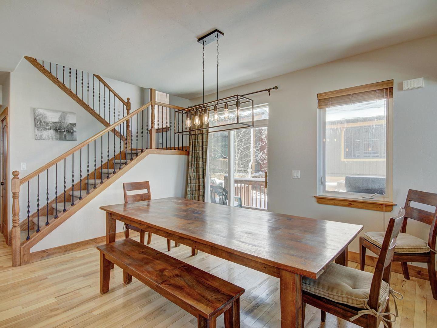 Breckenridge's breathtaking mountains form the backdrop in the living room of this 4 bedroom duplex vacation home with 3.5 bathrooms where the entire group can relax on comfortable furnishings set under vaulted ceilings and in front of a gas fireplace and television. This space flows into the upscale kitchen appointed with stainless steel appliances, granite countertops and a breakfast bar seating 4 guests. Ten guests can be accommodated at the adjacent dining table, with bench and chair seating, which includes access to the deck, outfitted with a barbecue grill.