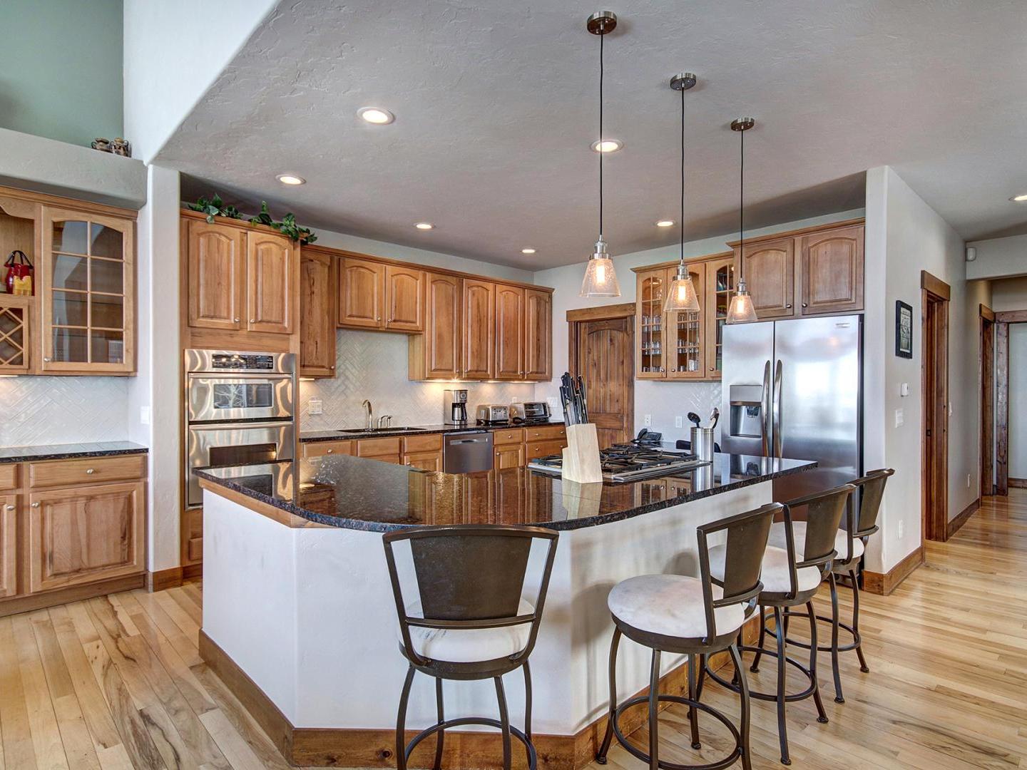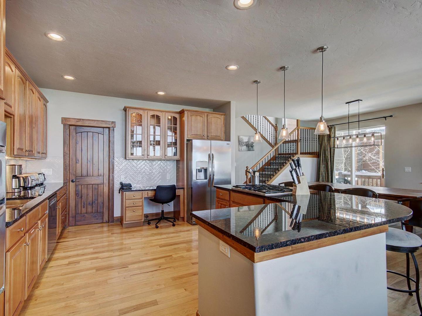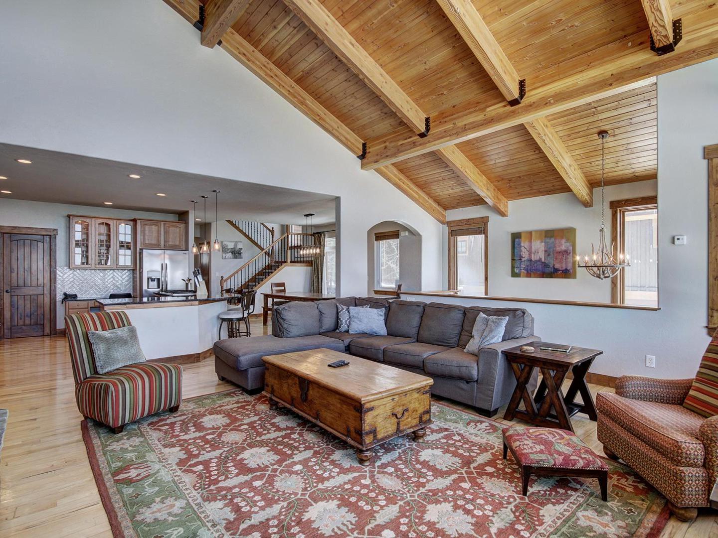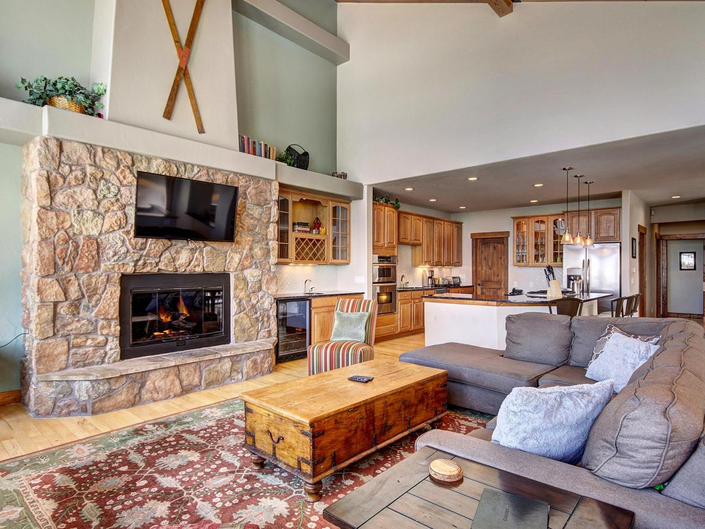 Breckenridge's breathtaking mountains form the backdrop in the living room of this 4 bedroom duplex vacation home with 3.5 bathrooms where the entire group can relax on comfortable furnishings set under vaulted ceilings and in front of a gas fireplace and television. This space flows into the upscale kitchen appointed with stainless steel appliances, granite countertops and a breakfast bar seating 4 guests. Ten guests can be accommodated at the adjacent dining table, with bench and chair seating, which includes access to the deck, outfitted with a barbecue grill.