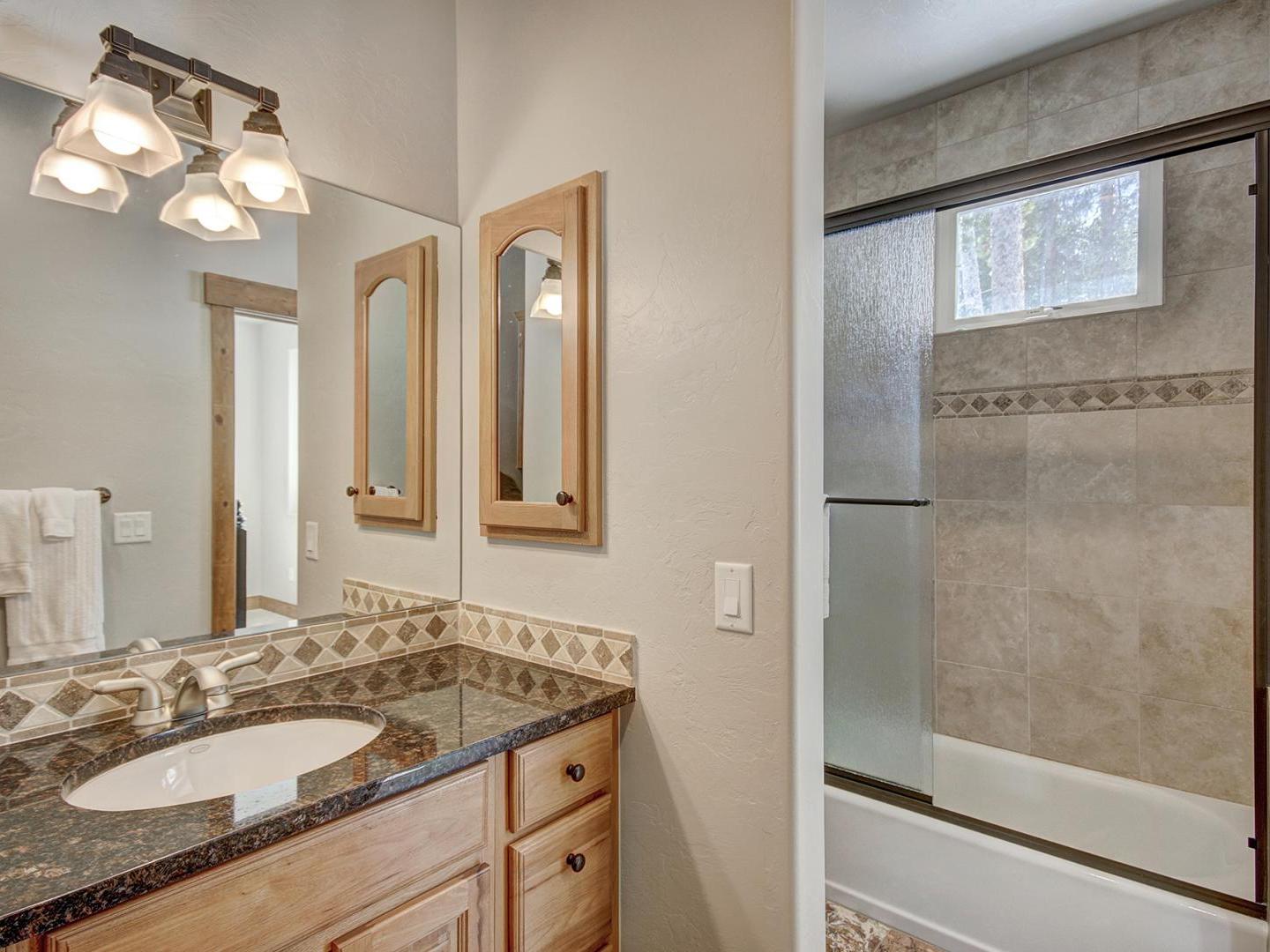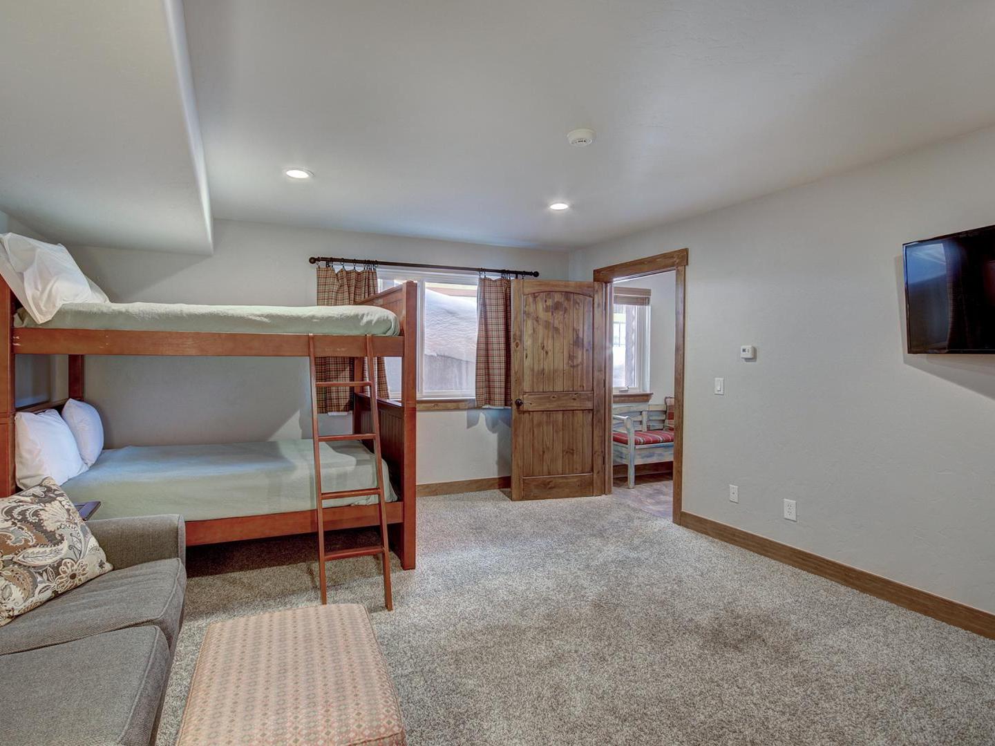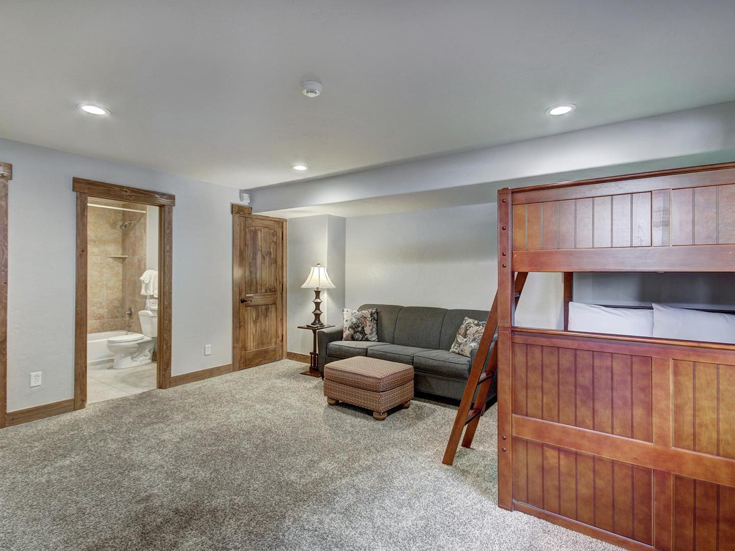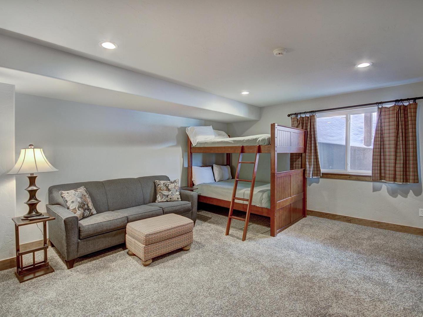 Occupying the upper level, the primary bedroom is furnished with a King bed and includes a private bathroom boasting a dual-sink vanity, jetted tub and walk-in shower. Two main level bedrooms share a Jack and Jill bathroom, one offers a Queen bed while the other is equipped with two Twin beds that each have Twin trundle beds that pull out from underneath. Located on the lower level is the bunk room appointed with a Full over Full bunk bed plus a Queen sleeper sofa and a private bathroom.