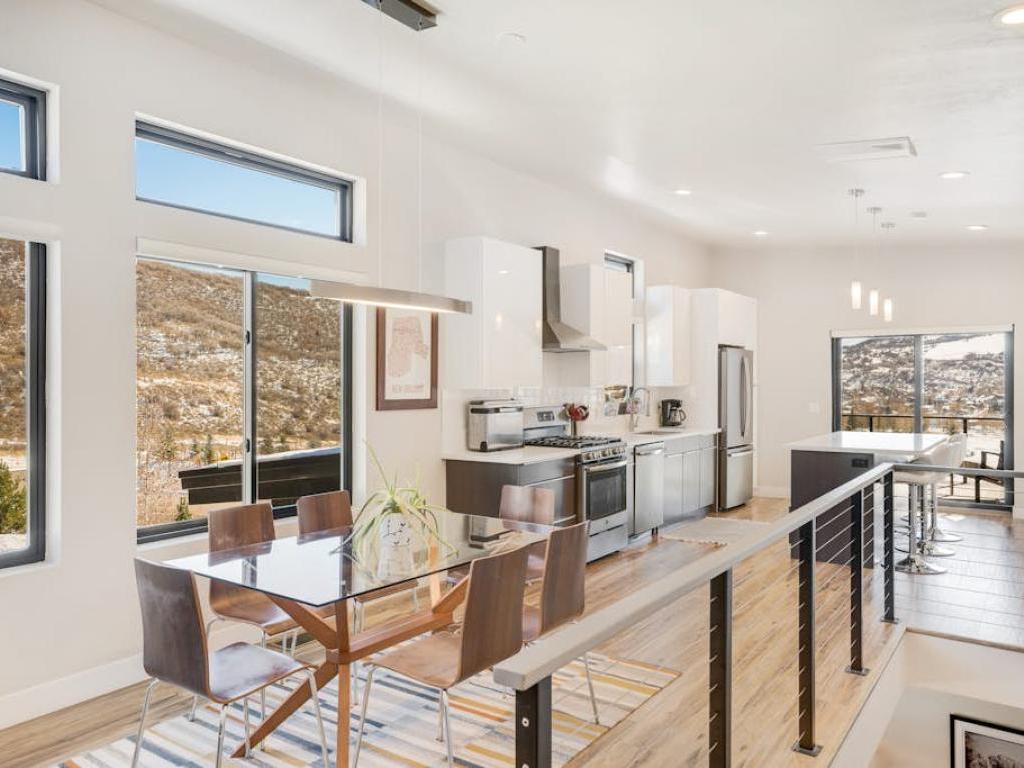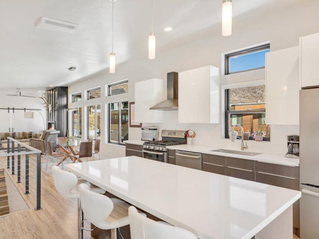 Framed by a gas fireplace and wall-mounted television, the living room in this 4 bedroom, 3 bathroom residence offers comfortable furnishings to relax upon after a day of mountain adventure. Walls of windows create a bright atmosphere in the open main level with a dining table seating 6 located between the living room and kitchen. Providing all of the essential appliances for preparing tasty meals throughout your vacation, the kitchen includes breakfast bar seating for 3 guests and access to the back deck equipped with outdoor seating.