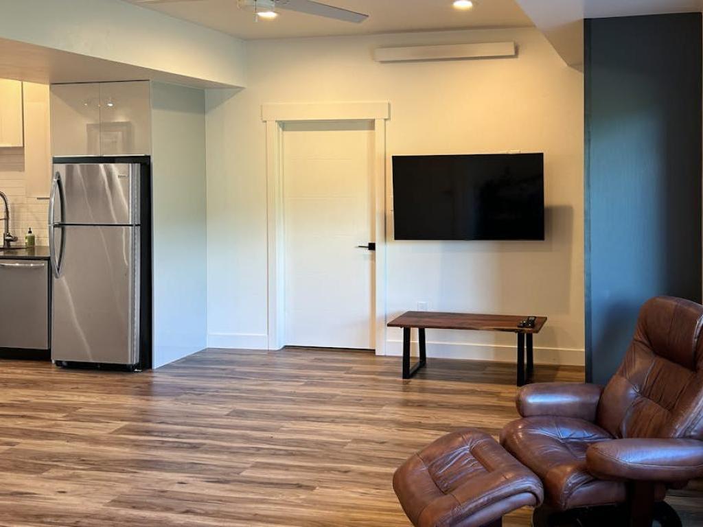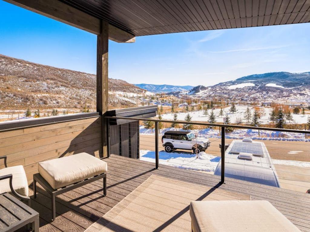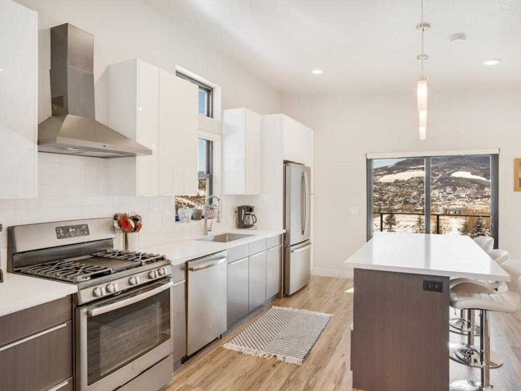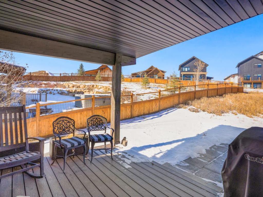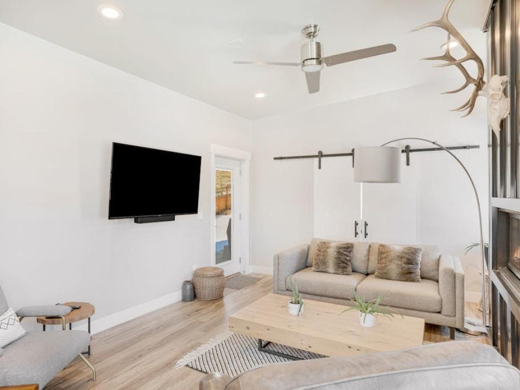 Featuring a comfortably furnished sitting area in front of a wall-mounted television, the lower level family room includes a second full kitchen and full bathroom. Step out of the back deck on the lower level to grill up a meal or relax in the private hot tub while enjoying the breathtaking Rocky Mountain sunset.