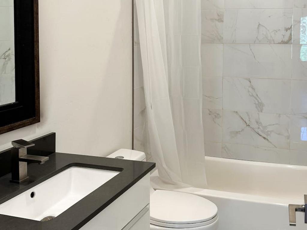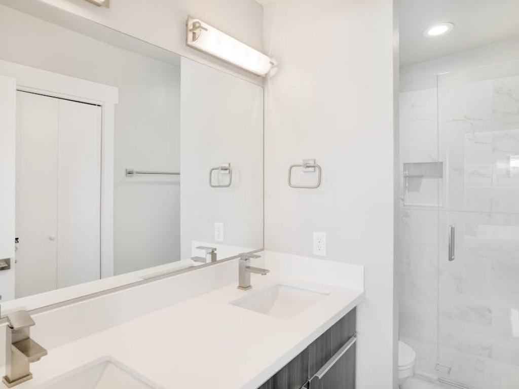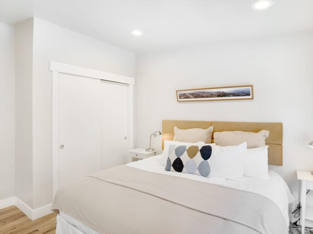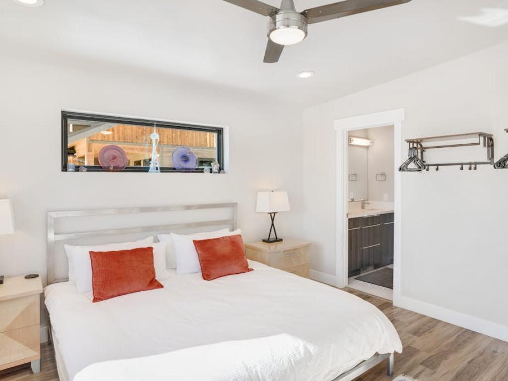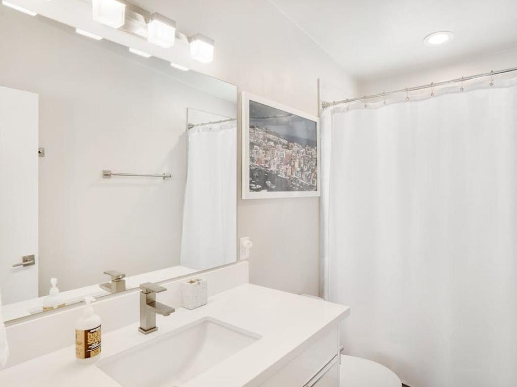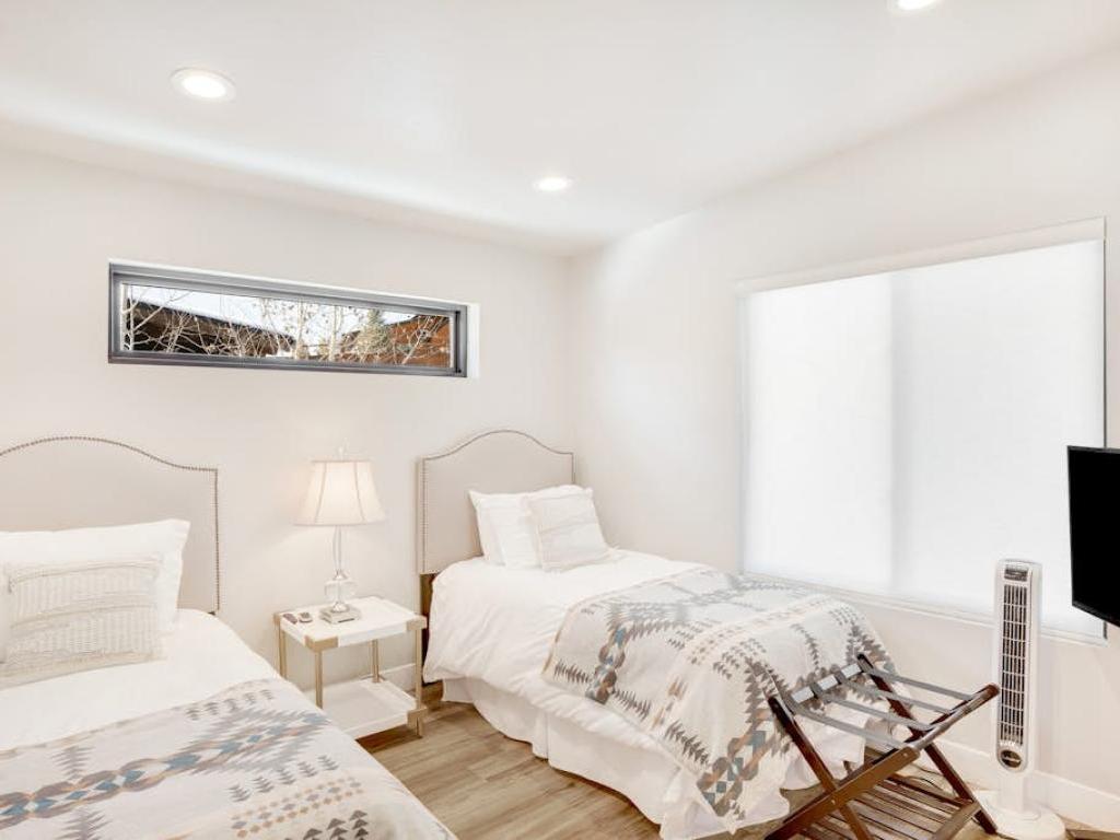 Set off of the kitchen on the main level, the primary bedroom offers a King bed, access to the deck and a private bathroom with a dual-sink vanity and walk-in shower. Two upper level guest bedrooms share a full bathroom, one is furnished with a King bed while the other has two Twin beds. Furnished with a King bed, the lower level guest bedroom shares a full bathroom with the family room.