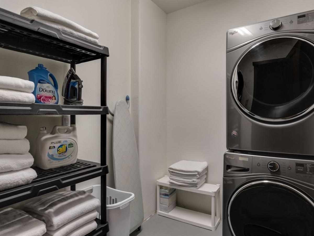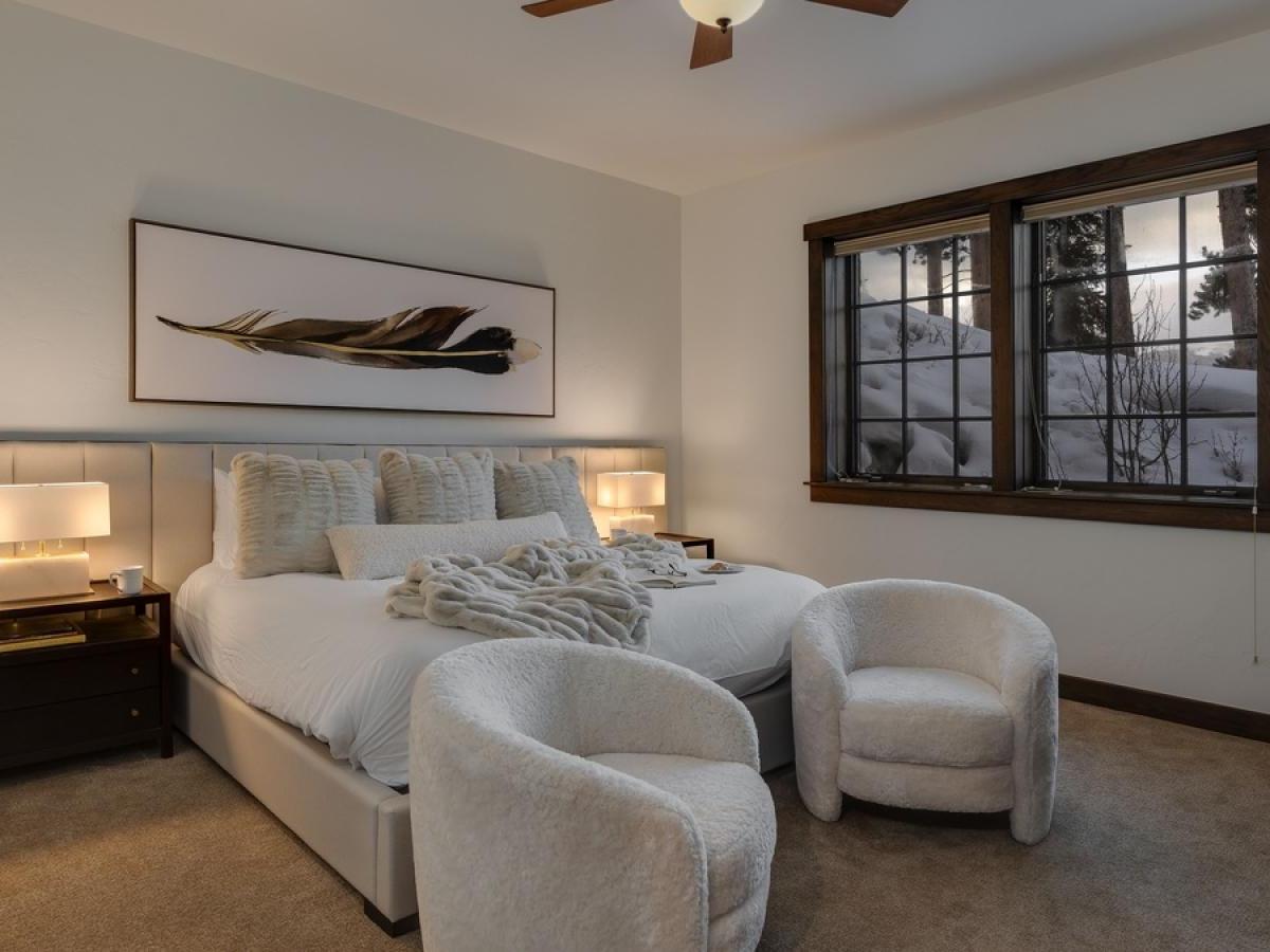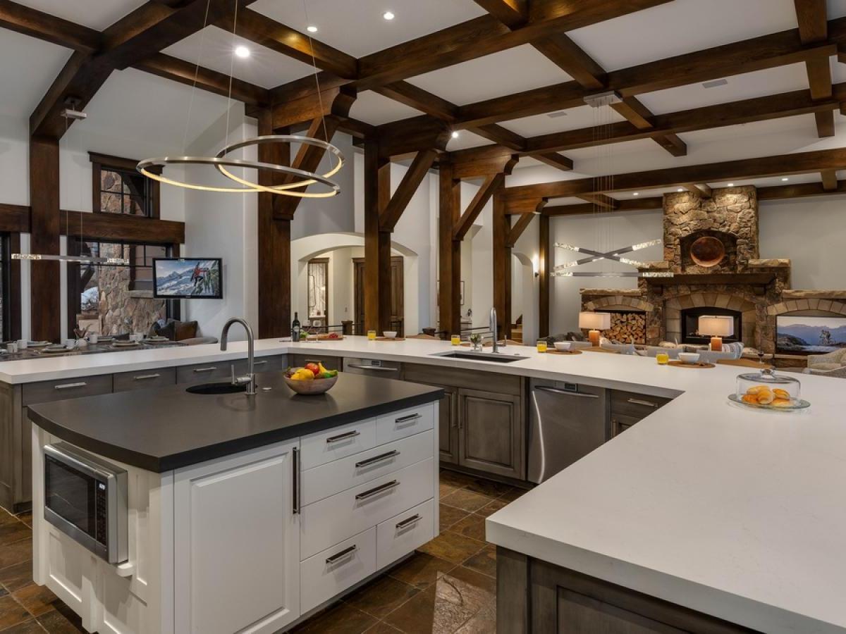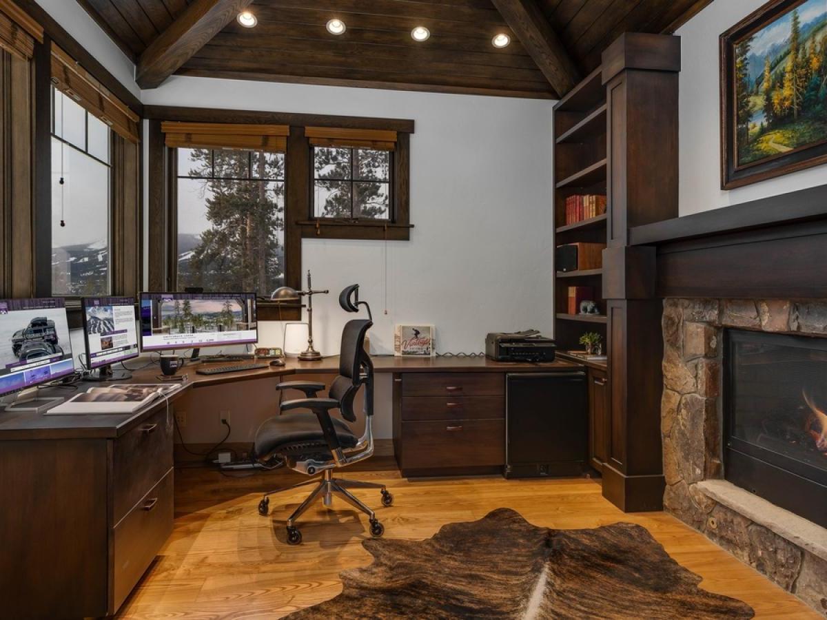 Seating 12 guests, a large dining table sits between the living room and kitchen's U-shaped breakfast bar providing 4 additional seats. Chefs in the group will love the kitchen with its dual sinks, high-end appliances, custom cabinetry, abundant counter space and built-in breakfast nook with seating for 6 guests. For the workhorses in the group, the upper level office, accessed by a private staircase off the living room, offers a well-appointed work area featuring a gas fireplace. Additionally, there are five other workstations around the house with high-speed WIFI, creating the ideal work environment for remote workers.
