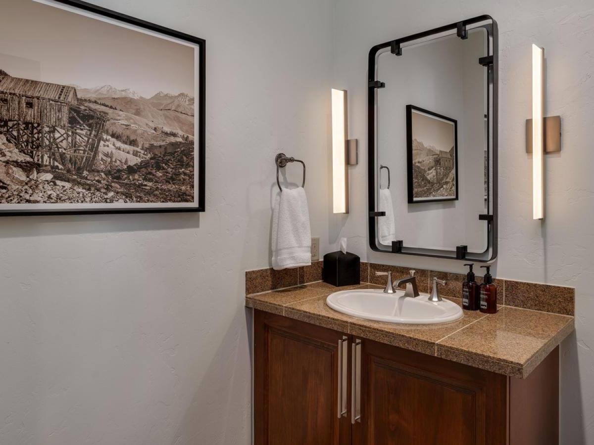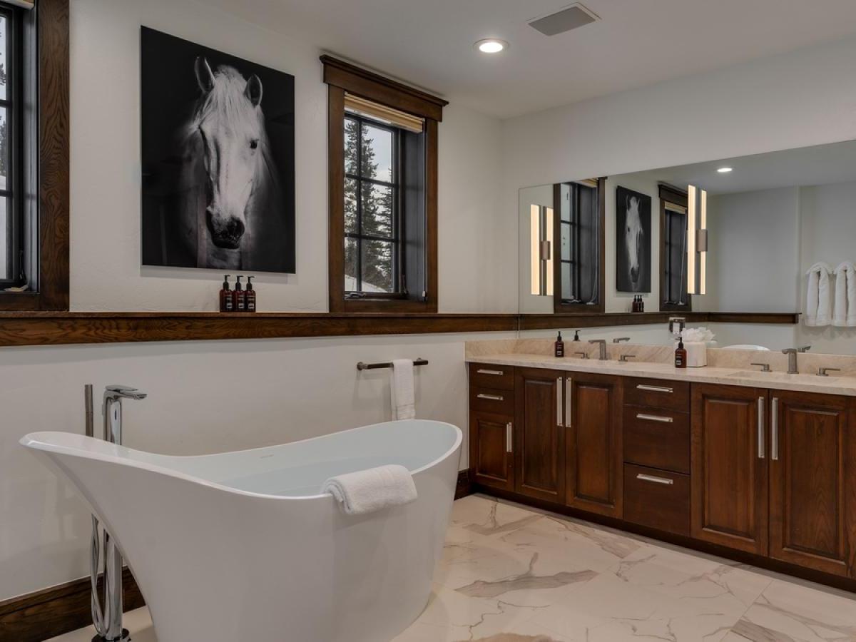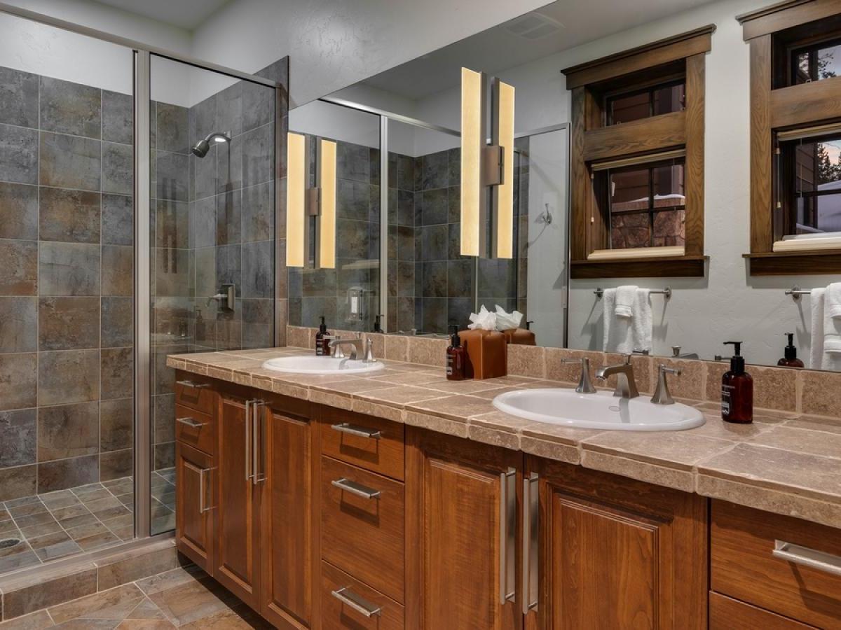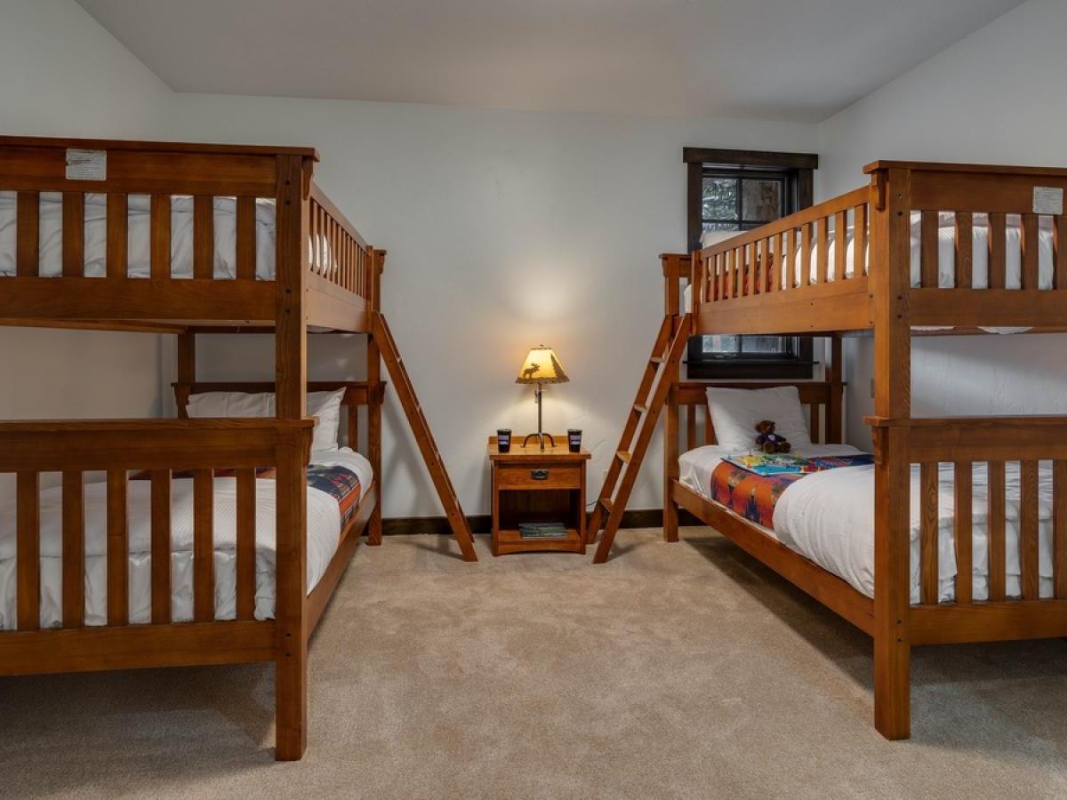 Perched a few steps up from the main level, the primary bedroom is appointed with a King bed, fireplace, walk-in closet and private bathroom with a dual-sink vanity, soaking tub and dual-head, glass-enclosed shower. Furnished with a King bed, the main level guest bedroom enjoys a private bathroom with a dual-sink vanity and walk-in shower. Three lower level bedrooms are all equipped with private bathrooms, one is furnished with a King bed, another offers a Queen bed and the bunk room has two sets of Twin over Twin bunk beds.