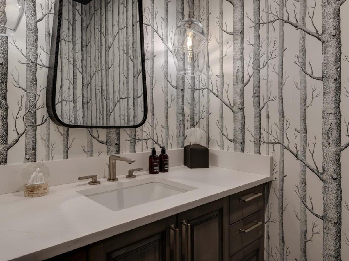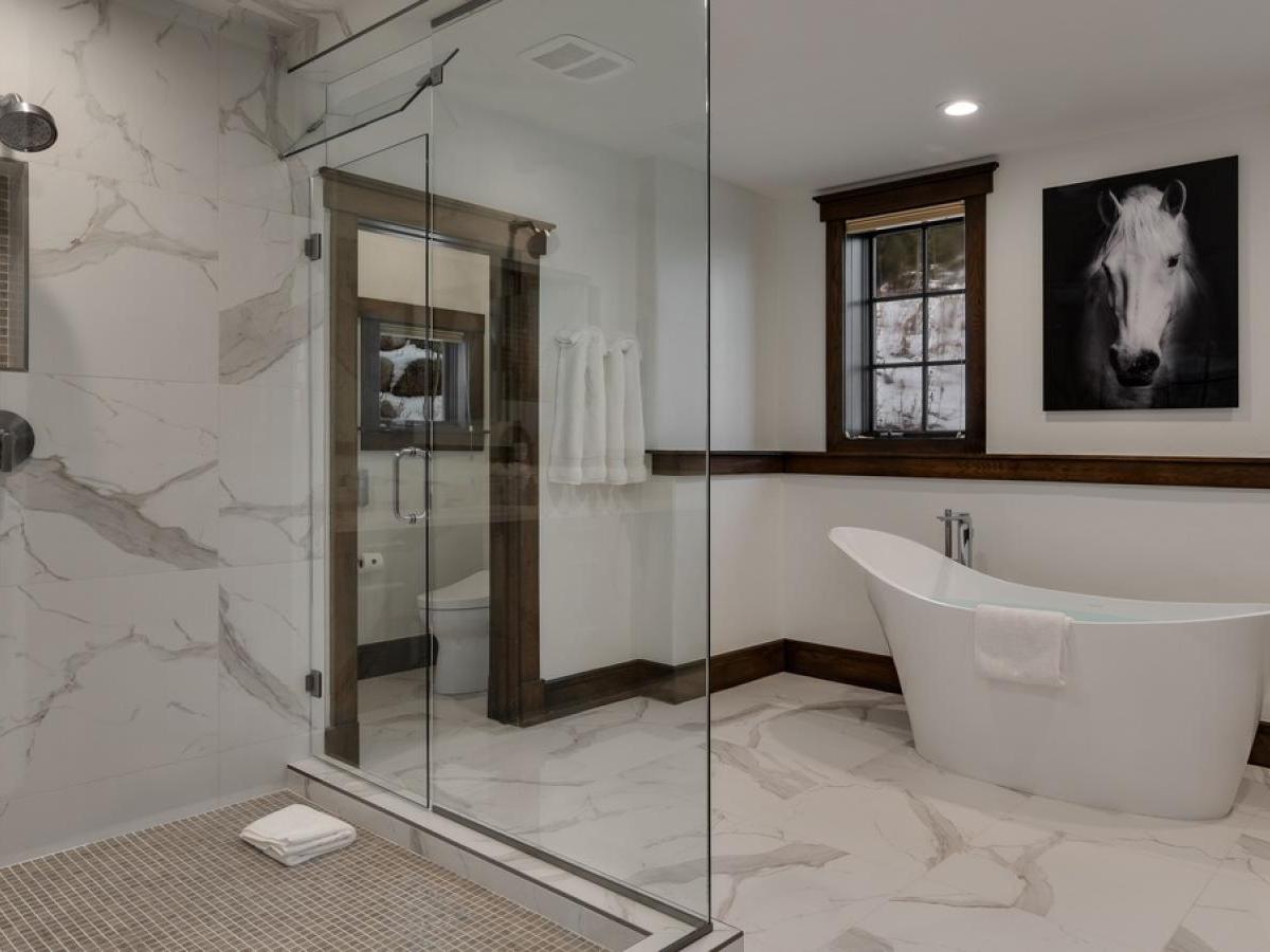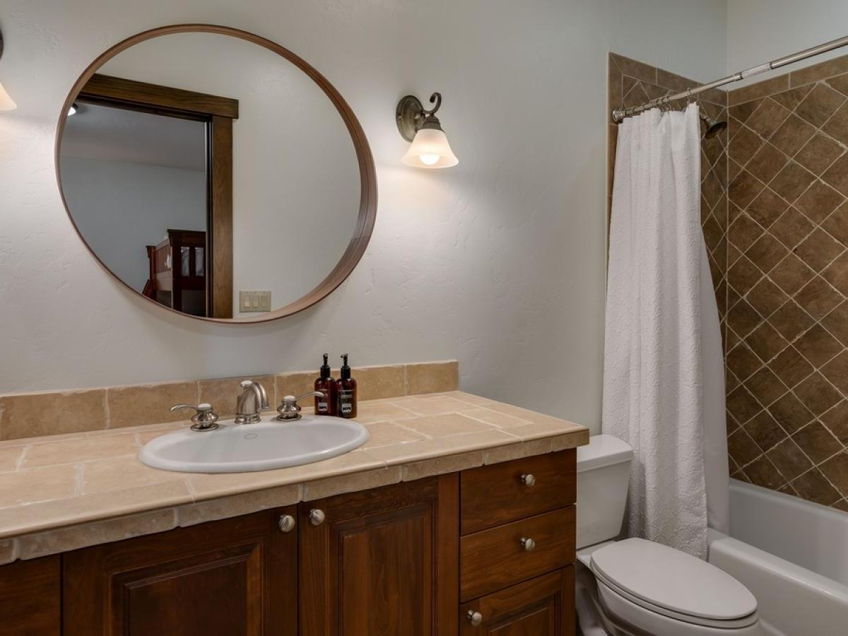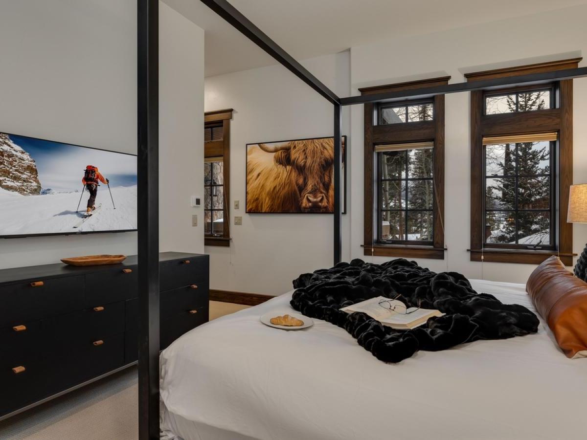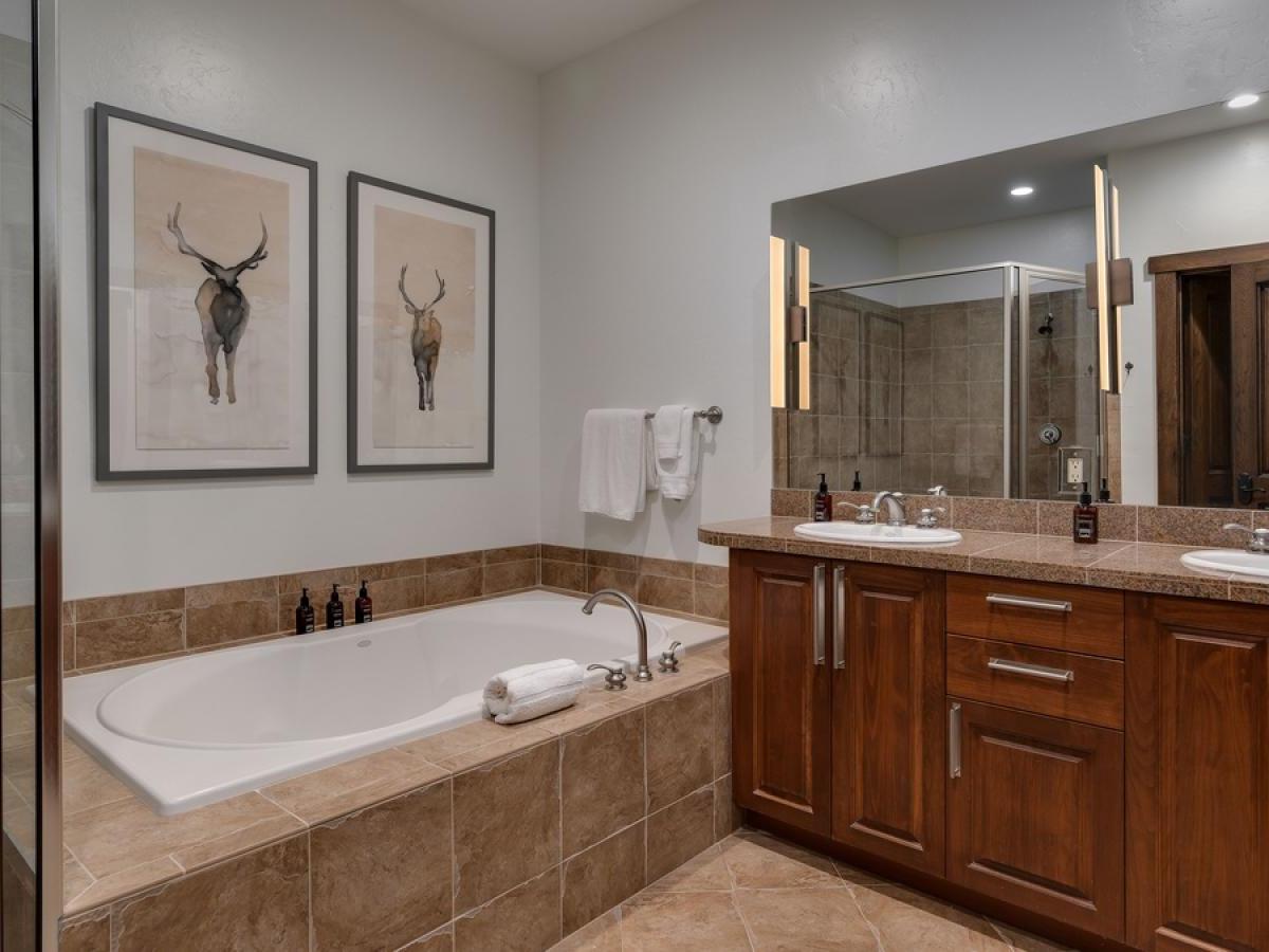 Perched a few steps up from the main level, the primary bedroom is appointed with a King bed, fireplace, walk-in closet and private bathroom with a dual-sink vanity, soaking tub and dual-head, glass-enclosed shower. Furnished with a King bed, the main level guest bedroom enjoys a private bathroom with a dual-sink vanity and walk-in shower. Three lower level bedrooms are all equipped with private bathrooms, one is furnished with a King bed, another offers a Queen bed and the bunk room has two sets of Twin over Twin bunk beds.