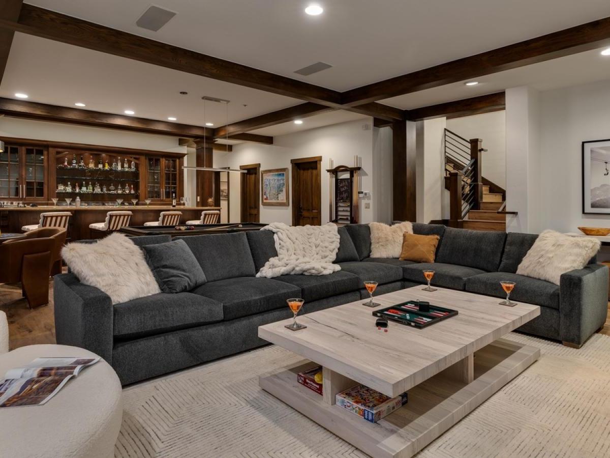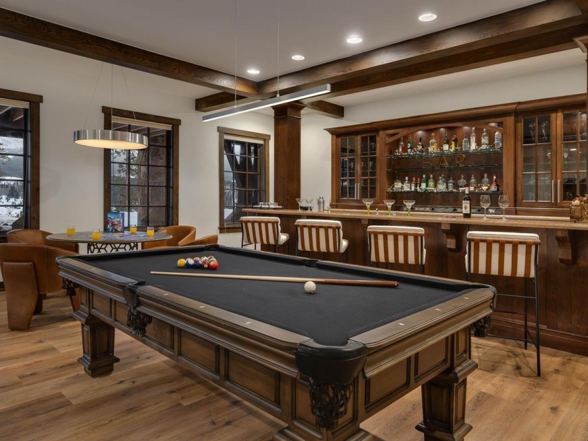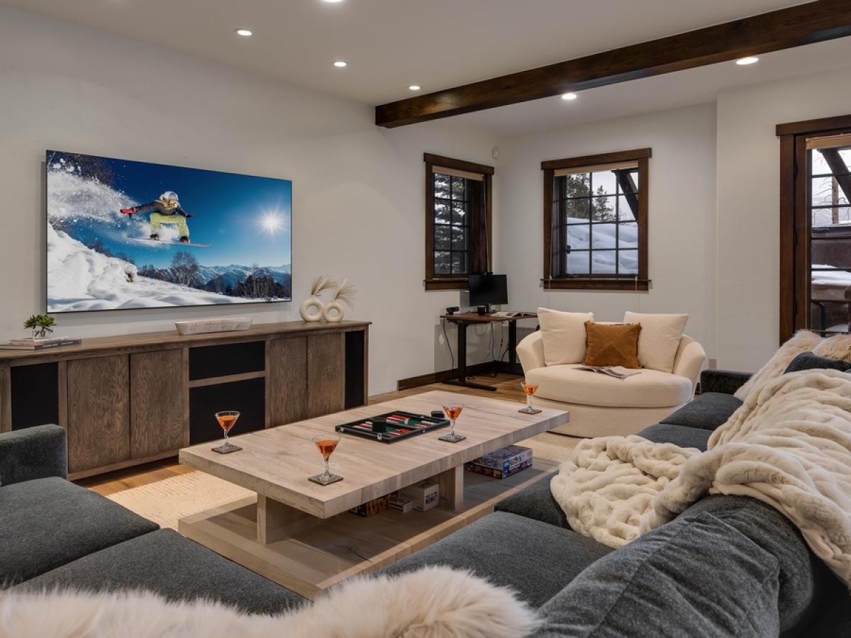 Head to the lower level where you will find a cozy and chic family room with plush couches set in front of an 85-inch TV and home theater system, the perfect place for family movie night or to watch the big game. Try your hand at billiards or cards at the game table and enjoy the convenience of the wet bar with a sink, dishwasher, refrigerator and seating for four. Just outside on the lower patio is a private hot tub, where you can soak weary muscles beneath a starry sky.