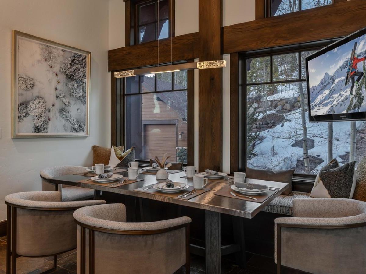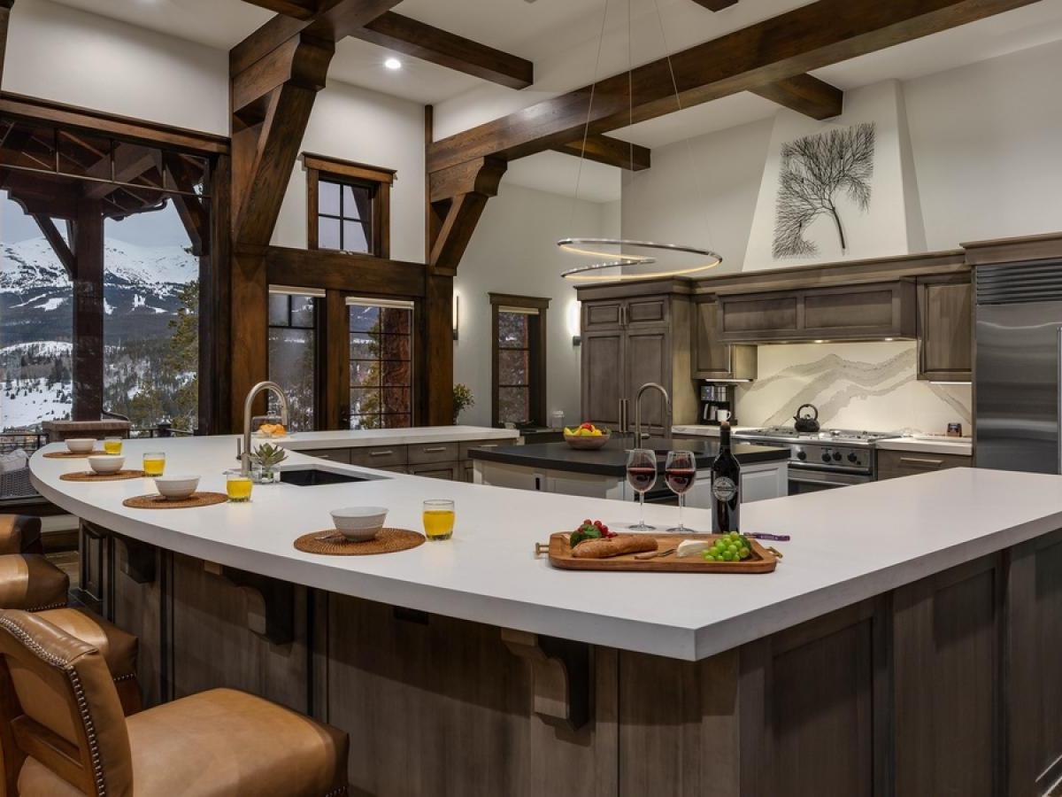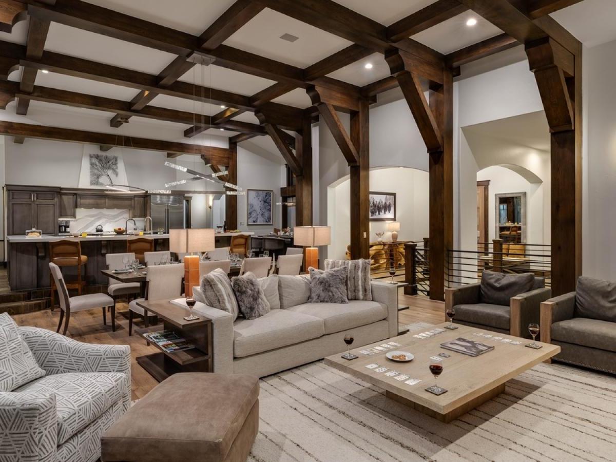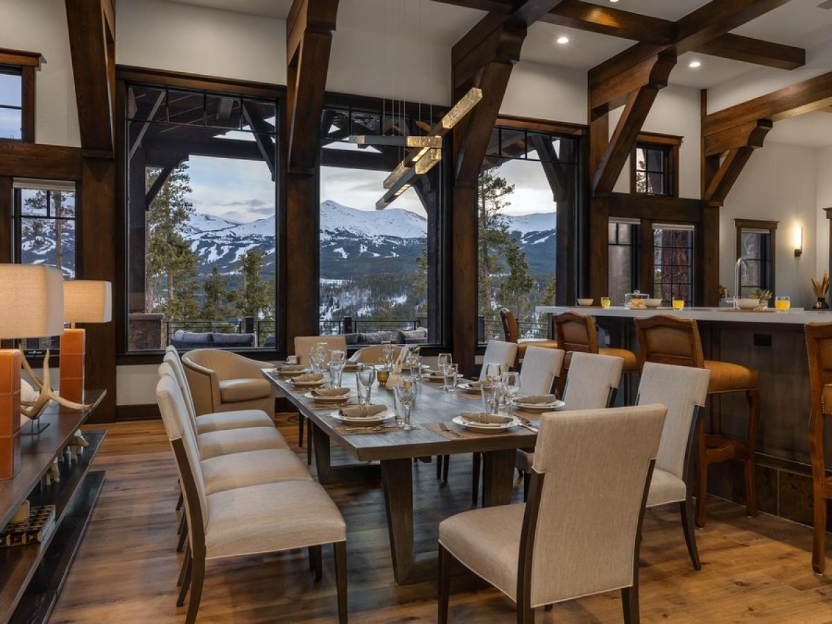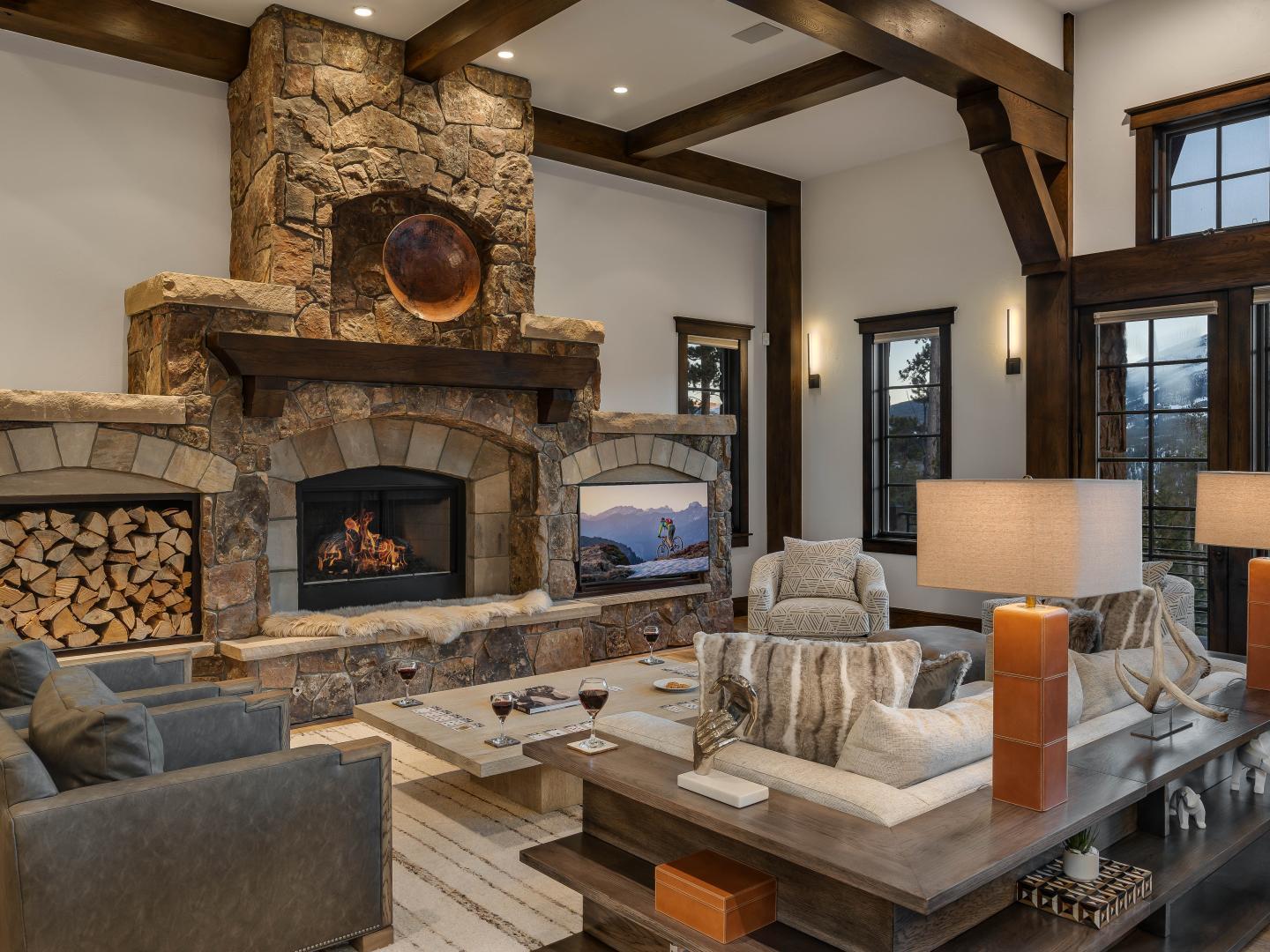 Set under soaring ceilings with intricate exposed beam construction, the expansive Great Room of this 5 bedroom, 5 full and 2 half bathroom private vacation home is reminiscent of a grand mountain lodge. Framed by a wall of windows that bring the breathtaking ski slope views right into the living space, the living room features designer furnishings centered on a spectacular stone fireplace and television. Step out through glass doors in the living room onto the upper level deck where you will enjoy close-up mountain views while relaxing in the outdoor lounge or grilling up a meal on the barbecue.