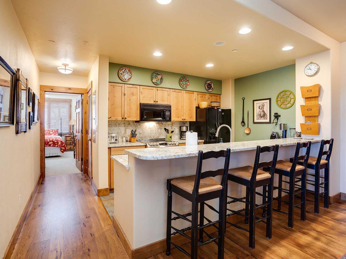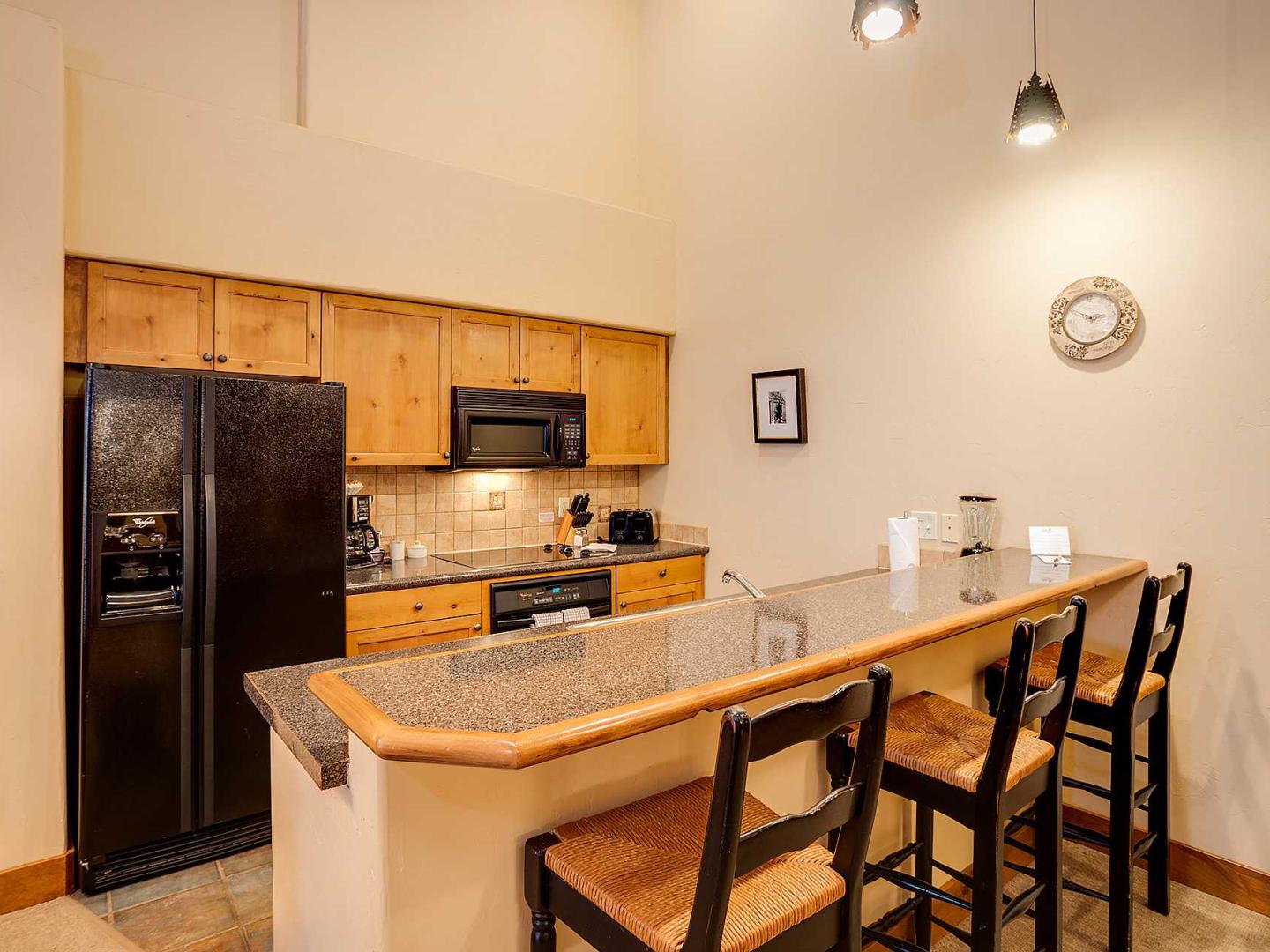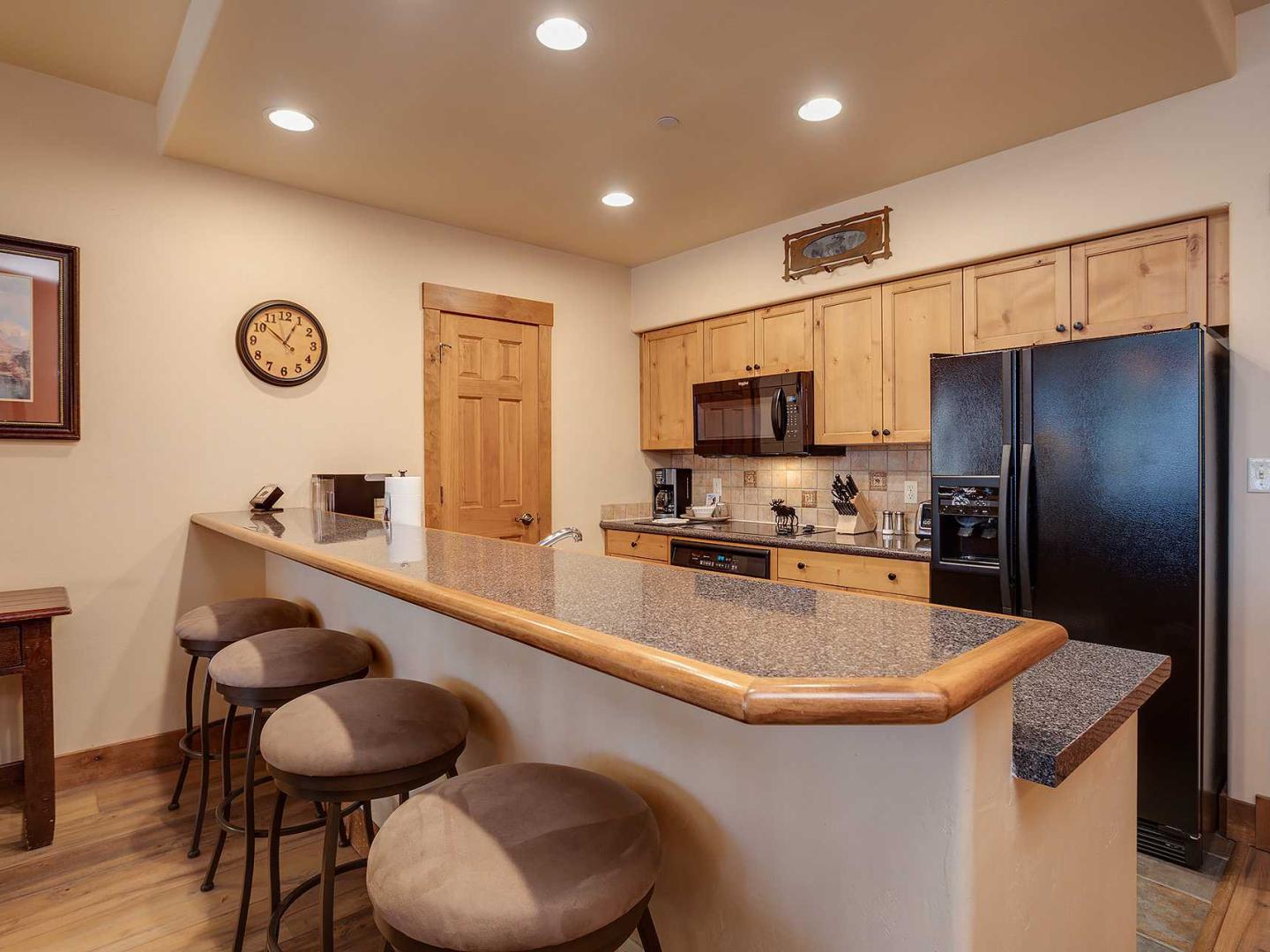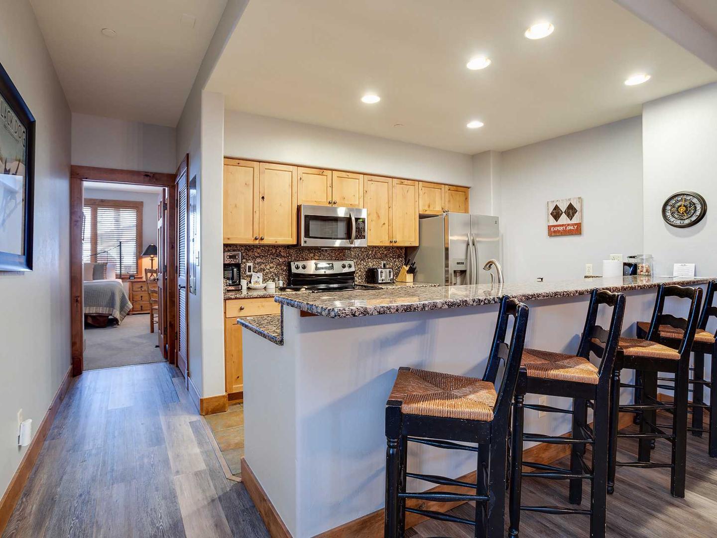 With an elegant mountain decor, these two to four bedroom condominiums provide a comfortable vacation rental for families both small and large. Each Timberline Lodge rental has a fully equipped kitchen with granite counters and custom tile that opens to a comfortably furnished living room with gas fireplace and adjacent private balcony. Other amenities include complimentary in-room high-speed wired Internet, a whirlpool bath, an in-room washer and dryer, private ski-lockers and heated underground parking.
